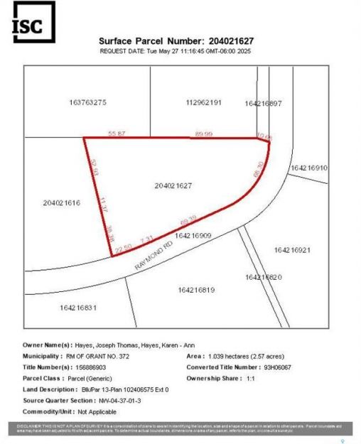 Great Building lot in the Rm of Grant. Build your dream home here. Owner states power and gas are beside the road and water runs under the property. Come and join this great community! This property will not last. Call today.
