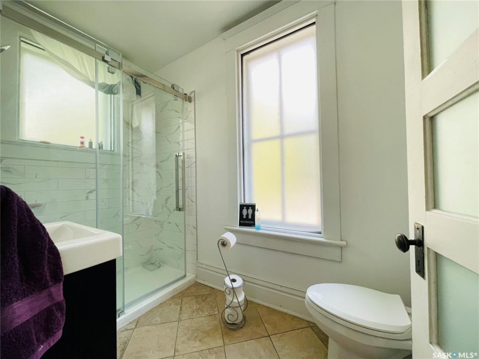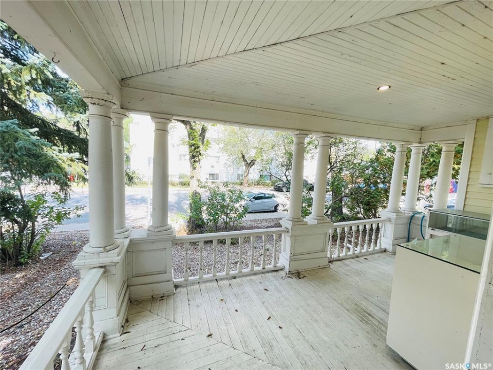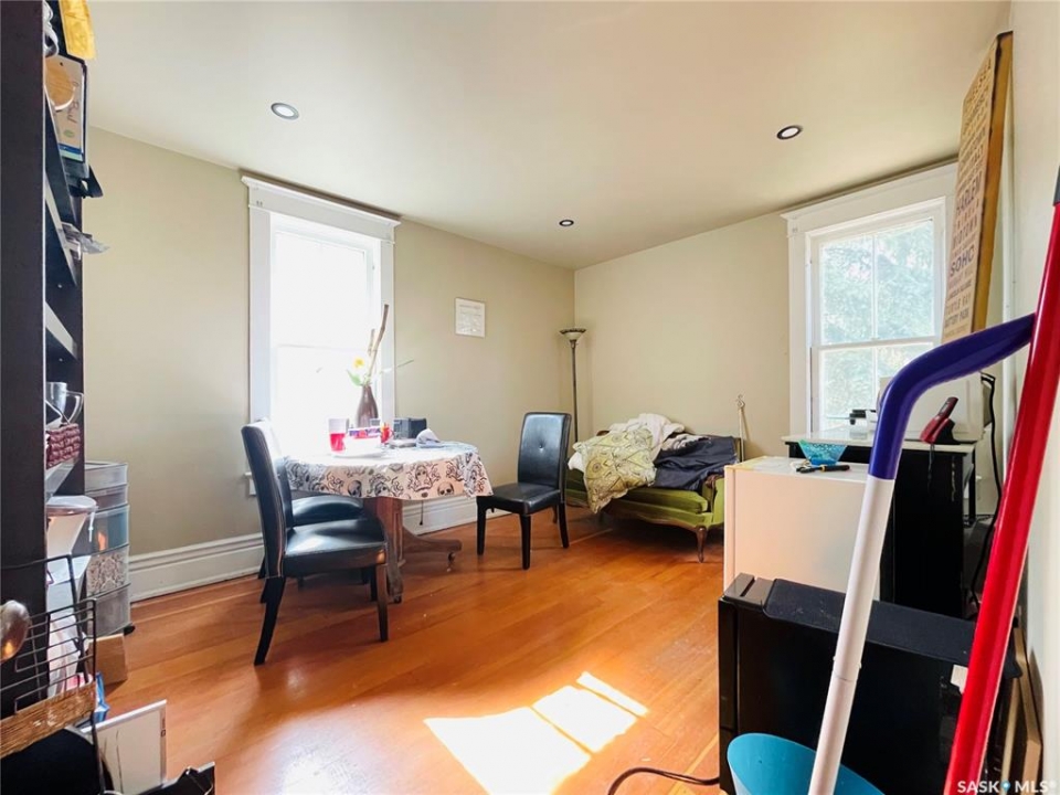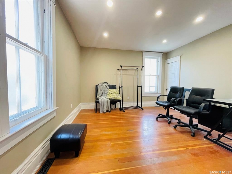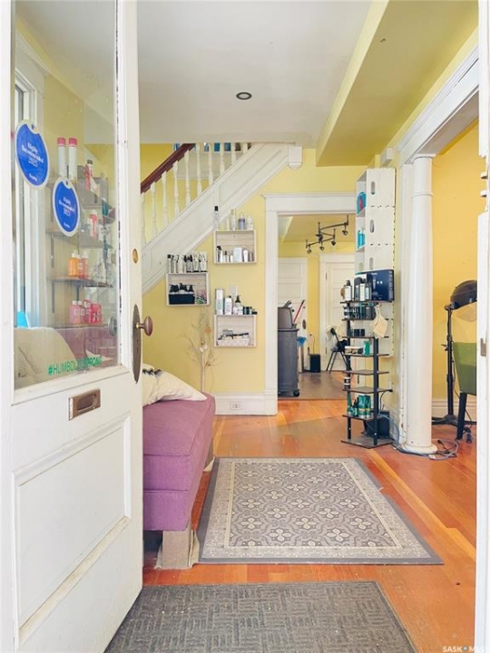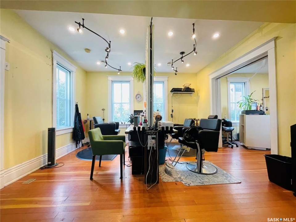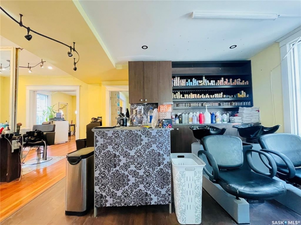 This designated Heritage property located in Transition Area near Downtown Regina and Wascana Park. Currently utilized as a hair salon, the 1,523 square foot, 2 storey home is a fantastic property for a trendy downtown business space. Generous parking at the back as this property sits on apprx 50 ft wide corner lot giving you option to park two rows up to 10 vehicles. Covered front porch provides nice street appeal and highlights the original character. Upon entry you are welcomed into the foyer with original hardwood floors – this space is currently being used as a retail and reception area. Open concept main floor with styling stations, kitchen area that has been turned into a back bar with sinks and a 2 pc power room. 2nd floor has 3 bedrooms currently used as treatment spaces – one with sink and microwave and another with a new shower and sink. Basement houses the laundry area (washer and dryer included) with plenty of storage space, Many updates throughout over the years including: leveling of property, basement spray foam, central air, alarm system, sewer line, electrical wiring, plumbing, support beam added in basement, new windows on the main level, exterior paint scraped and refreshed, all new fireproof insulation and drywall, all new brickwork on outside beams.