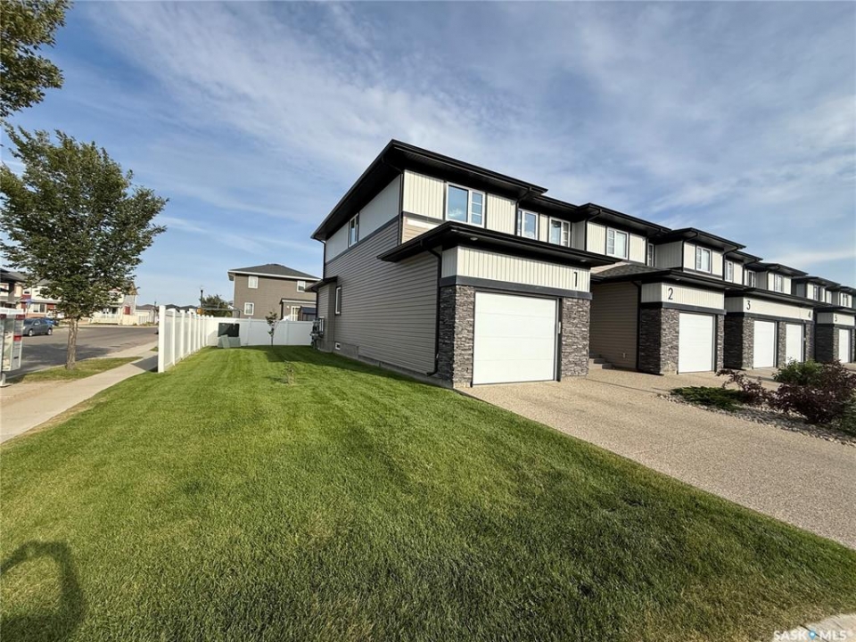 Welcome Home to Harbour Landing Step into this beautifully maintained former show home in the highly desirable Harbour Landing neighbourhood. This two-story end-unit townhouse condo offers both style and comfort, with the added bonus of a corner lot that provides extra side yard space and privacy. Most of the home has been freshly painted and features a bright, open main floor with a modern kitchen, with granite countertops, and gas stove rough in, spacious living room, and cozy electric fireplace complete with convenient built-in AV tubing for your TV. A main floor bathroom adds everyday functionality. Upstairs, you'll find three generously sized bedrooms and a full bathroom. The primary suite is your personal retreat, complete with its own ensuite and plenty of storage space. The basement is open for development, ready to be customized to your needs, while the drywalled, heated and finished garage adds both value and convenience. Outside, enjoy your mornings and evenings on the full deck with a view of the park directly across the street – the perfect spot for relaxation or entertaining. With parks, walking paths, and all of Harbour Landing's amenities nearby, this home truly combines comfort, convenience, and community.