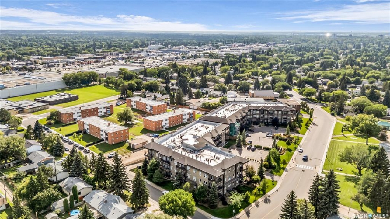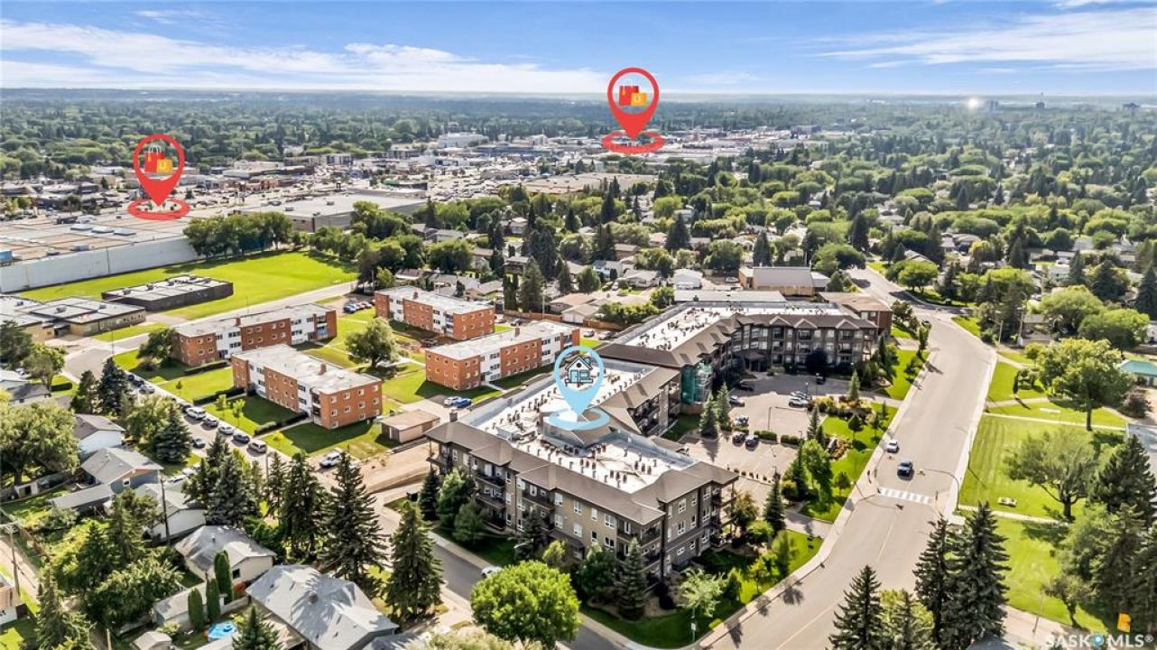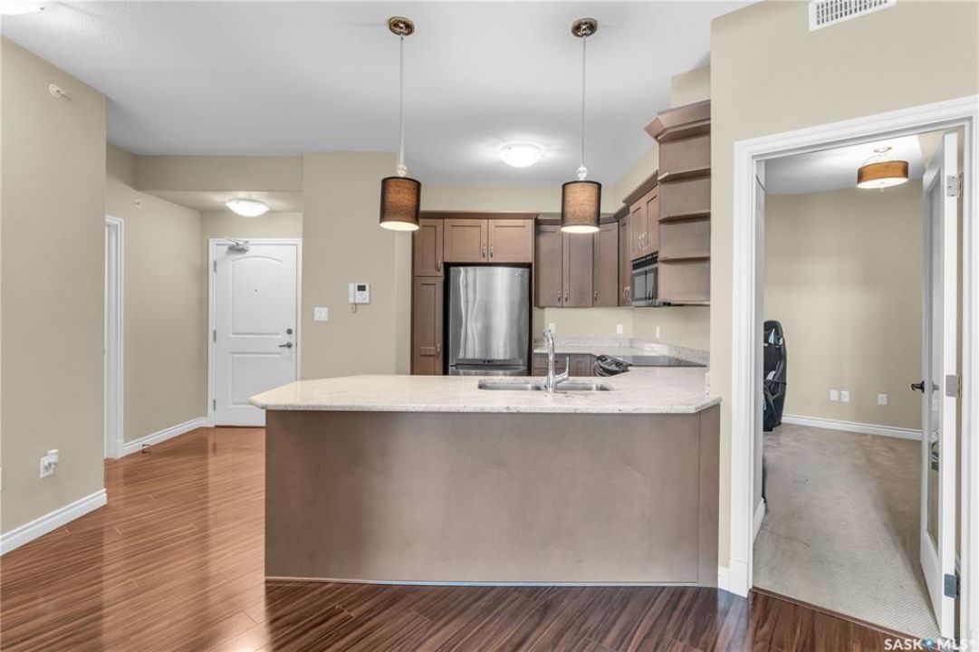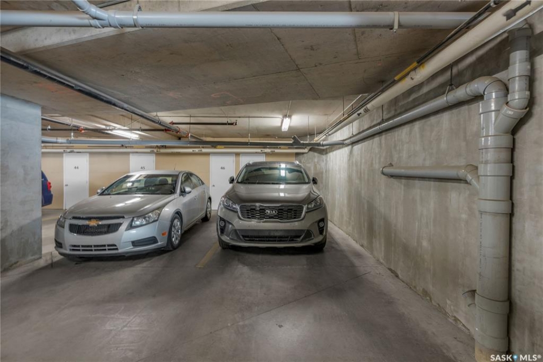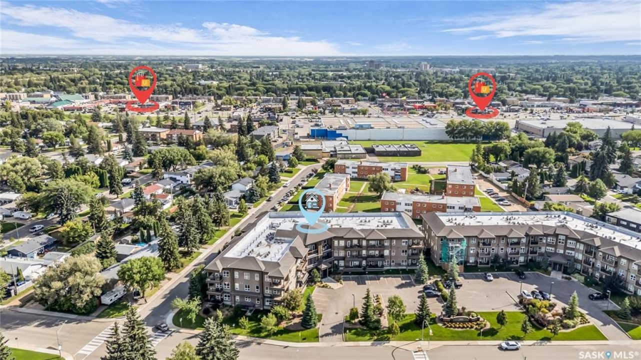 Top-Floor Loft Condo in Greystone Heights – 2 Underground Parking Stalls Welcome to 301-2730 Main Street, a spacious top-floor unit located in the heart of Greystone Heights. Offering 1,543 sq. ft. of well-planned living space, this unique condo features a rare loft-style layout, two underground parking stalls (Stalls 45 & 47) and storage unit (47) ( —a true gem in this sought-after community. The main floor welcomes you with a bright and functional kitchen, complete with granite countertops, peninsula seating, and included appliances: fridge, stove, dishwasher, and over-the-range microwave. The open-concept dining and living area boasts northwest-facing window and a garden door leading to a private balcony—perfect for enjoying summer evenings. A den with a glass-insert door provides the ideal space for a home office or hobby room. Also on the main floor is a generous second bedroom, a 4-piece bathroom, and a laundry/storage room with washer and dryer included. Upstairs, the primary suite offers a unique open-to-below layout overlooking the living space, plus a 3-piece ensuite and a cozy sitting or office area—perfect for work-from-home or quiet reading space. Located just steps from Greystone School and park, with easy access to 8th Street, the University, College Drive, and Circle Drive, this home offers the perfect blend of comfort, convenience, and style.