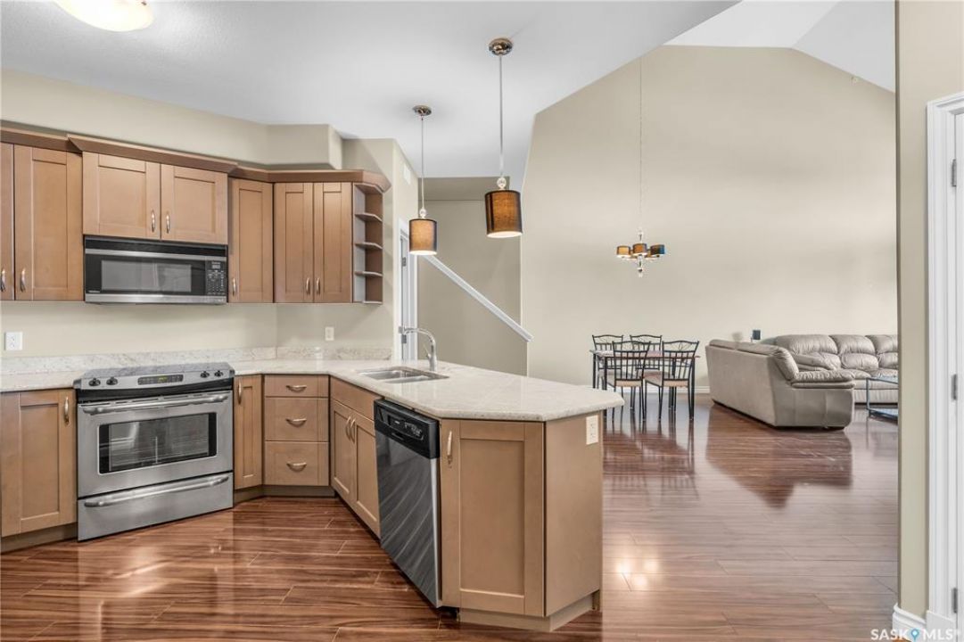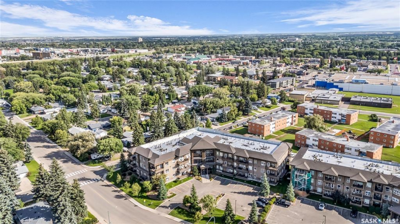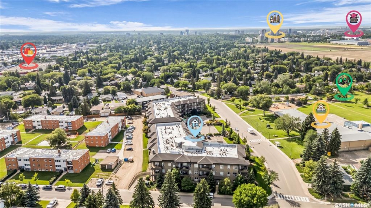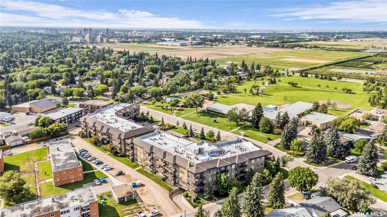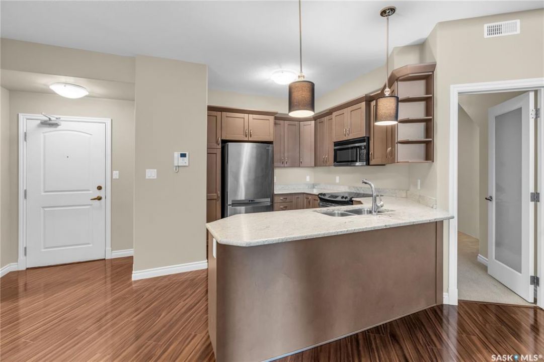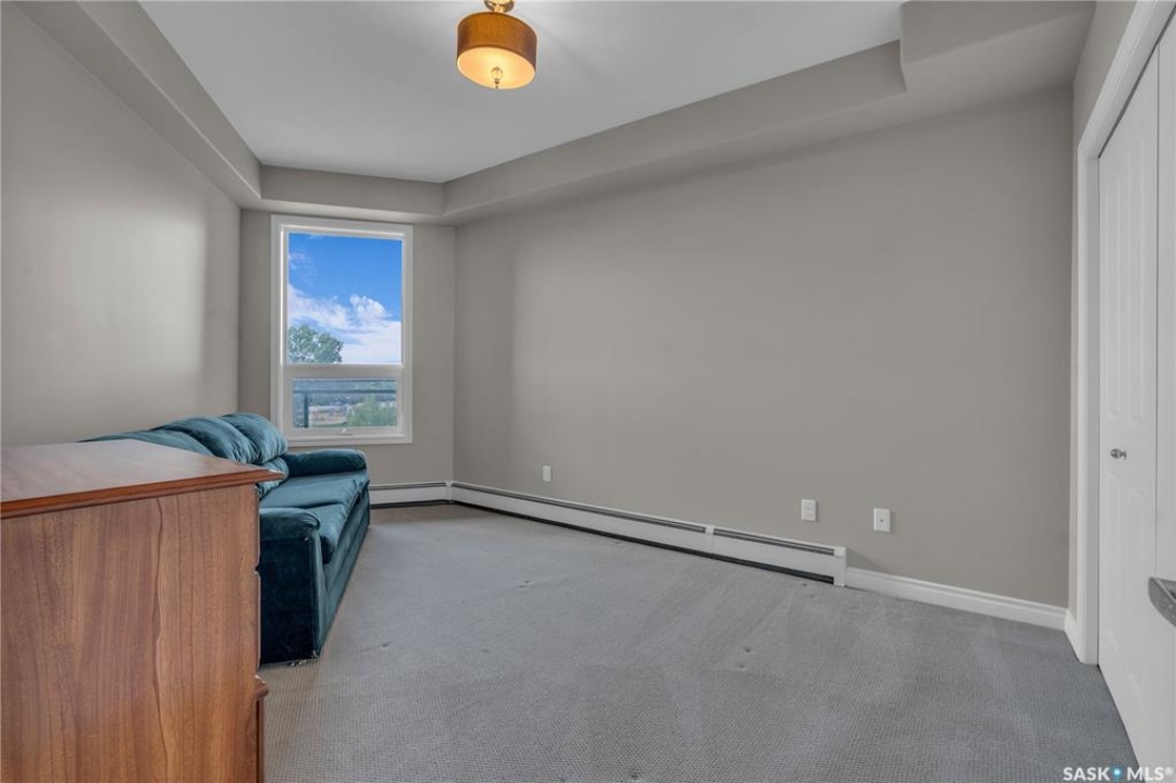 Top-Floor Loft Condo in Greystone Heights – 2 Underground Parking Stalls Welcome to 301-2730 Main Street, a spacious top-floor unit located in the heart of Greystone Heights. Offering 1,543 sq. ft. of well-planned living space, this unique condo features a rare loft-style layout, two underground parking stalls (Stalls 45 & 47) and storage unit (47) ( —a true gem in this sought-after community. The main floor welcomes you with a bright and functional kitchen, complete with granite countertops, peninsula seating, and included appliances: fridge, stove, dishwasher, and over-the-range microwave. The open-concept dining and living area boasts northwest-facing window and a garden door leading to a private balcony—perfect for enjoying summer evenings. A den with a glass-insert door provides the ideal space for a home office or hobby room. Also on the main floor is a generous second bedroom, a 4-piece bathroom, and a laundry/storage room with washer and dryer included. Upstairs, the primary suite offers a unique open-to-below layout overlooking the living space, plus a 3-piece ensuite and a cozy sitting or office area—perfect for work-from-home or quiet reading space. Located just steps from Greystone School and park, with easy access to 8th Street, the University, College Drive, and Circle Drive, this home offers the perfect blend of comfort, convenience, and style.