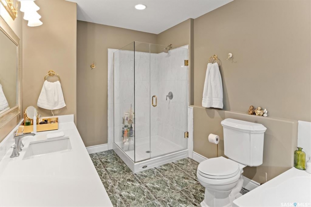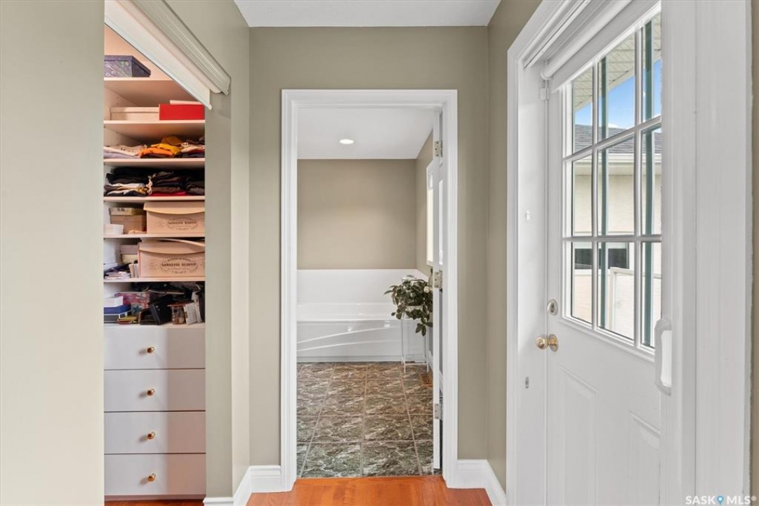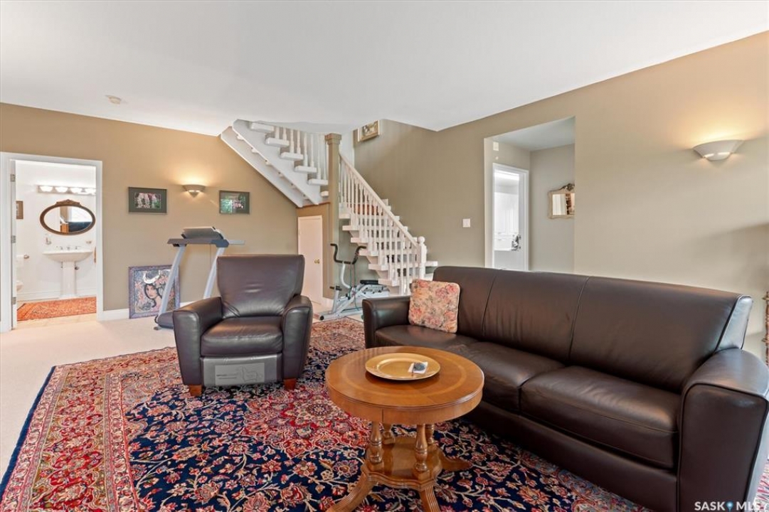 Thoughtfully designed home situated on 10 acres of gently rolling hills. Everything was considered in the design of this sophisticated home, from the southern exposure which takes advantage of the view to the well thought out floor plan. Located only 5 minutes from Saskatoon with pavement almost all the way, this captivating property offers everything you could desire. City water, natural gas, walk out from lower lever and large spacious rooms. Every detail in this home has been considered. Oak hardwood flooring on main level, chef's kitchen with center island and built in appliances. Formal dining room, large master bedroom with en-suite and walk in closet. The lower level is completely developed with family room, 2 large bedrooms, den, utility room plus ample storage. An addition, this home offers both a wood burning fireplace in the living room and a gas fireplace in the lower level family room.