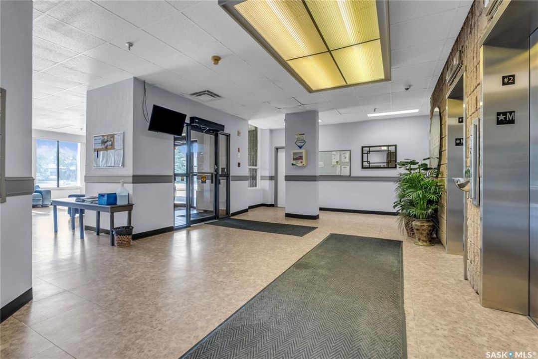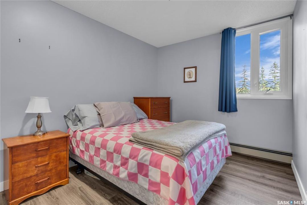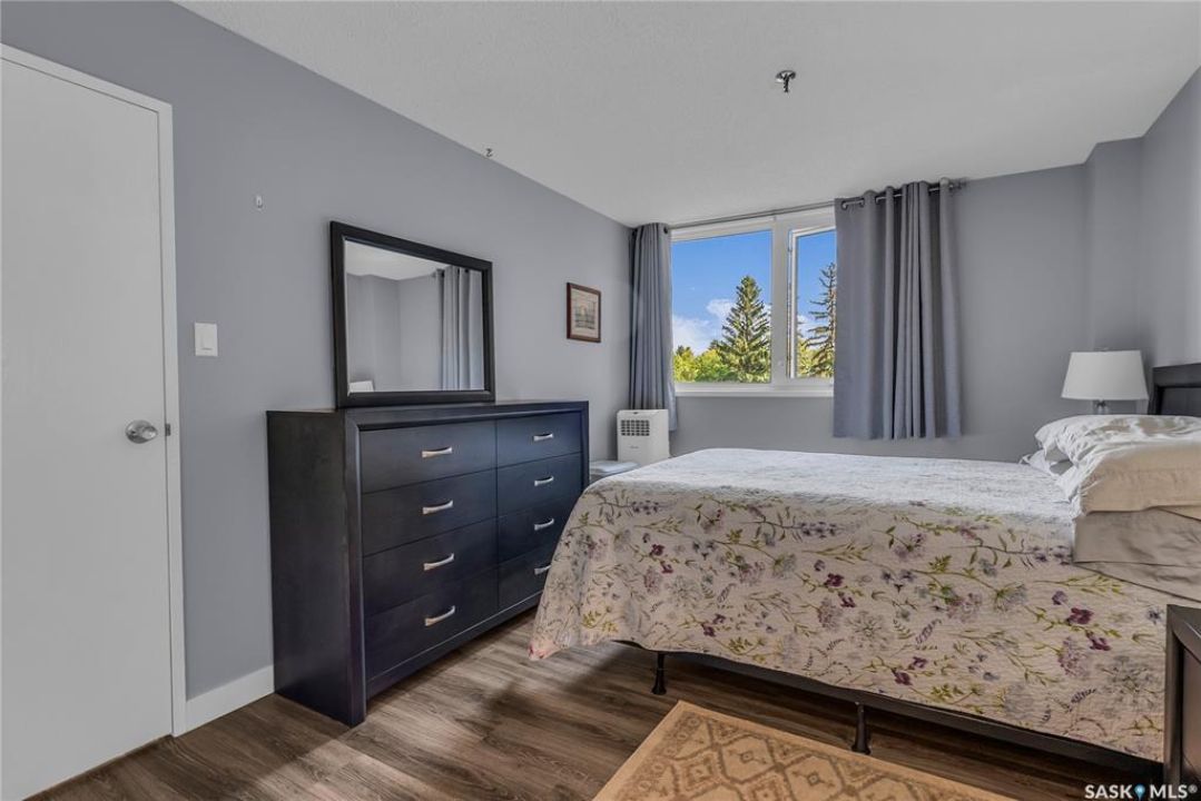 Excellent location, only one block from the Meewasin Walking Trail and Riverbank. East-facing 1132 sq FT, Two bedrooms, 2 Bathrooms, Main Floor Laundry. This unit features a lot of recent upgrades. Light Galley Kitchen Cabinets, with Maytag stainless steel appliances, Hall Pantry, Neutral Painted throughout, durable Laminate Flooring, Newer Patio doors to Balcony with a clear View of your Parking Stall 40. Air conditioner replaced, Newer washer/dryer. Newer vanities in Bathrooms, comfort toilets. Large master bedroom with Double closets. The Complex offers a Hot Tub, Saltwater Pool, Double elevators & More!