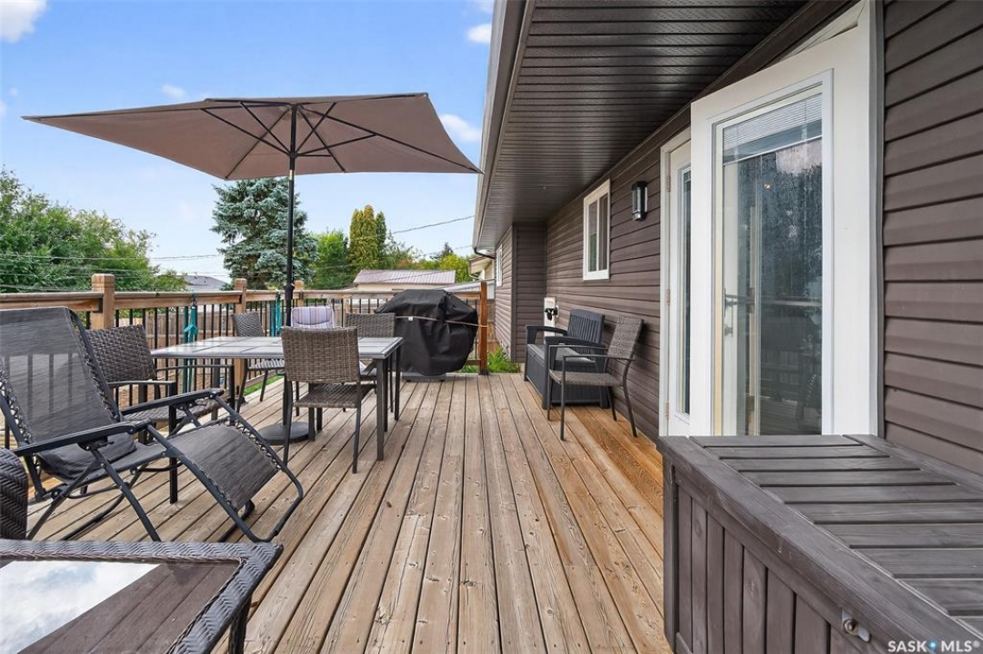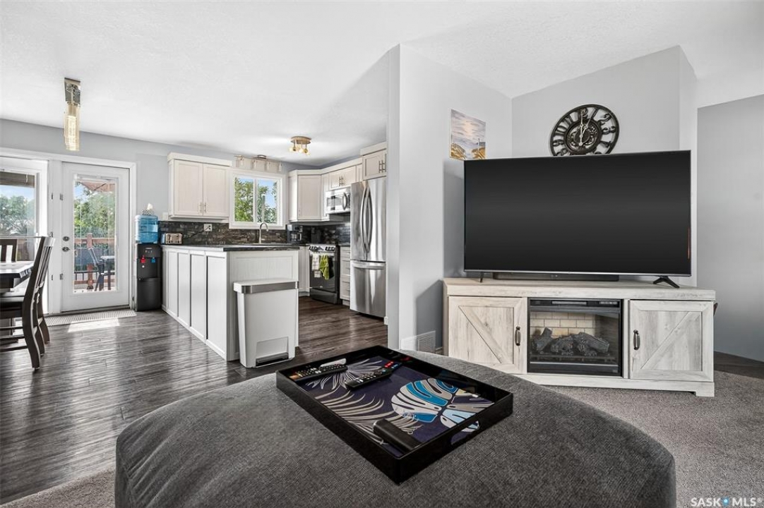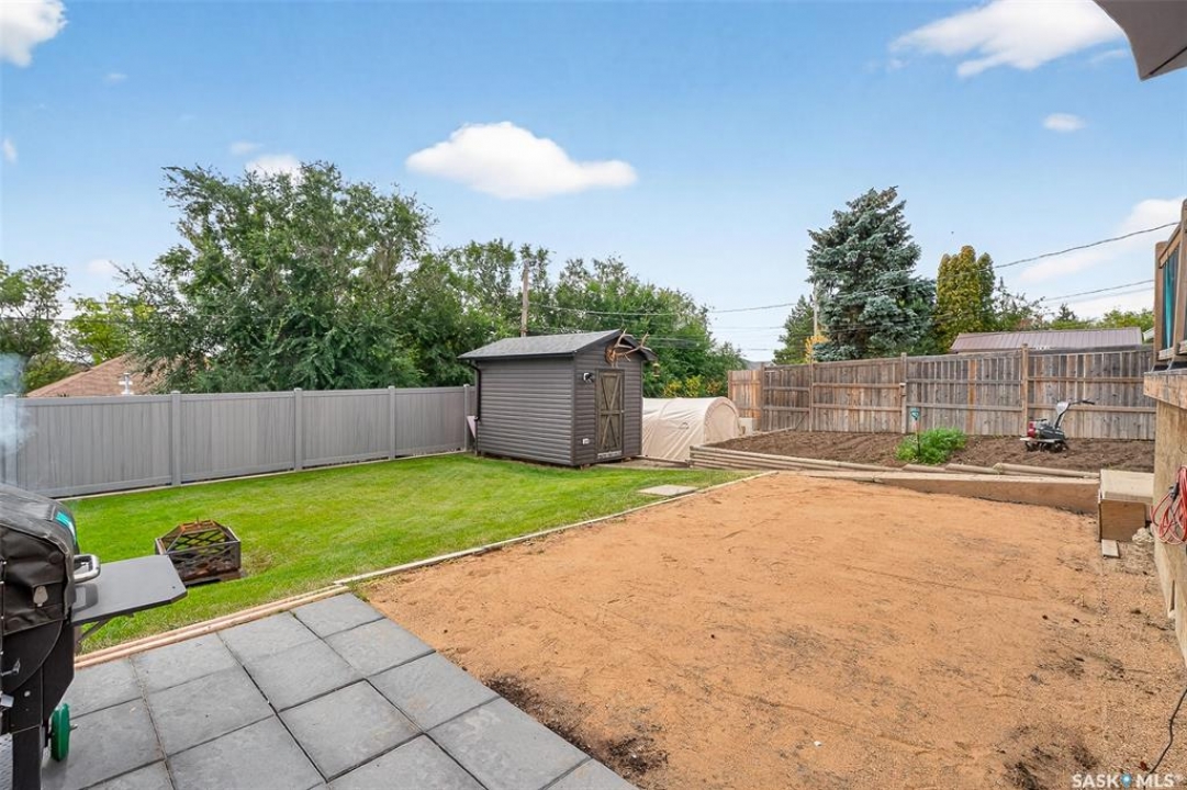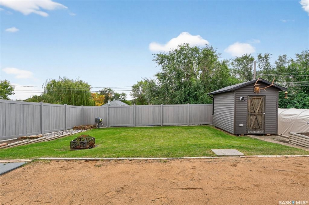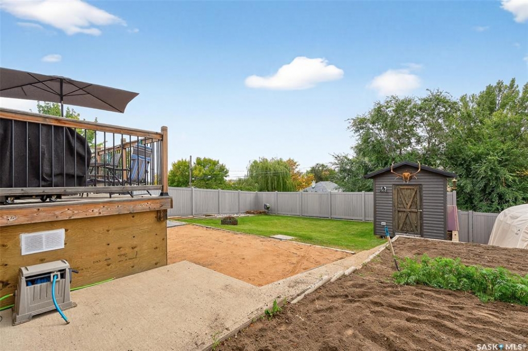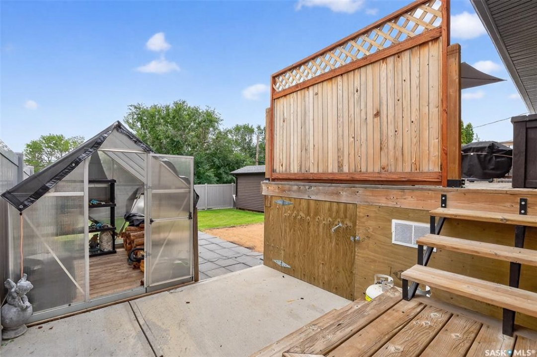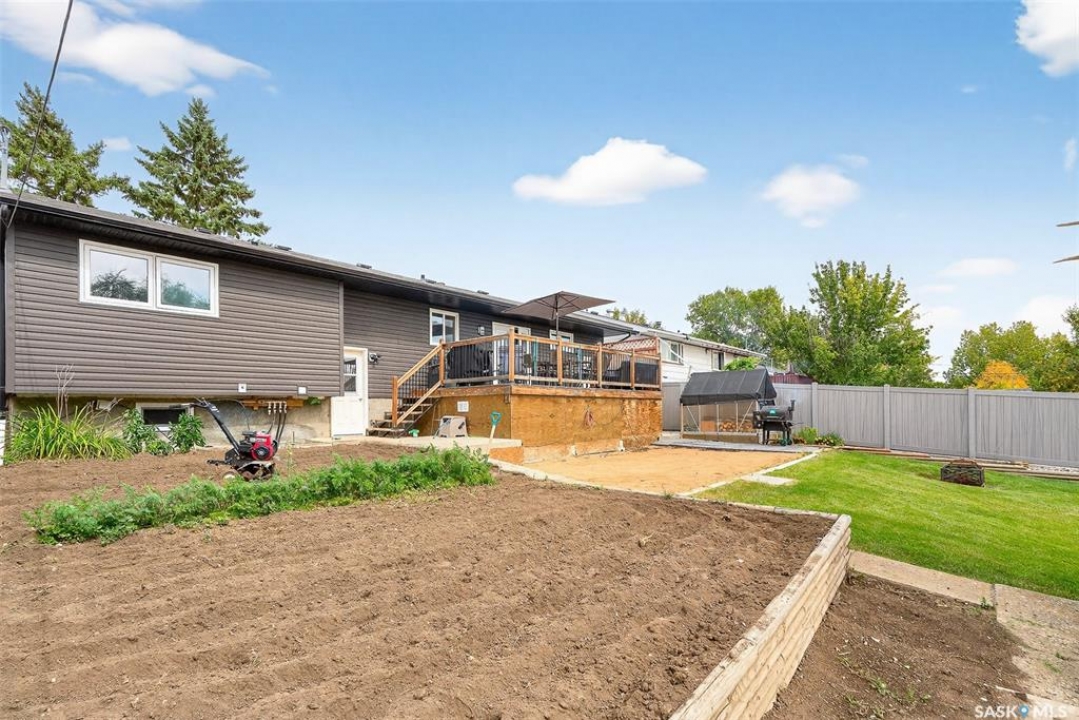 Beautifully Renovated Family Home with Garden & Outdoor Living Spaces located in the Palliser area of Moose Jaw. Welcome to this spacious and beautifully updated family home, perfectly designed for comfort and entertaining. This property offers the ideal blend of modern updates and family-friendly charm. Step inside to a bright, open living area with comfortable carpeting & plenty of natural light. The renovated kitchen & dining space features stunning Hanover cabinets, a long island with an abundant of pot & pan drawers, tile backsplash, & stainless steel appliances including a blt-in dishwasher & micro range. Patio doors open to a deck overlooking the garden, greenhouse, fire pit area, perfect for gatherings. Under-deck storage, along with a portable garage for added convenience. The main floor boasts generous bedrooms, including a spacious primary suite with double closets. The main bathroom offers a double vanity with glass tile backsplash & extra storage closet. The basement provides a family room featuring a wood-burning fireplace, and two extra bedrooms, (window may not meet egress). There's also a laundry/utility area with washer, dryer, & deep freezer included, plus a room roughed in for a future bathroom. The home is equipped with many modern upgrades including new 200-amp electrical service, high-efficient furnace and water heater (owned and NEW), updated shingles and plywood, newer siding, soffit, facia, & eaves. The paved double driveway & single attached insulated garage and 100-amp service. Additional features include: • PVC windows throughout • Brand new driveway • Greenhouse • Fire pit area & sand base ready for a pool • Central Air • Ring doorbell and updated lighting of Ring system for exterior This property truly offers everything a growing family could want. With its extensive renovations, outdoor lifestyle features, and thoughtful details, it's move-in ready & waiting for you to call it home!