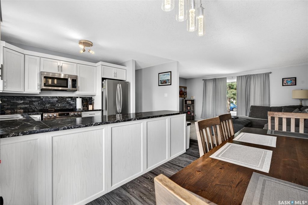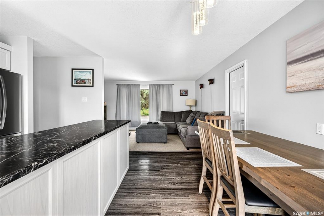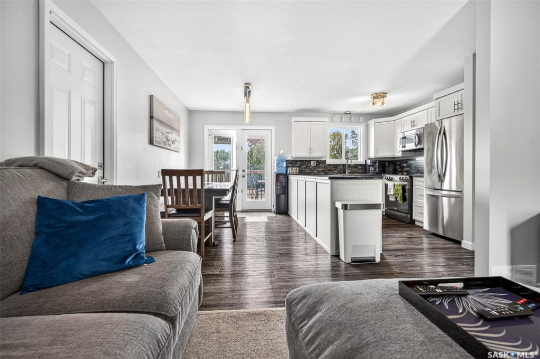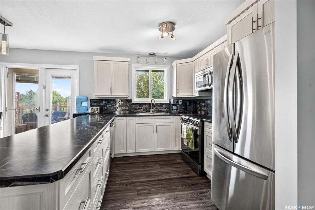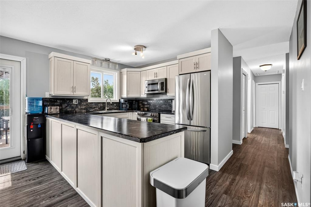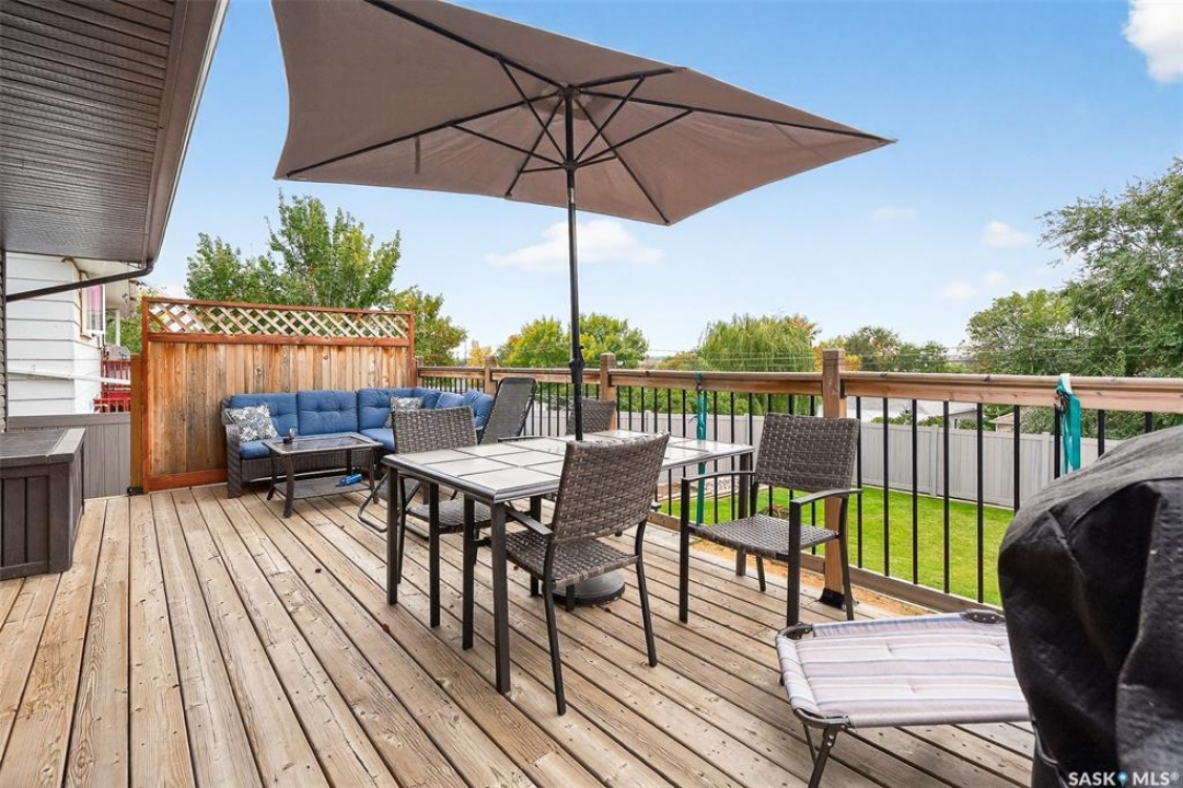 Beautifully Renovated Family Home with Garden & Outdoor Living Spaces located in the Palliser area of Moose Jaw. Welcome to this spacious and beautifully updated family home, perfectly designed for comfort and entertaining. This property offers the ideal blend of modern updates and family-friendly charm. Step inside to a bright, open living area with comfortable carpeting & plenty of natural light. The renovated kitchen & dining space features stunning Hanover cabinets, a long island with an abundant of pot & pan drawers, tile backsplash, & stainless steel appliances including a blt-in dishwasher & micro range. Patio doors open to a deck overlooking the garden, greenhouse, fire pit area, perfect for gatherings. Under-deck storage, along with a portable garage for added convenience. The main floor boasts generous bedrooms, including a spacious primary suite with double closets. The main bathroom offers a double vanity with glass tile backsplash & extra storage closet. The basement provides a family room featuring a wood-burning fireplace, and two extra bedrooms, (window may not meet egress). There's also a laundry/utility area with washer, dryer, & deep freezer included, plus a room roughed in for a future bathroom. The home is equipped with many modern upgrades including new 200-amp electrical service, high-efficient furnace and water heater (owned and NEW), updated shingles and plywood, newer siding, soffit, facia, & eaves. The paved double driveway & single attached insulated garage and 100-amp service. Additional features include: • PVC windows throughout • Brand new driveway • Greenhouse • Fire pit area & sand base ready for a pool • Central Air • Ring doorbell and updated lighting of Ring system for exterior This property truly offers everything a growing family could want. With its extensive renovations, outdoor lifestyle features, and thoughtful details, it's move-in ready & waiting for you to call it home!