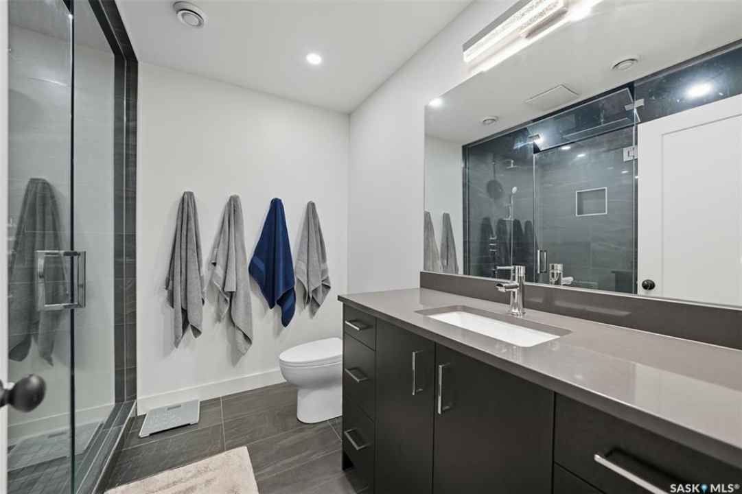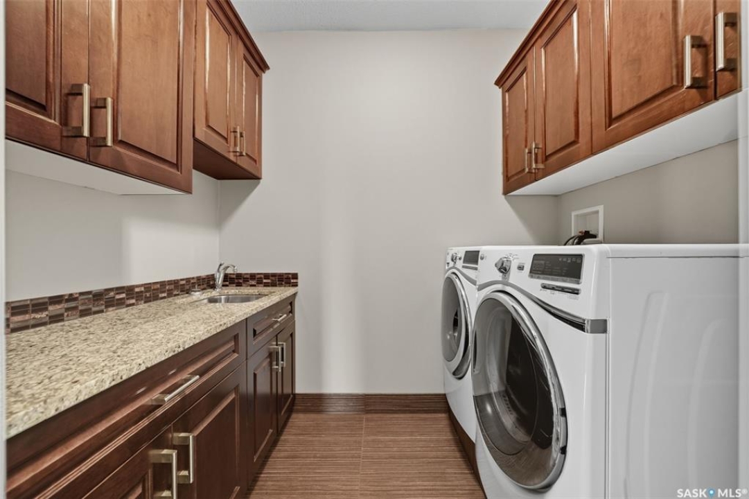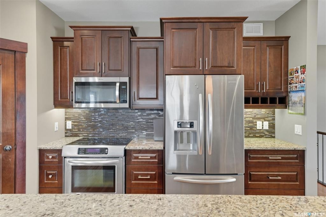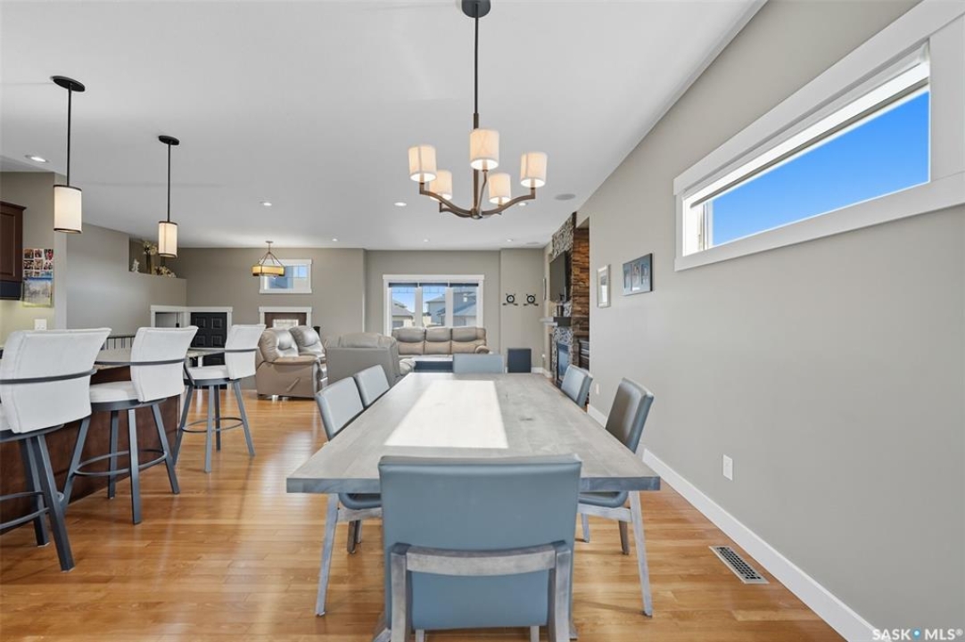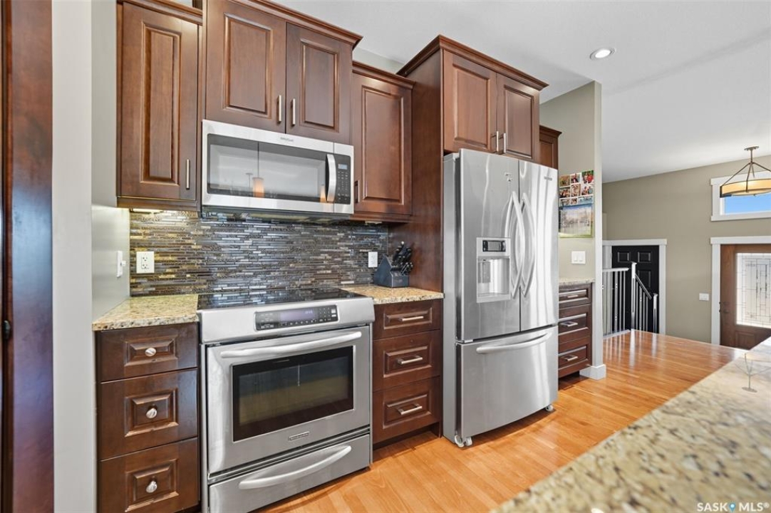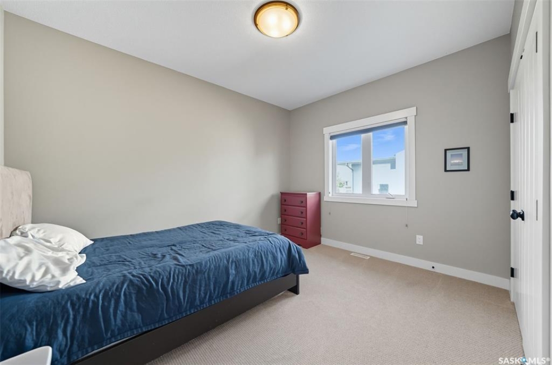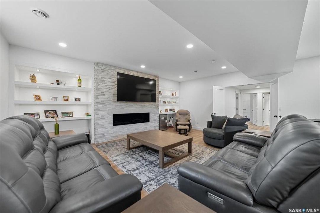 Nestled in the heart of Rosewood, this executive bungalow offers a perfect balance of comfort, functionality, and upscale finishes, backing southwest onto walking trails and greenspace. With an expansive open layout, five spacious bedrooms (3 up, 2 down) and three bathrooms, the home is ideal for family living and entertaining. The main floor showcases hardwood and tile flooring with carpet in the bedrooms, a living room with feature gas fireplace and built-in speakers, and a gourmet kitchen with granite countertops, tile backsplash, under-cabinet lighting, soft-close cabinetry with full-extension drawers, and stainless steel appliances. A walk-in closet off the foyer adds everyday convenience. The primary suite is a true retreat, complete with blackout blinds, a large walk-in closet, and a spa-inspired five-piece ensuite with in-floor heat, jetted tub, dual sinks, tiled shower with glass door, and built-in speakers. Two additional bedrooms, a full bathroom, and a laundry room with built-in cabinetry and sink complete the main level. The fully finished basement offers two more large bedrooms (one currently a gym), a full bathroom with quartz vanity and steam shower, plus an inviting family and games area with feature wall and gas fireplace. The mechanical room provides excellent storage and houses an on-demand water heater, humidifier, and central A/C. Every closet features custom MDF built-ins for exceptional organization. Outdoor living is just as appealing with a covered deck and built-in speakers, large storage shed, and easy access to trails. The attached heated garage measures 26' x 24'/26'. Thoughtfully designed and meticulously maintained, this home is perfectly located with easy access to parks and all area amenities.