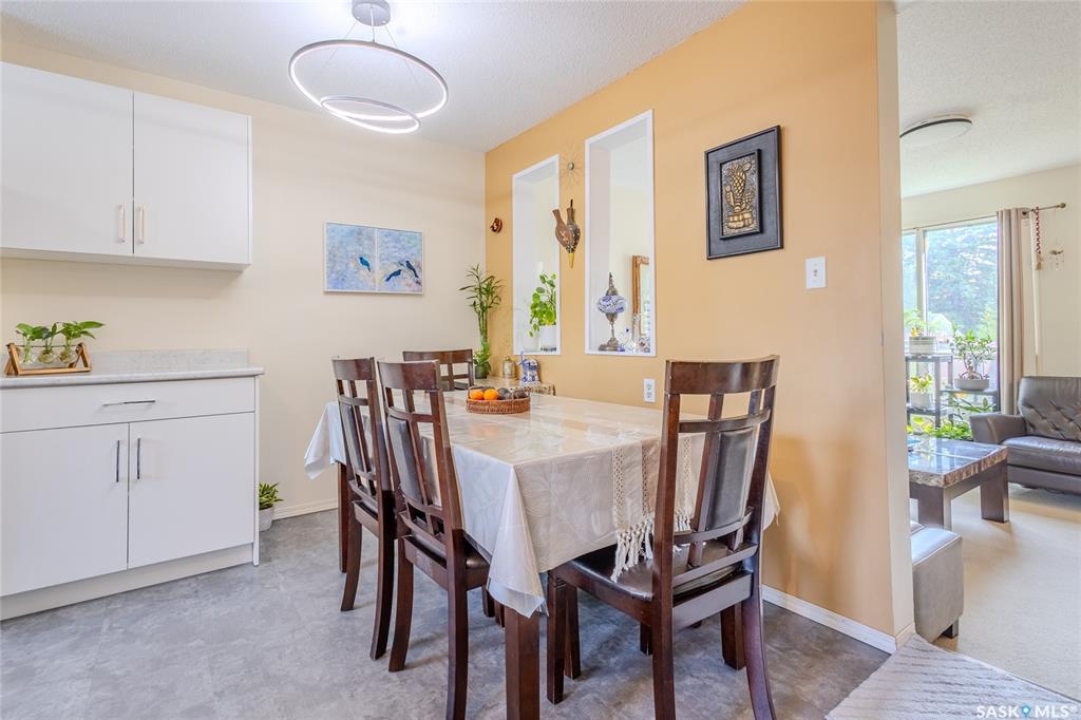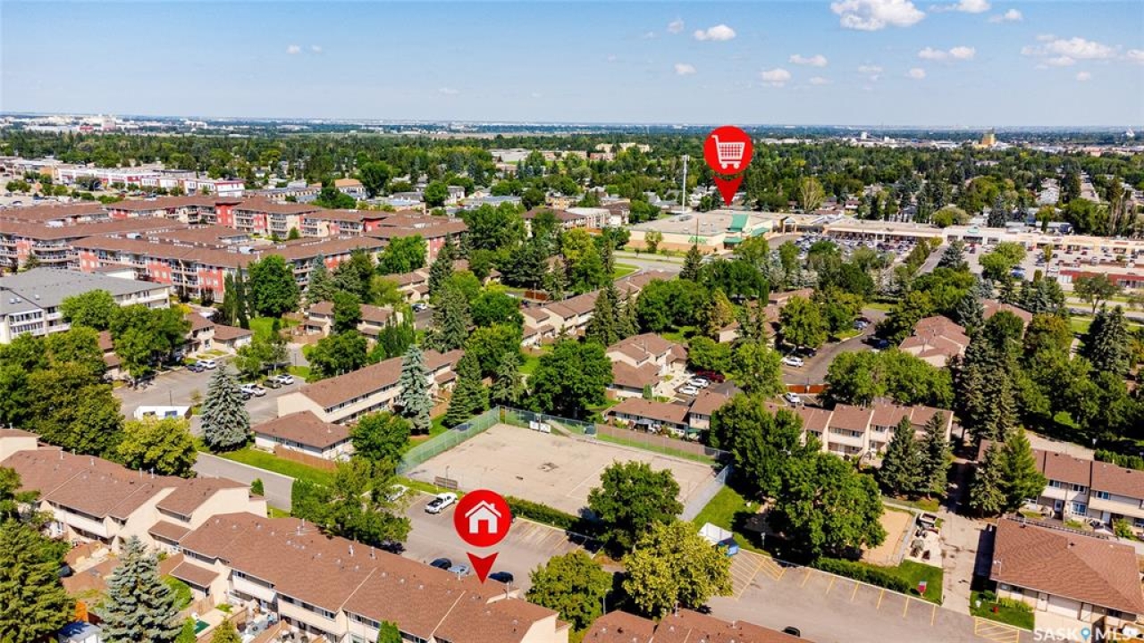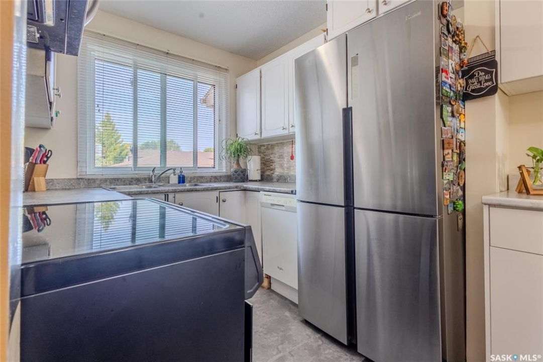 Situated in a great location within Wildwood Village, directly across from a playground and close to bus routes and all 8th Street amenities, this townhouse offers comfort and convenience at an affordable price. The main floor features a bright living room with a large south-facing window that fills the space with natural light, opening to the dining area. The functional kitchen includes a built-in dishwasher, backsplash, new microwave with hood fan, double sink, and a new kitchen window with a view of the playground. A conveniently located half bath just off the front entry completes the main level. Upstairs, you'll find laminate flooring throughout, a spacious primary bedroom with a new window, two additional bedrooms, and a full bathroom. The basement offers additional living space with a rec area and a laundry/storage room. Outside, enjoy a private, fully fenced south-facing backyard with a patio that is deeper than most units. Recent updates include new windows in the kitchen and primary bedroom, laminate flooring upstairs, a new stove, and a new microwave hood fan. The parking lot was freshly redone in 2024. This move-in ready home is ideal for first-time buyers, young families, investors, or anyone looking for a low-maintenance property in a convenient east-side location. Call your Realtor today to book your private showing!