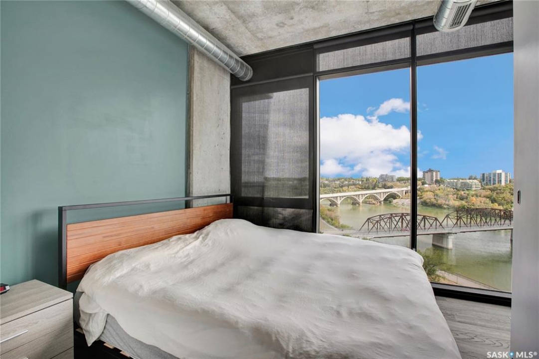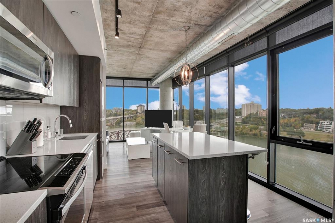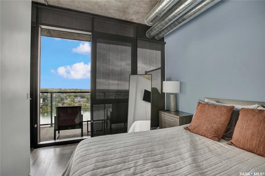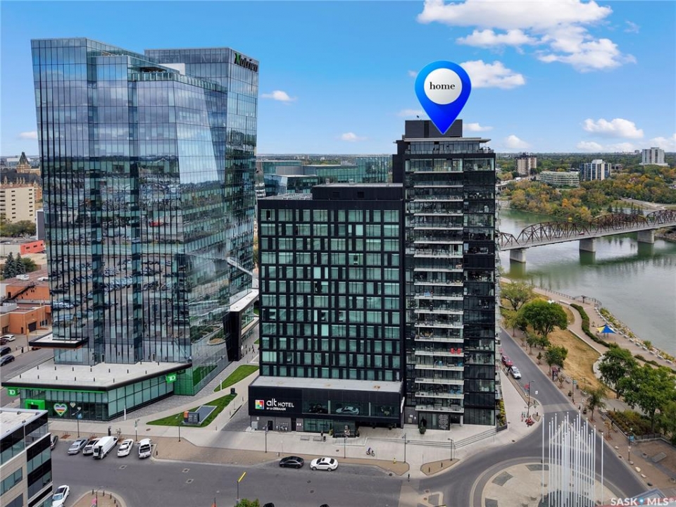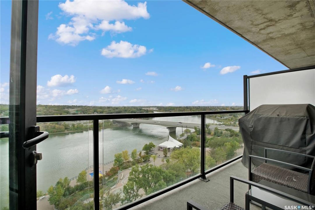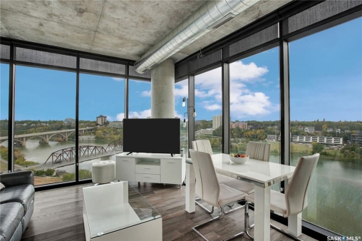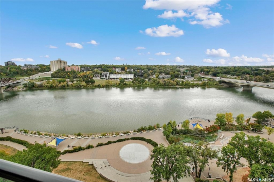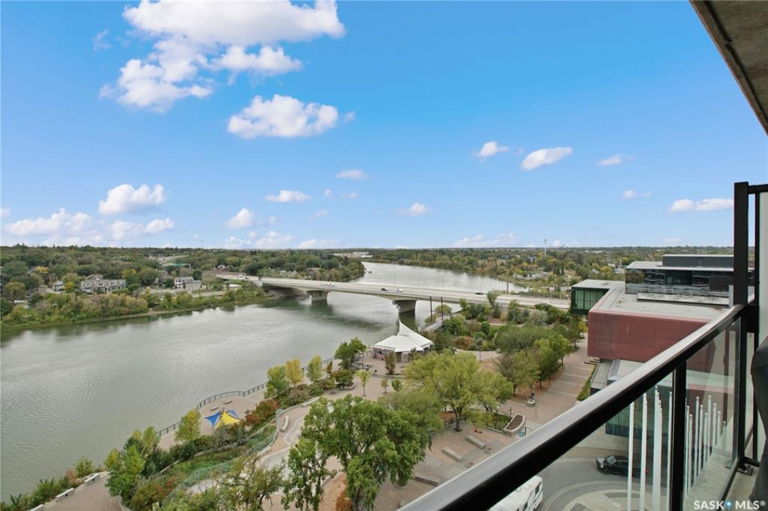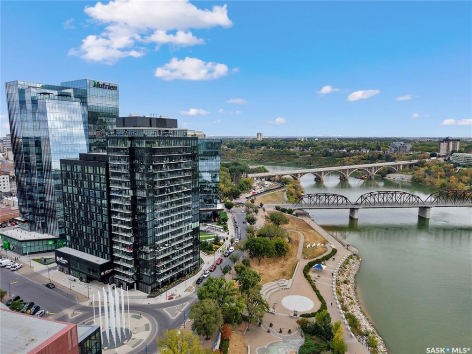 Live your life with the best river view in Saskatchewan. This stunning 2-bedroom, 2-bath condominium was the most sought after during the purchase phase. It's the south east corner, river facing, D2 floor plan, and the best value per dollar at River Landing. With a sleek design, you can enjoy a place of prestige, with a breathtaking view through the seventeen 9-ft floor to ceiling windows. A custom install of in-floor heating for both bathrooms gives you spa-like comfort while dining at a 10th floor level. A fair-sized balcony allows you to BBQ while looking for miles in either direction while watching the sunrise or set. You'll have a front row seat to the fireworks festival 365 days of the year. This includes an underground parking stall and a storage unit. Amenities include a resident lounge and fitness centre facing the South Saskatchewan river. This rare opportunity is a generational build that may not ever happen again in our city.