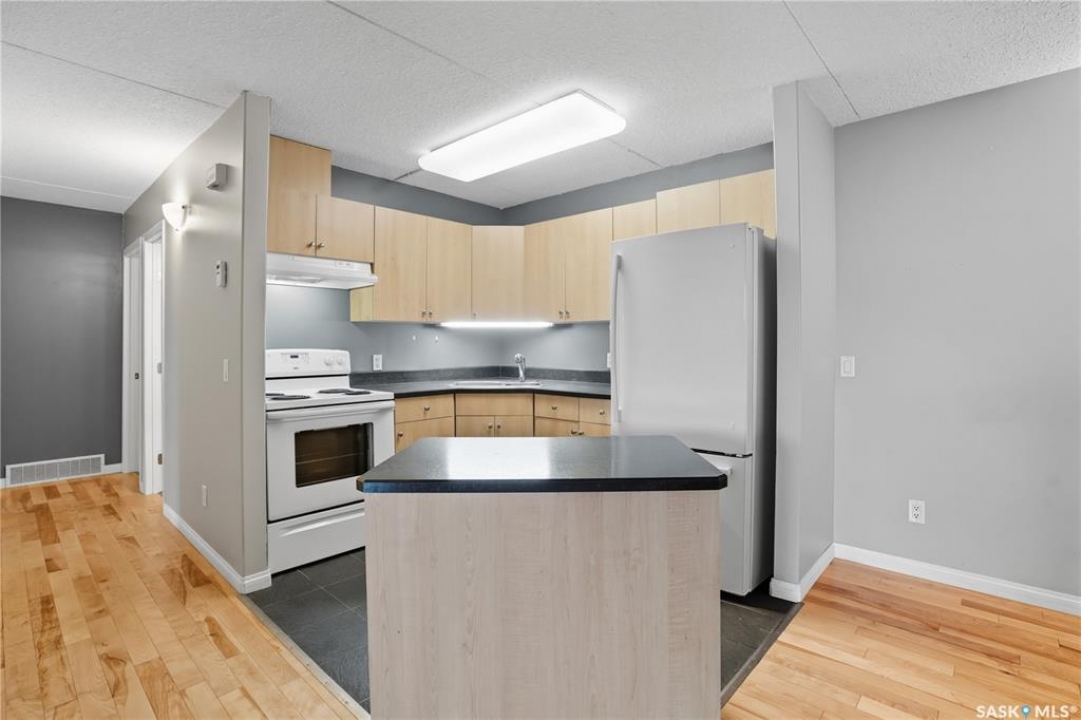 Welcome to 160 Gore Place unit #300. This move-in-ready, lower level apartment-style condo, perfect for a first-time homebuyer or revenue property. This well-maintained, updated unit features 2 comfortable bedrooms, gleaming hardwood flooring throughout, and a bright 4-piece bathroom. The kitchen is equipped with attractive cabinetry, under-counter lighting, and a convenient moveable island, opening to a dining area ideal for everyday meals or entertaining. Additional highlights include in-suite laundry with extra storage, plus an outdoor storage space located in the furnace room. The unit is heated with a high-efficiency furnace, adding to its comfort and value. A dedicated parking stall is included for your convenience. Clean, functional, and ready for new owners, this condo is an excellent opportunity to enjoy affordable, low-maintenance living. For your own personal showing, contact us today.