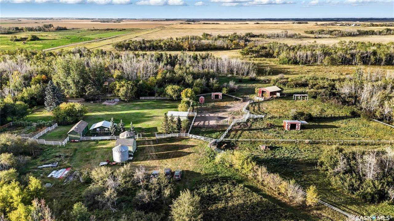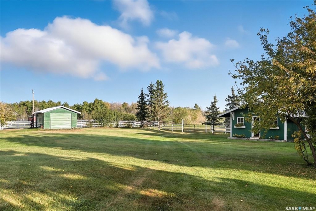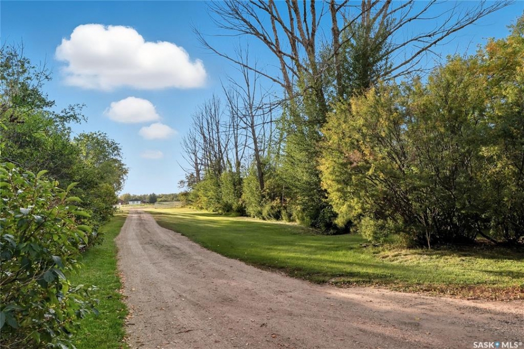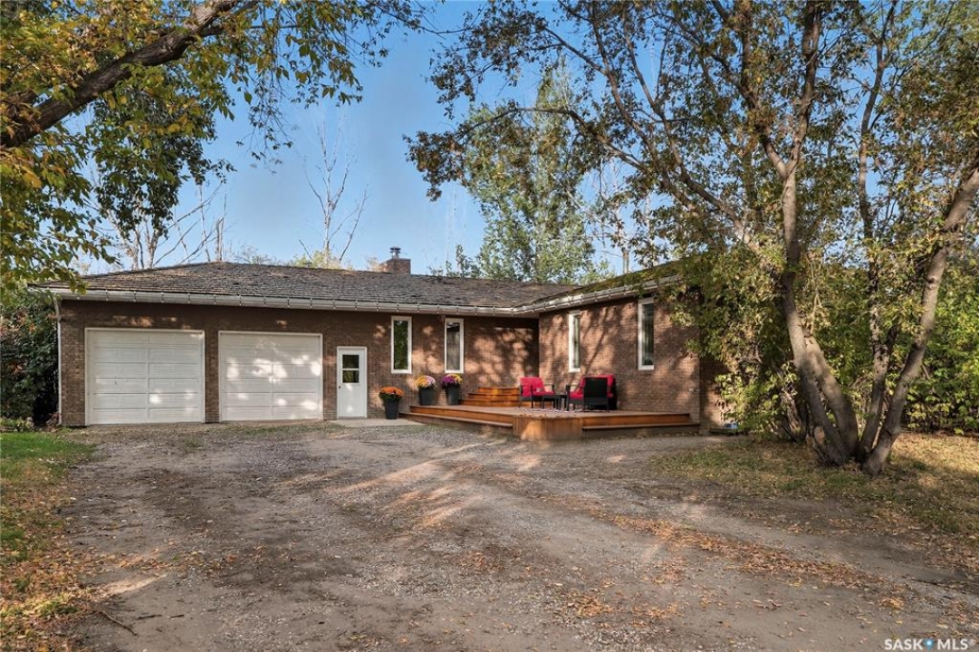 You will feel welcome from the moment you turn into the tree lined driveway, this is truly the acreage dreams are made of! Outside living begins here in this well treed, fenced 80 acres with 2 pens, just 15 minutes north of Saskatoon. The beautiful landscaped yard includes an excellent firepit/ bar area, new deck in back, plus larger deck on front, lush green grass, garden areas, chicken coop, 10x12 horse shelter, 24x 24 hayshed, and workshop. Property has 2 wells, an underground cistern, septic pump out and a newer septic tank. This well built bungalow offers brick exterior, cedar shakes, solid dry preserved wood foundation, and double attached heated garage with direct entry. Inside the main floor offers 4 bedrooms, 3 bathrooms, updated flooring, wood burning fireplace in the family room, main floor laundry & excellent storage. The kitchen is timeless oak with glass inserts on the upper cabinets, stainless steel appliances, plus around the corner is the patio doors to the new deck with natural gas bbq hook up. Primary bedroom does have a 4 piece ensuite and spacious counter. The basement offers 9 ft ceilings and is open for your desired development. Quiet location with close proximity to Saskatoon, school bus services to Dalmeny K-12. Contact your agent today, presentation of offers will be Sept 23, 2025 at 5 pm.