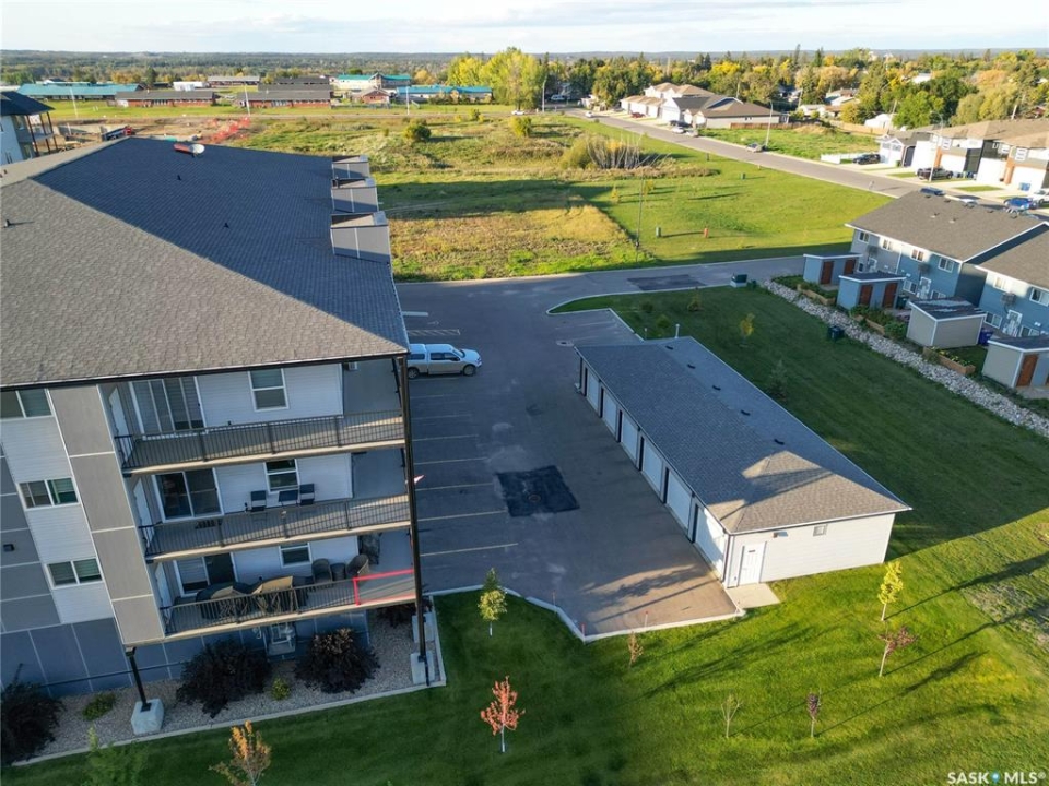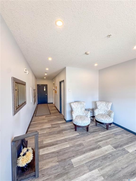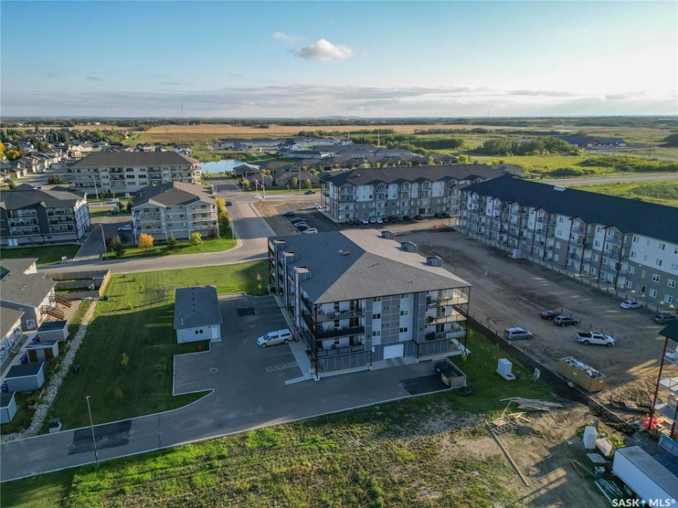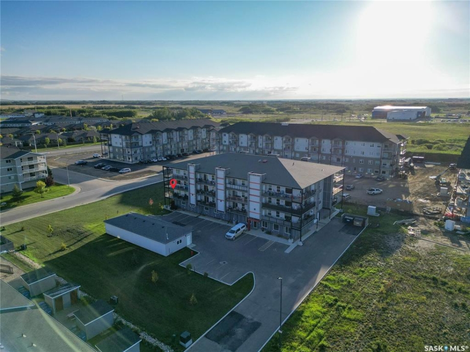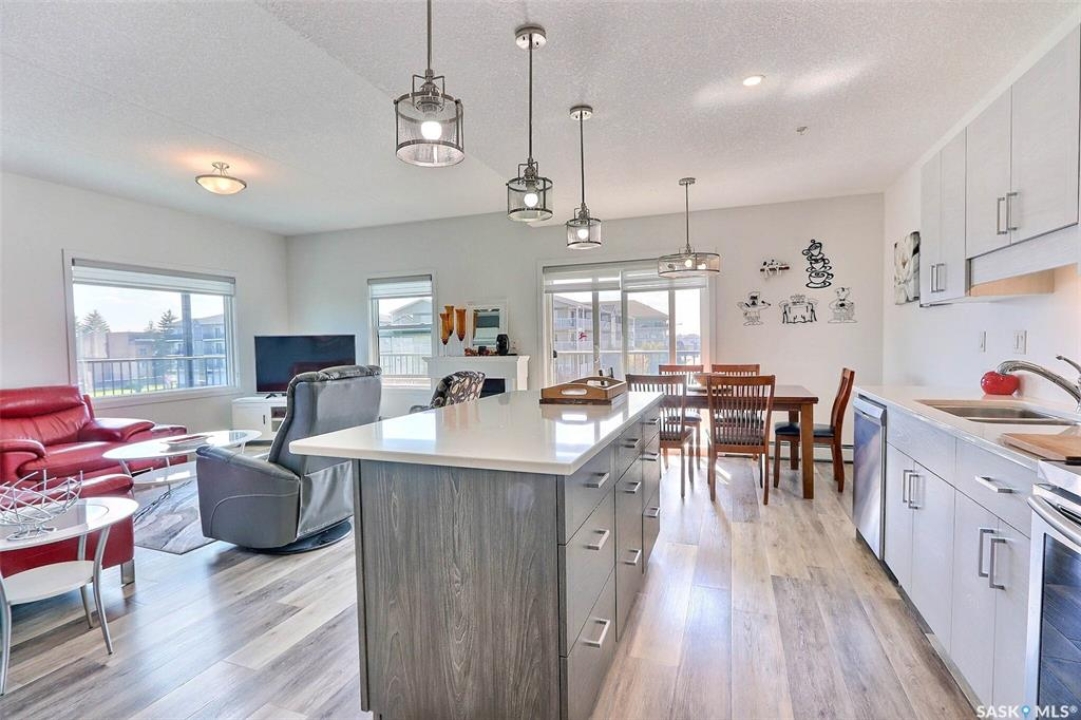 Stunning 2 bedroom, 2 bathroom condo offering 1,174 sq ft of luxury and low-maintenance living. This open-concept home features vinyl plank flooring and quartz countertops throughout, a bright white kitchen with stainless steel appliances, a 6' island, and expansive windows that flood the space with natural light. Soaring 9' ceilings enhance the spacious feel, while the southeast-facing covered wrap-around balcony includes two electrified and insulated storage rooms plus a natural gas BBQ line. The primary suite boasts its own bathroom, and the in-suite laundry provides additional storage space for convenience. Building amenities include an elevator, heated parking garage space, workshop, common room with a kitchenette, and an exercise area. Ideally located near the Alfred Jenkins Field House, hospital, and many other amenities, this condo combines elegance, comfort, and ease of living.