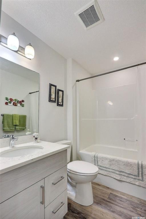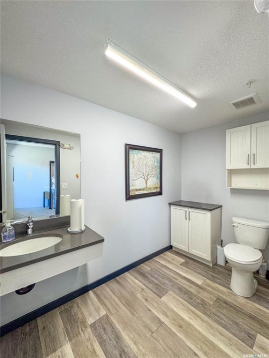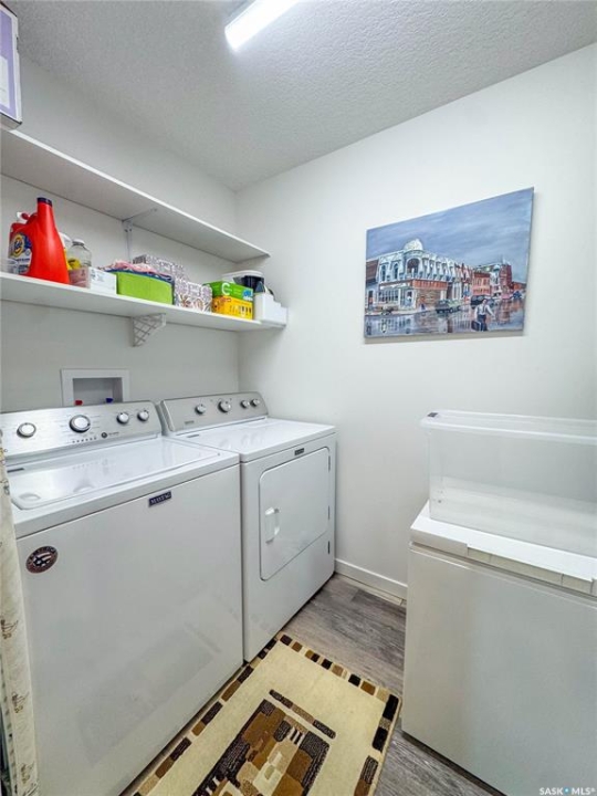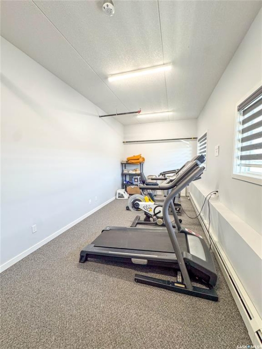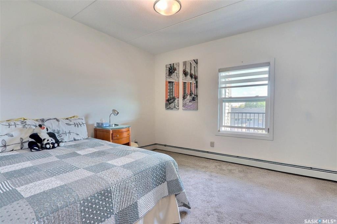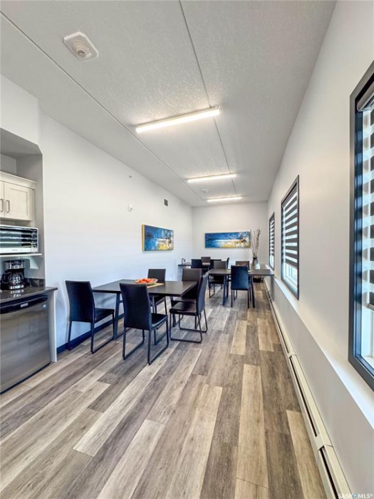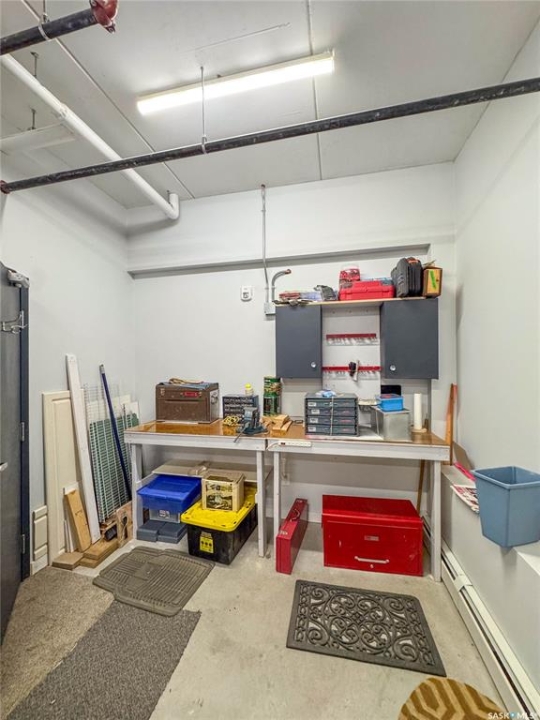 Stunning 2 bedroom, 2 bathroom condo offering 1,174 sq ft of luxury and low-maintenance living. This open-concept home features vinyl plank flooring and quartz countertops throughout, a bright white kitchen with stainless steel appliances, a 6' island, and expansive windows that flood the space with natural light. Soaring 9' ceilings enhance the spacious feel, while the southeast-facing covered wrap-around balcony includes two electrified and insulated storage rooms plus a natural gas BBQ line. The primary suite boasts its own bathroom, and the in-suite laundry provides additional storage space for convenience. Building amenities include an elevator, heated parking garage space, workshop, common room with a kitchenette, and an exercise area. Ideally located near the Alfred Jenkins Field House, hospital, and many other amenities, this condo combines elegance, comfort, and ease of living.
