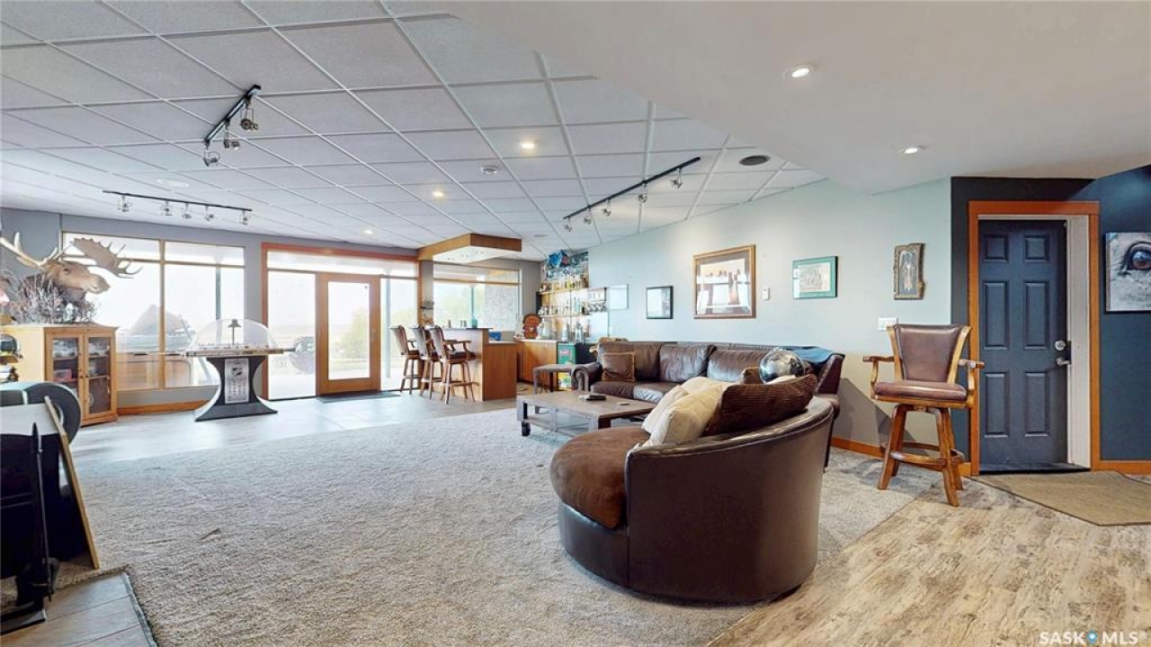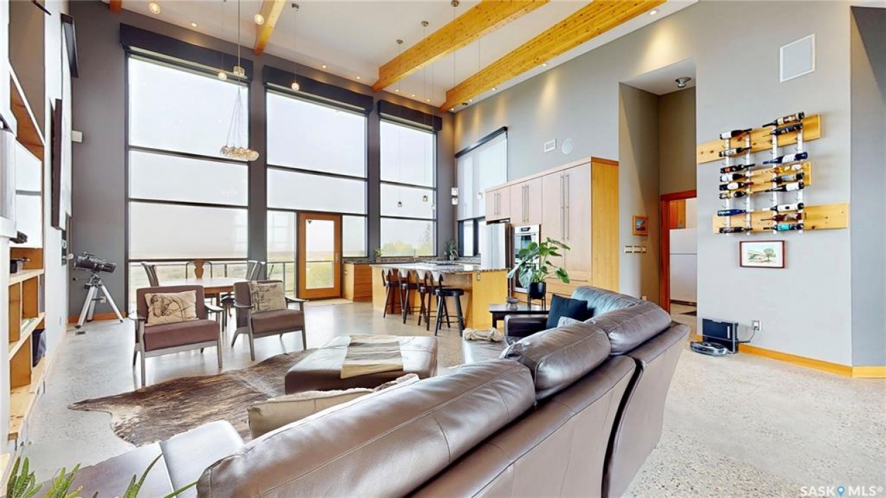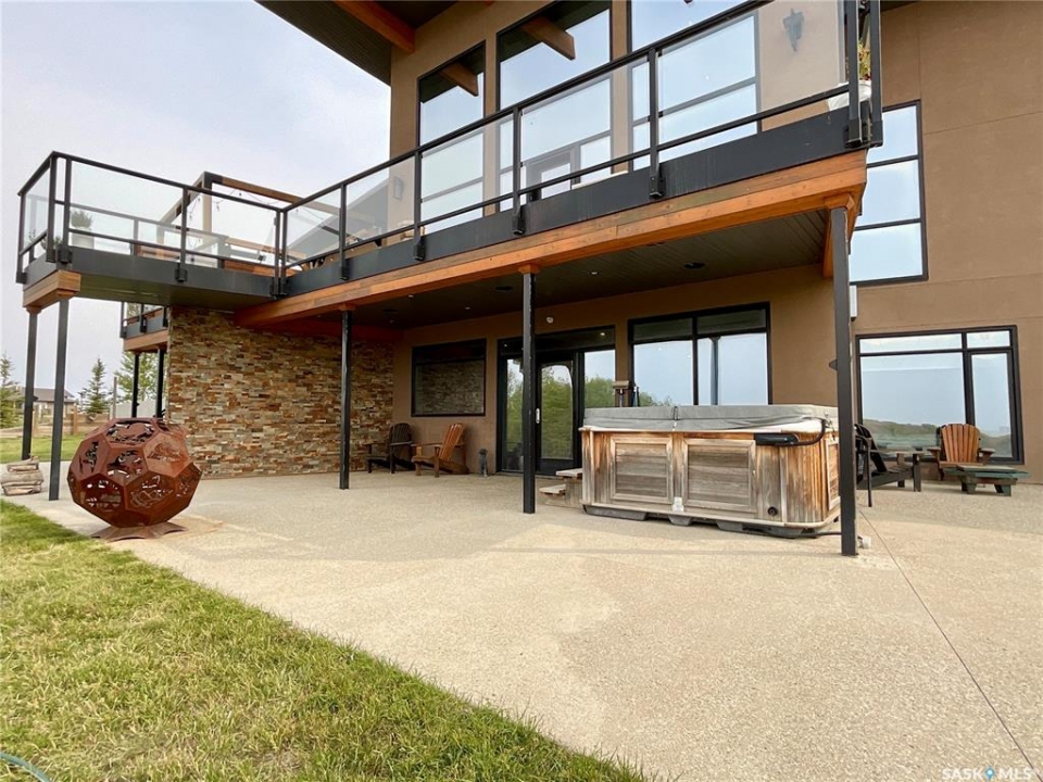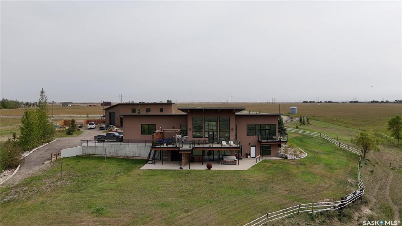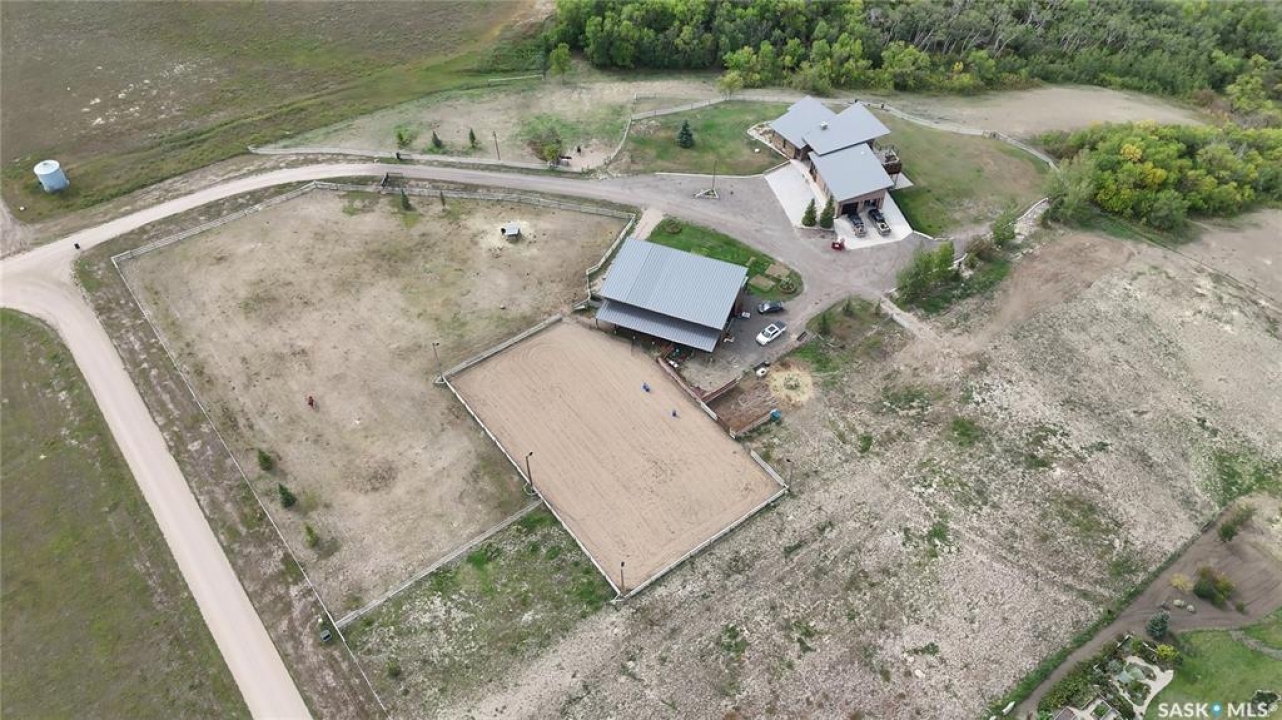 Experience 40 Apollo Drive in the Acreages at Minerva Ridge near Lumsden. From the powered gate and lit lane, this 5-bedroom, 4-bath home offers 2,200 sq. ft. on the main plus a full walkout level, including a private entrance suite for extended family or a caregiver. Floor-to-ceiling curtain wall windows showcase the Wascana and Qu'Appelle valleys, filling the home with light. Built for comfort and efficiency, the home features zoned in-floor hydronic heating, high-efficiency boiler, gas furnace with A/C backup, spray foam insulation, EIFS stucco, triple-pane argon windows, and a 12.6 kW solar system powering both house and barn—keeping costs near net zero. The kitchen includes a built-in gas cooktop, double wall oven, drawer microwave, fridge, dishwasher, and a butler's pantry with upright freezer and extra fridge. A mudroom with built-ins sits just off the garage. Technology upgrades include RA2 automation for blinds, lights, climate, and locks, whole-home audio, five video screens, Ring security, an 8-camera CCTV system, and permanent holiday lights. The lower level adds a wet bar, games area, and gym with overhead door for fresh air workouts. Outside, enjoy a covered patio with built-in BBQ, 8-person hot tub, and heater. A heated 1,080 sq. ft. garage and 35x70 insulated barn/shop provide storage, stalls, tack room, hay loft, and heated workshop. Equine features include a 100x180 LED-lit riding arena, two fenced pastures with solar fencing, and automatic water systems. Extras include a reinforced secure room, 200-amp service, water softener, and custom cold storage. Lumsden's schools and amenities are minutes away, with Regina only a 15-minute drive. Purchasers also have first right of refusal on the adjoining 3-acre parcel. https://youtu.be/mPkNdWGtmeE