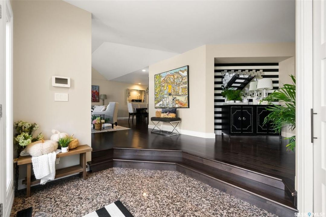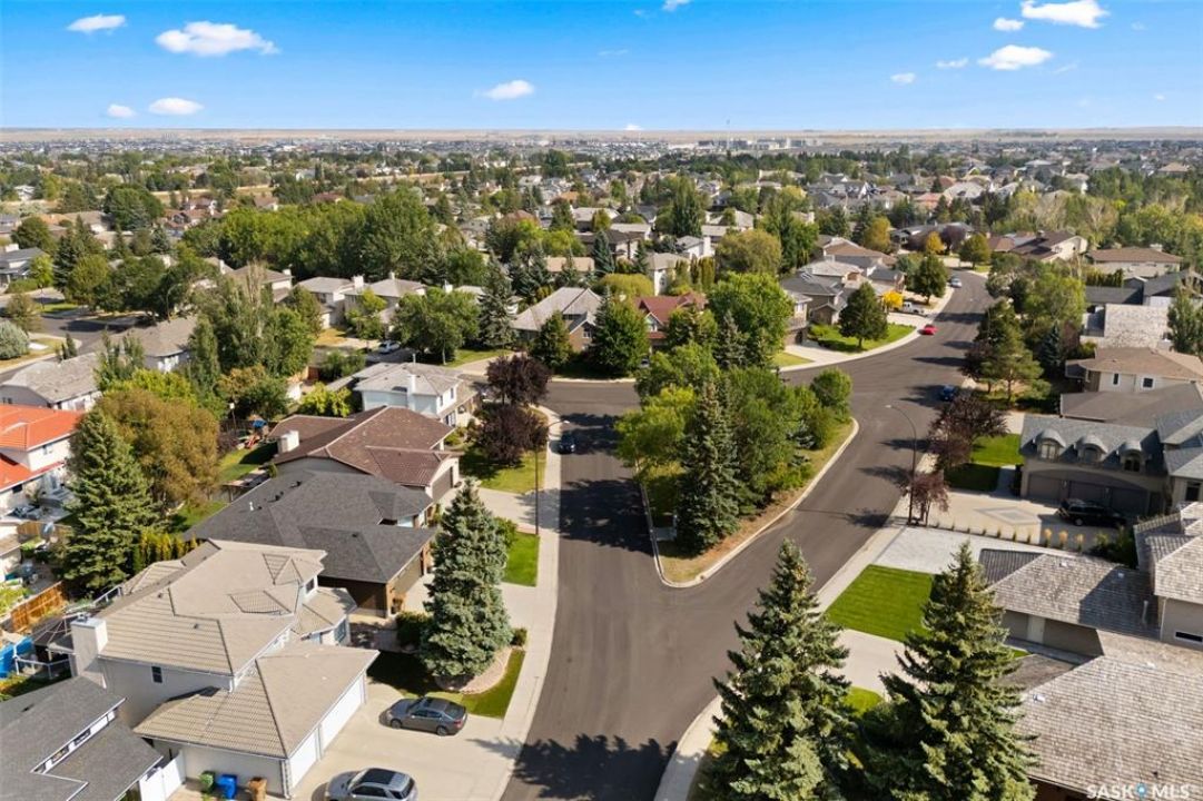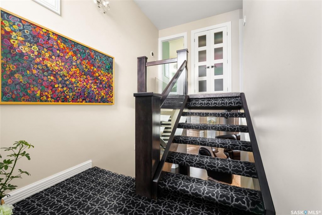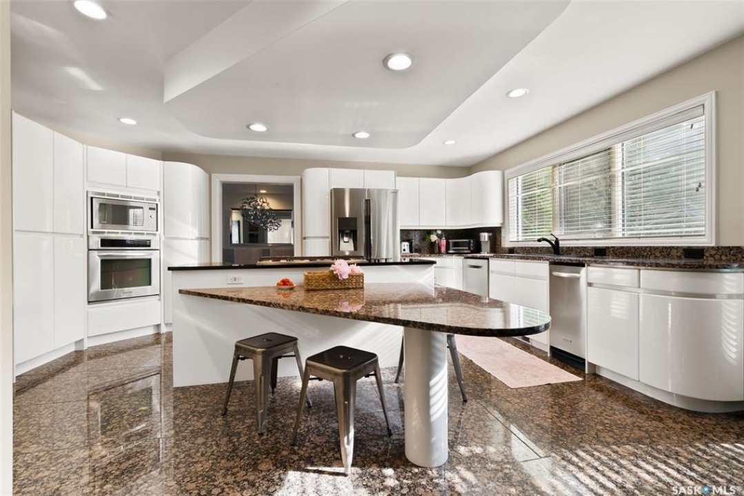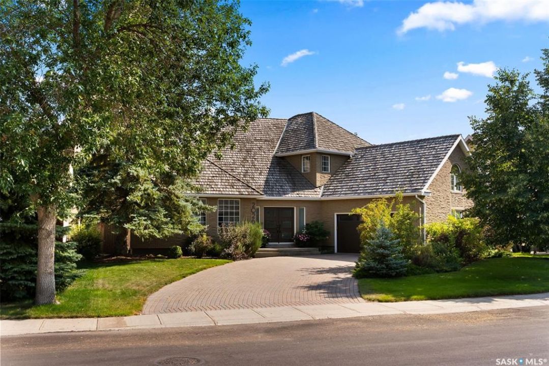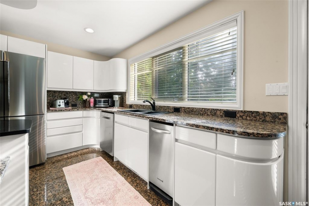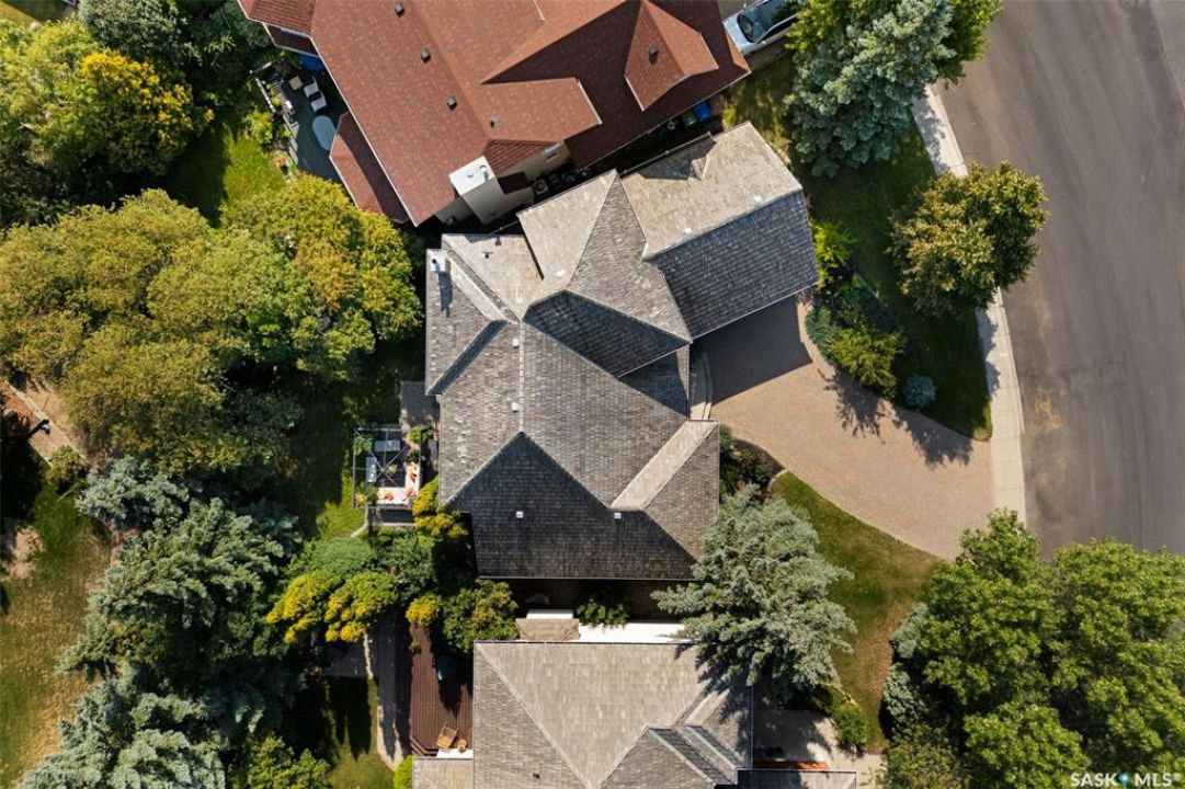 Don't miss this elegant and spacious two-storey home in prestigious Wascana View! This stunning custom-built property offers 5 bedrooms plus a large bonus room, with an exceptional floor plan and numerous upgrades. A brick façade, offset double attached garage & lush landscaping create impressive curb appeal. Inside, a sunken foyer with granite tile sets the tone. Formal living and dining rooms feature vaulted ceilings and large picture windows, filling the space with natural light. Sleek kitchen showcases Italian cabinetry, granite countertops, pot lighting, a two-tiered island with 5-burner gas cooktop and pop-up fan, built-in KitchenAid oven, built-in Panasonic microwave, and newer dishwasher (2019). Composite stairs lead to the outdoor patio, while the adjacent family room highlights a stacked-stone fireplace and media area. Custom mudroom/laundry is complete with stacking washer/dryer & built-in lockers.2-pc powder room with stylish finishes completes the main floor. The heated, boarded garage offers two direct entries to the home, including one that leads directly to the basement. Upstairs, the bonus room with gas fireplace provides flexibility as a cozy retreat or additional bedroom. The luxurious primary suite includes a spa-inspired ensuite with steam shower, double vanity, new window, and dressing area, plus a custom ClutterX walk-in closet. Two additional bedrooms and a fully renovated 4-pc bath with ceramic tile and granite vanity complete the level. Developed lower level features a large rec room, two more bedrooms and a stylish updated 4-pc bath. A hidden bookcase door reveals a secret craft room. Backyard is an entertainer's paradise with a spacious stone patio and bar area surrounded by mature landscaping. Additional upgrades include new flooring throughout most of the home, smart lighting with Lutron dimmer system, EcoBee thermostat, security system with cameras, and Telus monitors. Luxury living in one of Regina's most desirable neighbourhoods!