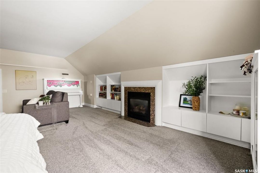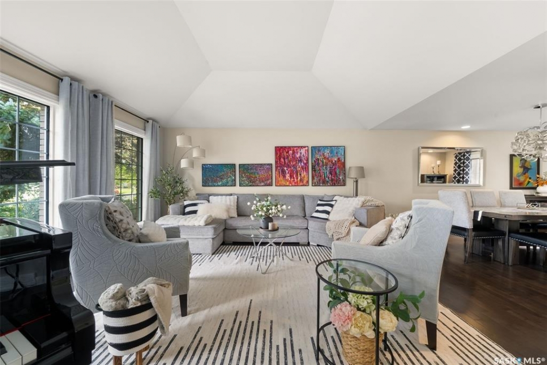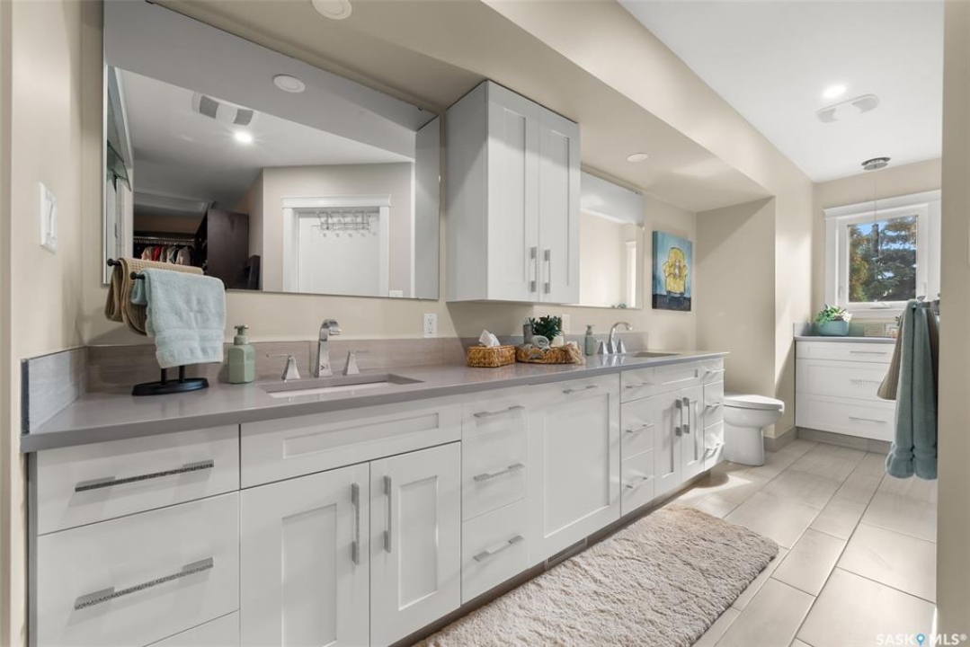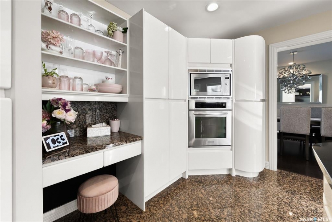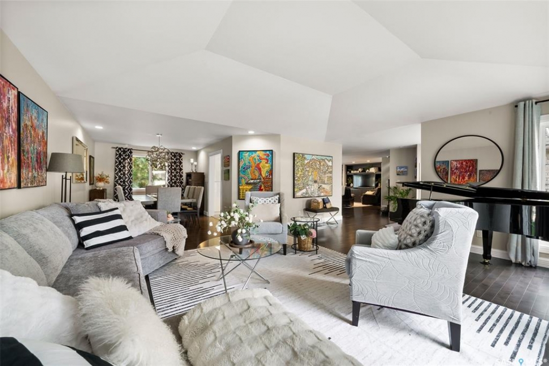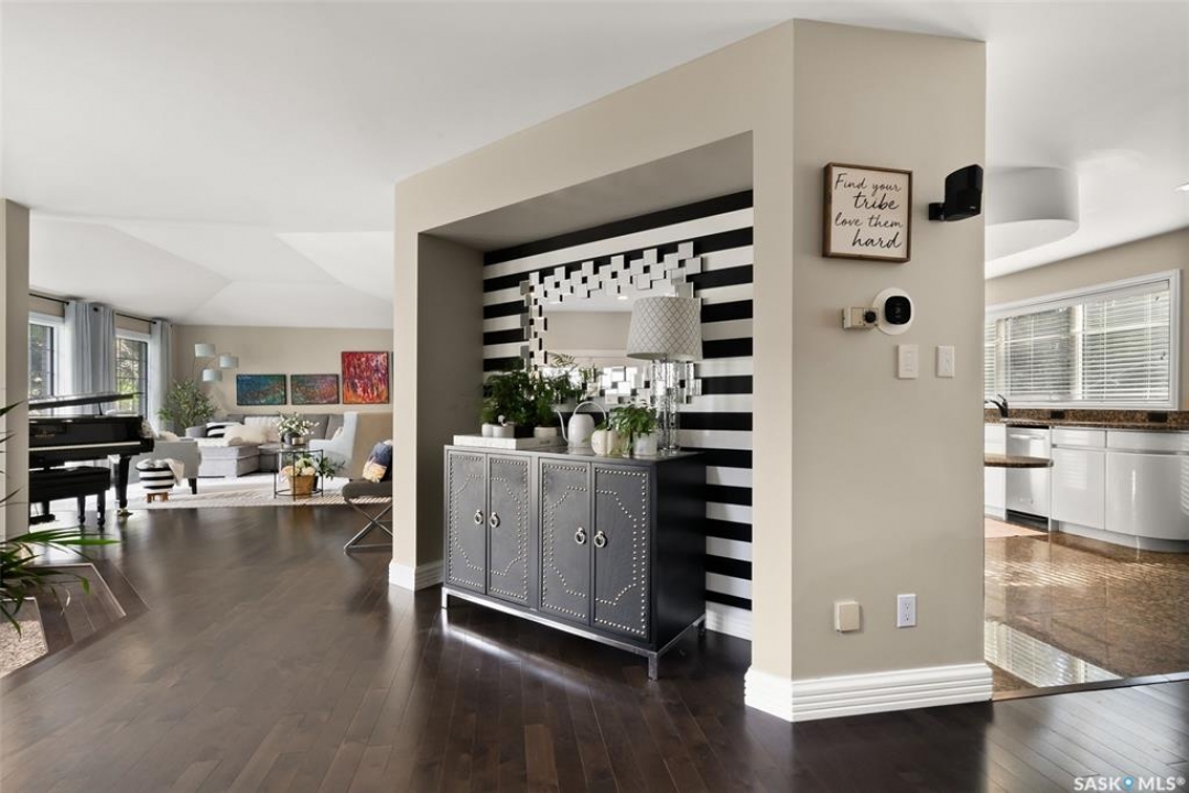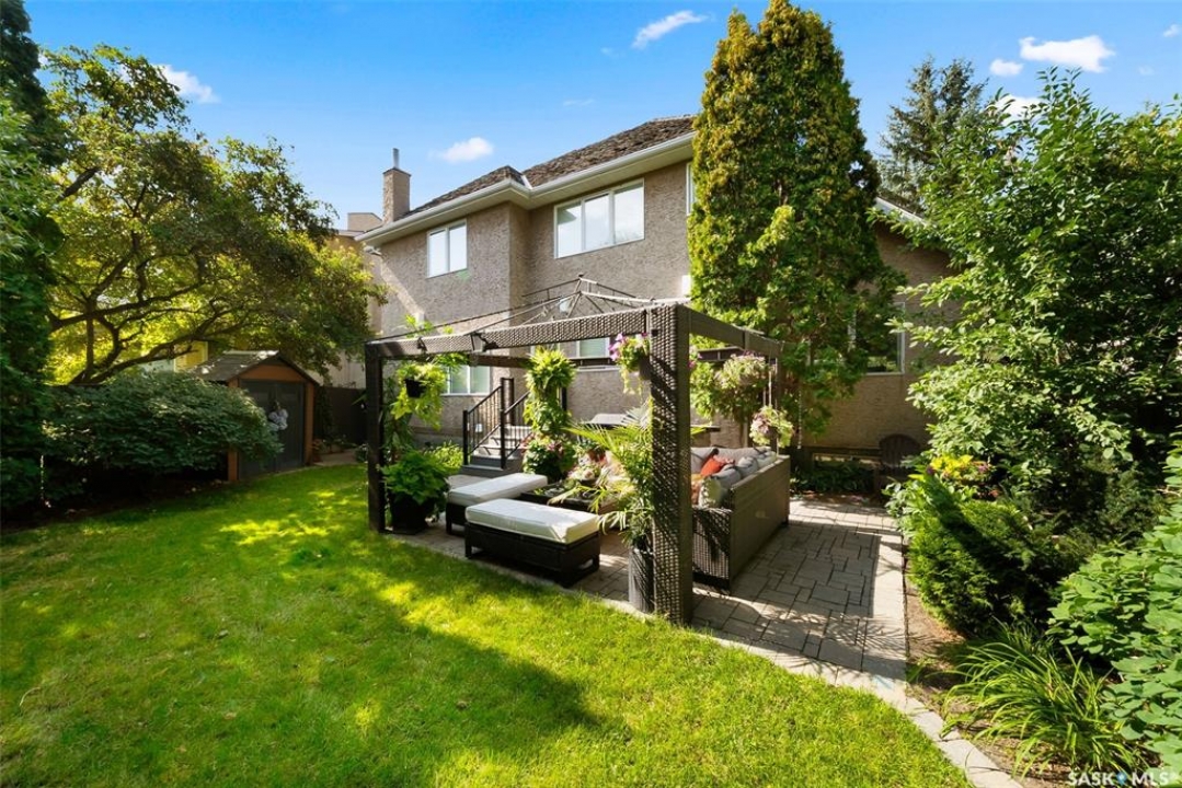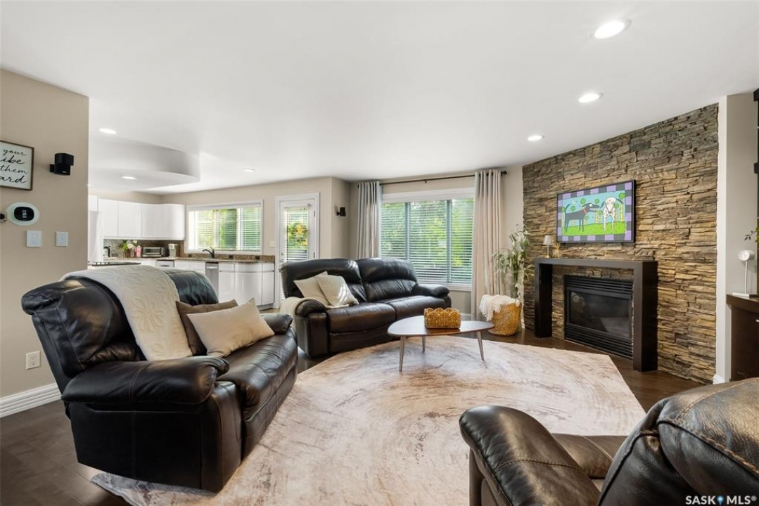 Don't miss this elegant and spacious two-storey home in prestigious Wascana View! This stunning custom-built property offers 5 bedrooms plus a large bonus room, with an exceptional floor plan and numerous upgrades. A brick façade, offset double attached garage & lush landscaping create impressive curb appeal. Inside, a sunken foyer with granite tile sets the tone. Formal living and dining rooms feature vaulted ceilings and large picture windows, filling the space with natural light. Sleek kitchen showcases Italian cabinetry, granite countertops, pot lighting, a two-tiered island with 5-burner gas cooktop and pop-up fan, built-in KitchenAid oven, built-in Panasonic microwave, and newer dishwasher (2019). Composite stairs lead to the outdoor patio, while the adjacent family room highlights a stacked-stone fireplace and media area. Custom mudroom/laundry is complete with stacking washer/dryer & built-in lockers.2-pc powder room with stylish finishes completes the main floor. The heated, boarded garage offers two direct entries to the home, including one that leads directly to the basement. Upstairs, the bonus room with gas fireplace provides flexibility as a cozy retreat or additional bedroom. The luxurious primary suite includes a spa-inspired ensuite with steam shower, double vanity, new window, and dressing area, plus a custom ClutterX walk-in closet. Two additional bedrooms and a fully renovated 4-pc bath with ceramic tile and granite vanity complete the level. Developed lower level features a large rec room, two more bedrooms and a stylish updated 4-pc bath. A hidden bookcase door reveals a secret craft room. Backyard is an entertainer's paradise with a spacious stone patio and bar area surrounded by mature landscaping. Additional upgrades include new flooring throughout most of the home, smart lighting with Lutron dimmer system, EcoBee thermostat, security system with cameras, and Telus monitors. Luxury living in one of Regina's most desirable neighbourhoods!