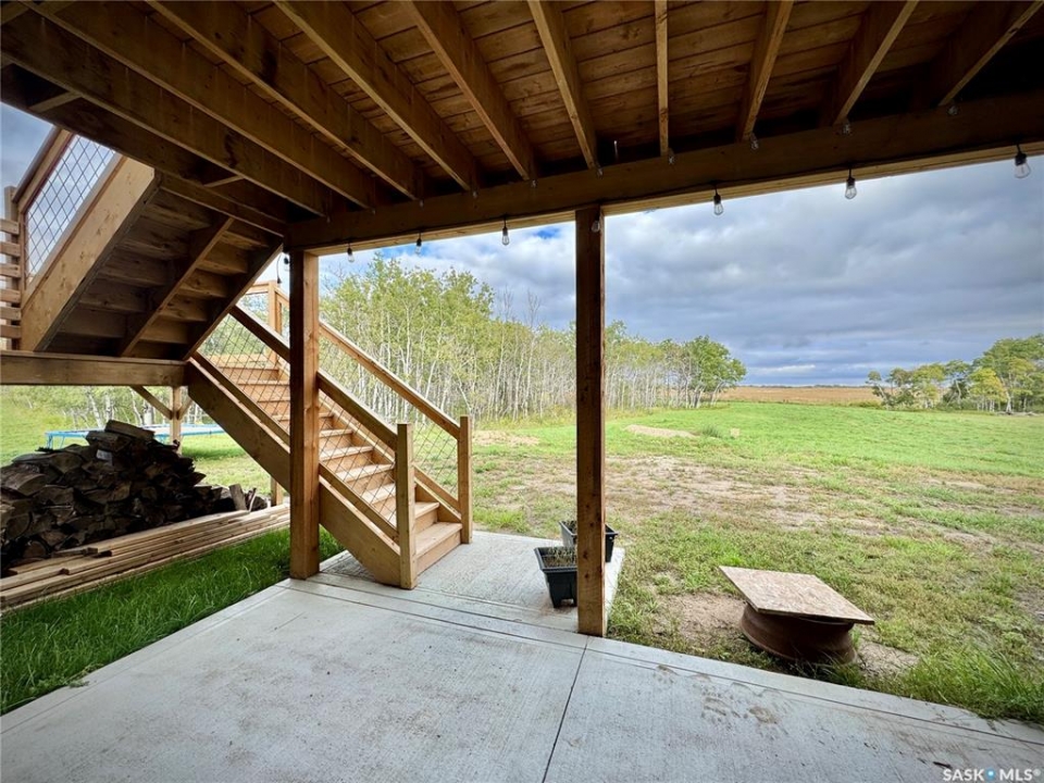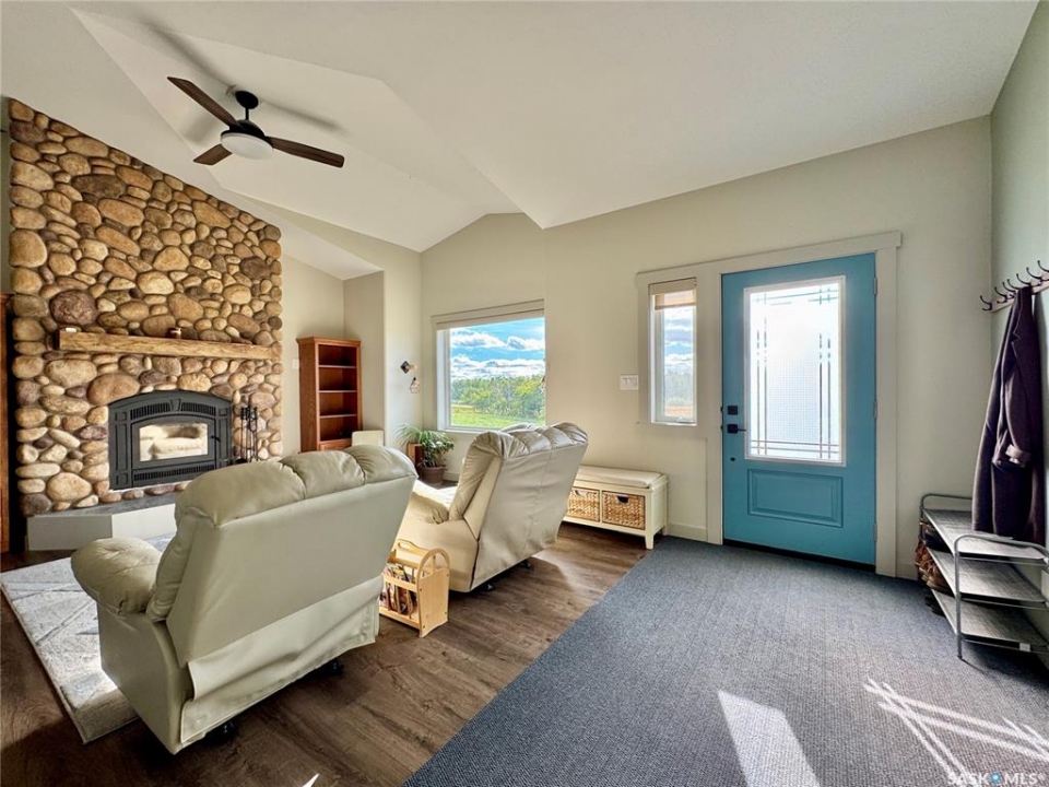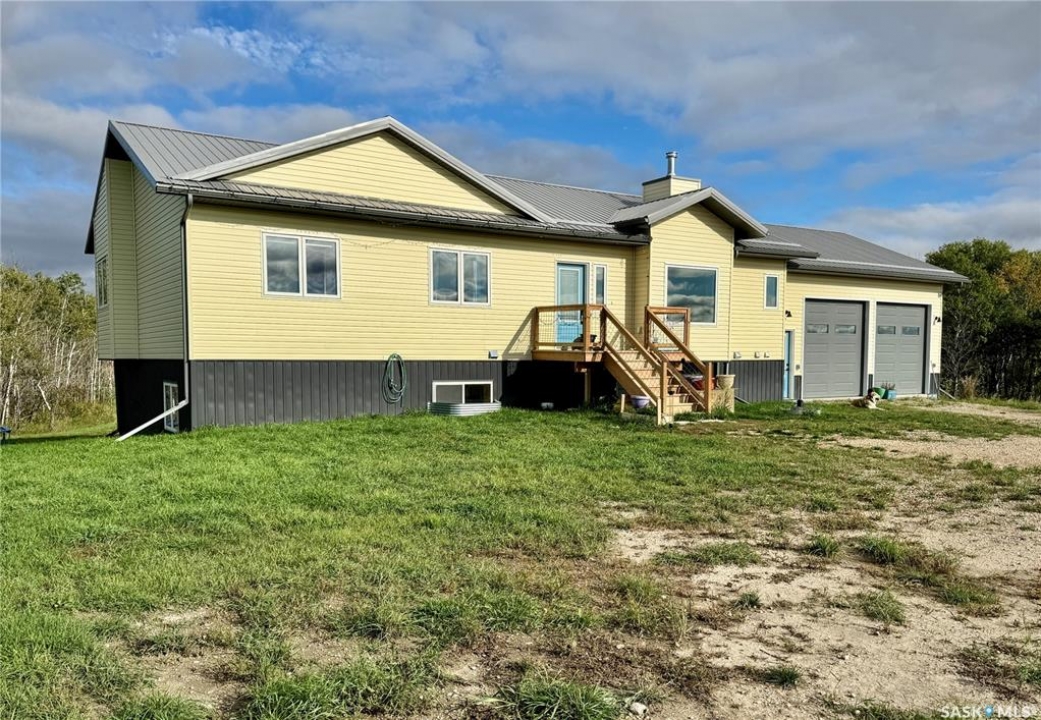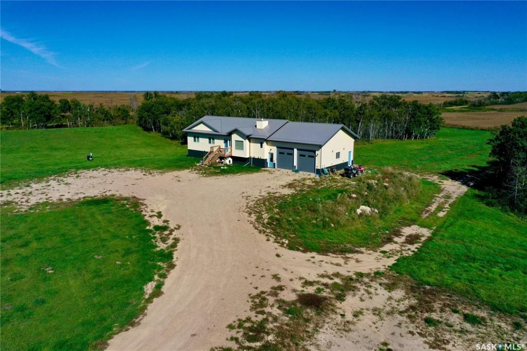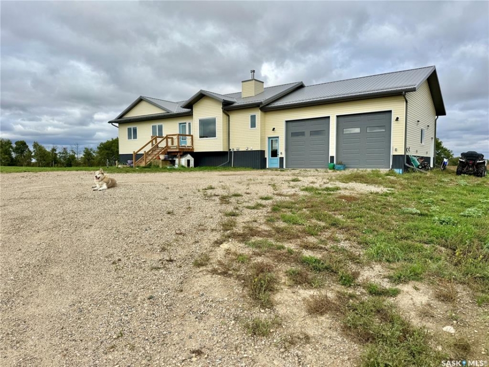 At Natures Edge Acres, nature and new construction come together in a way rarely seen in SE Saskatchewan. Tucked behind a mature shelterbelt where deer and songbirds wander, this 2022 custom build delivers more than 3,000 sqft. of exceptional living space—a chance to own a true countryside original without the wait of building. Designed from the ground up with family and entertaining in mind, the home offers 5 bedrooms and 4 bathrooms, plus a surprise you'll be talking about long after the showing: a 6th bedroom with a built-in slide right at the heart of the house. Whether it's kids at play or simply hauling heavy bags downstairs, the slide turns everyday tasks into something fun. The main living area wows from the moment you walk in. Vaulted ceilings and wall-to-wall windows capture prairie light from sunrise to those legendary Saskatchewan sunsets. A dramatic floor-to-vault river rock fireplace anchors the space—beautiful to look at and practical too, with settings that keep the home warm even if the power goes out. The chef's kitchen is ready for gatherings big or small, complete with a generous prep island, deep dovetailed pot drawers, and soft-close cabinetry. The sink frames tranquil eastern views while the west-facing picture window serves up nightly sunset shows. Built with modern efficiency in mind, the home features geothermal heating and cooling, weeping tile, excellent insulation, and spa-style ensuite showers. The electrical wiring has been thoughtfully planned—“overbuilt,” as the owners like to say—so you're ready for anything from a future basement bar with toe-kick lighting to advanced tech upgrades. Outside, the unfinished shop is already set up for big projects with a welder plug, 30-amp camper hookup, and doors tall enough for a lifted truck. Whether you're after a family retreat, a place to host unforgettable gatherings, or simply room to breathe, this acreage offers a rare combination of new-home comfort and Saskatchewan's natural beauty.