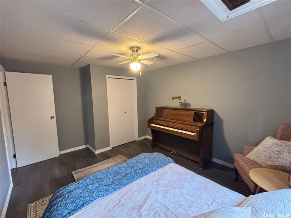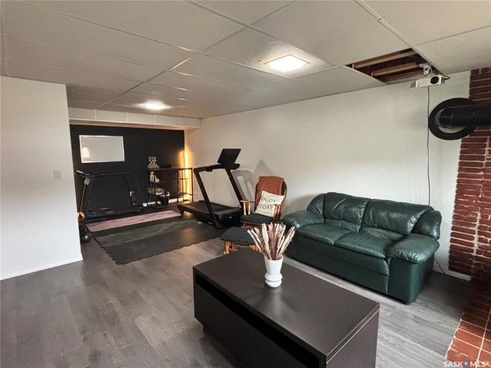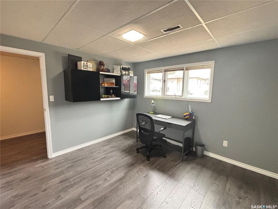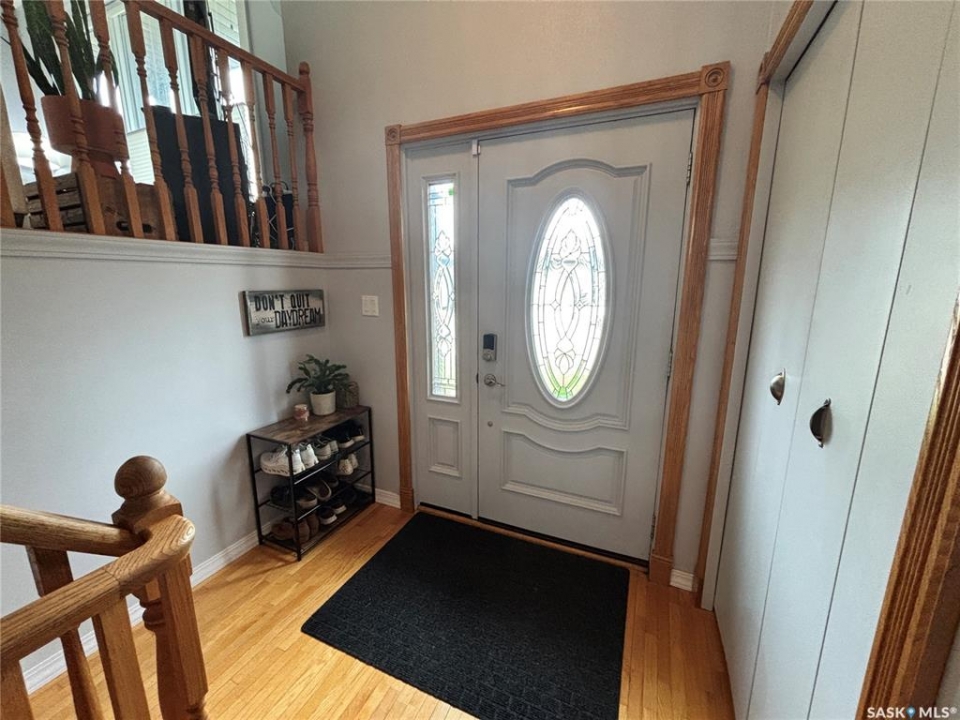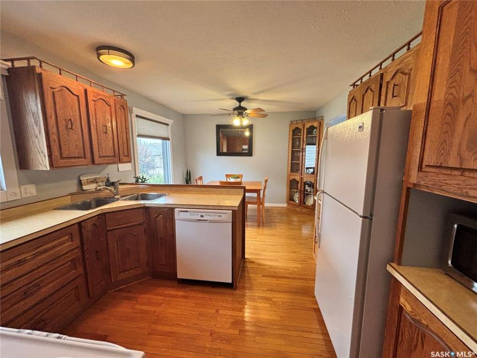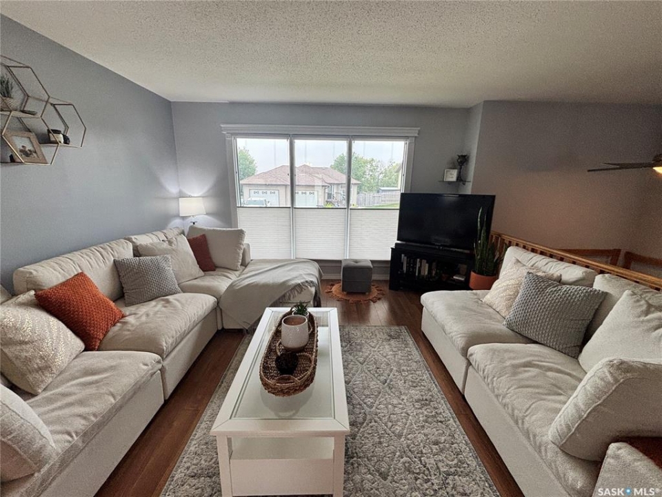 Welcome to this well-maintained bi-level home located in the growing community of Lanigan, Saskatchewan. Nestled on a quiet crescent, this property sits on a desirable corner lot within walking distance to schools and parks—an ideal spot for families. The exterior boasts attractive street appeal with a single attached garage, surrounding green space, a small garden area, and a three-tier deck at the back—perfect for entertaining or enjoying the outdoors. Inside, you're greeted with a spacious entrance that offers the option to go up or downstairs. The main level features a bright living room with large windows, flowing seamlessly into the dining room and kitchen. The kitchen provides plenty of counter and cupboard space with classic oak cabinetry, along with a convenient storage closet off the rear entry—large enough to house a stand-up freezer. Two generously sized bedrooms and a four-piece bath complete the main floor. The primary bedroom includes a unique makeup area that could easily be converted back into a two-piece ensuite for added convenience. A handy laundry chute connects the main bath directly to the basement laundry area. The lower level is designed for comfortable living with large windows that bring in natural light, a spacious family room with a cozy wood-burning fireplace, two additional bedrooms, a three-piece bath, and a laundry/utility room with ample storage. With a thoughtful layout, plenty of storage, and a welcoming neighborhood, this home offers comfort and functionality for a growing family.