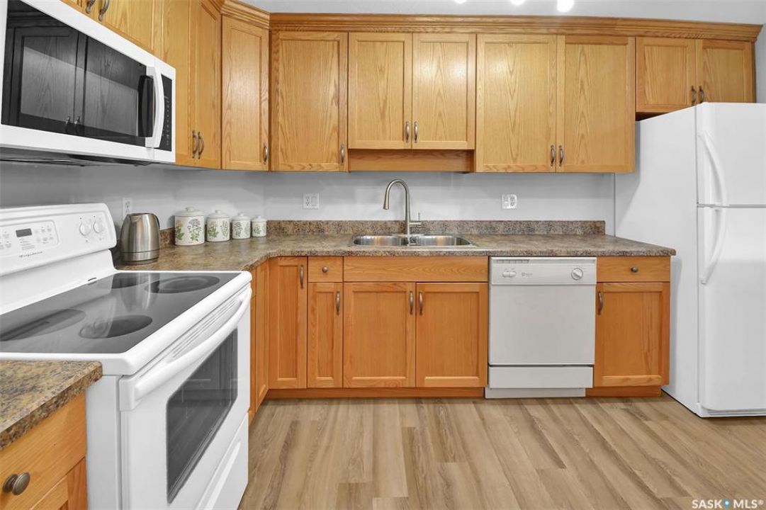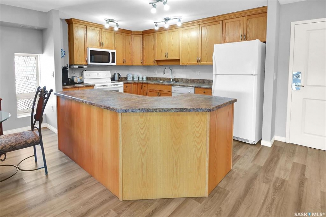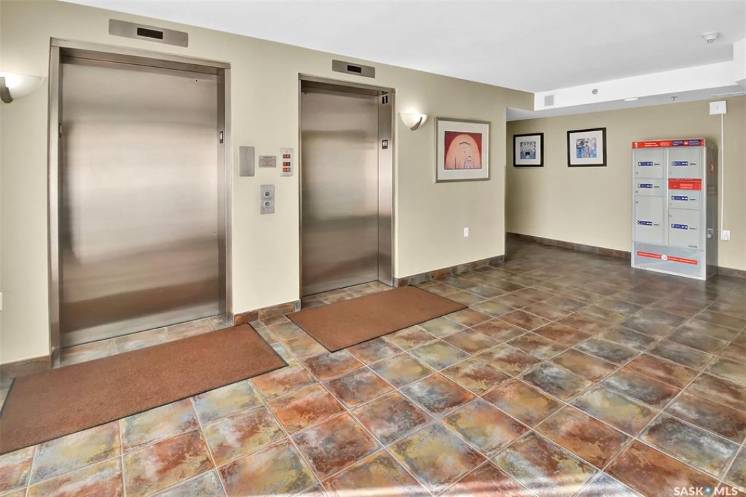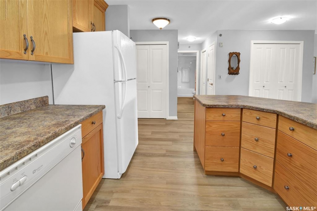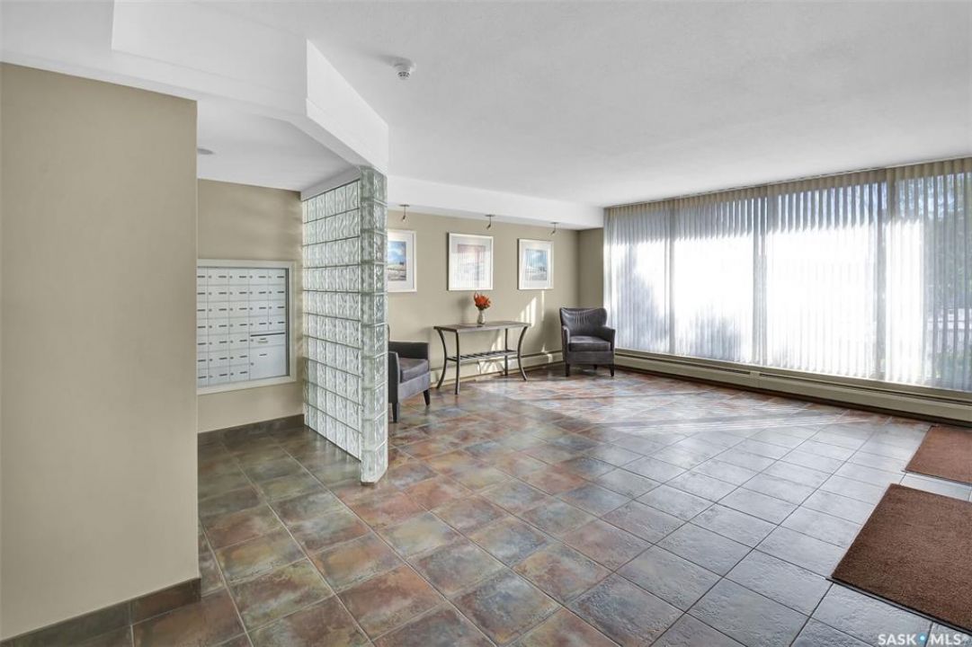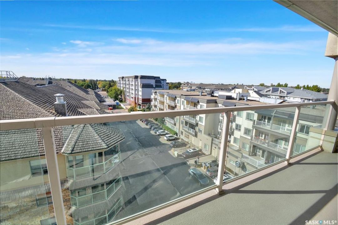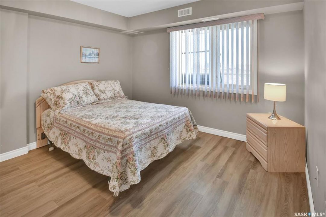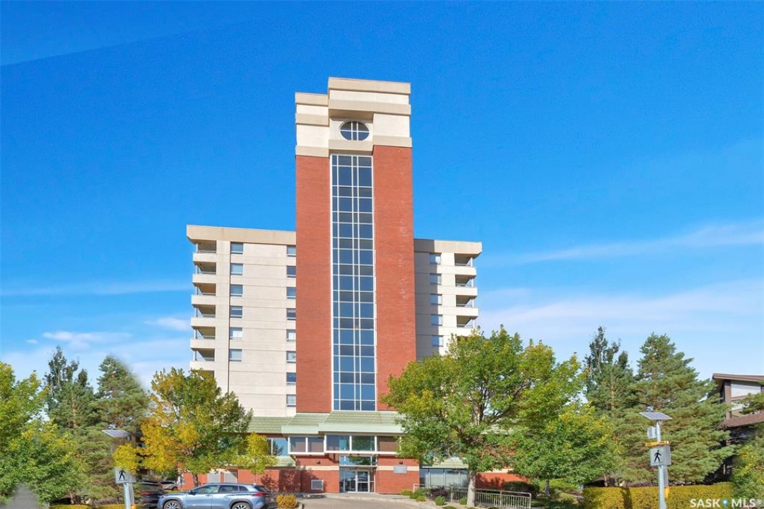 This bright, west facing, move-in ready corner unit condo boasts and exceptional view of the city, which can be enjoyed from the large balcony. Fremai Tower is a concrete building across from Market Mall. 1098 sq ft open concept with large kitchen with oak cabinets, large island, appliances, lots of pot drawers and cabinets to the ceiling. Overlooking the dining area and living room opens to the balcony. The primary bedroom offers room for a king bed and has a large walk-in closet and 3-piece ensuite. Vinyl plank flooring is throughout except for the one bedroom. Spacious laundry area has lots of storage. This condo includes a storage unit on the 12th floor and one underground parking stall, which is close to the elevator. Common areas include an amenities room and an exercise room. Ideal for socializing, this prime location within the complex is truly exceptional- offering a private, quiet, and secure west direction.