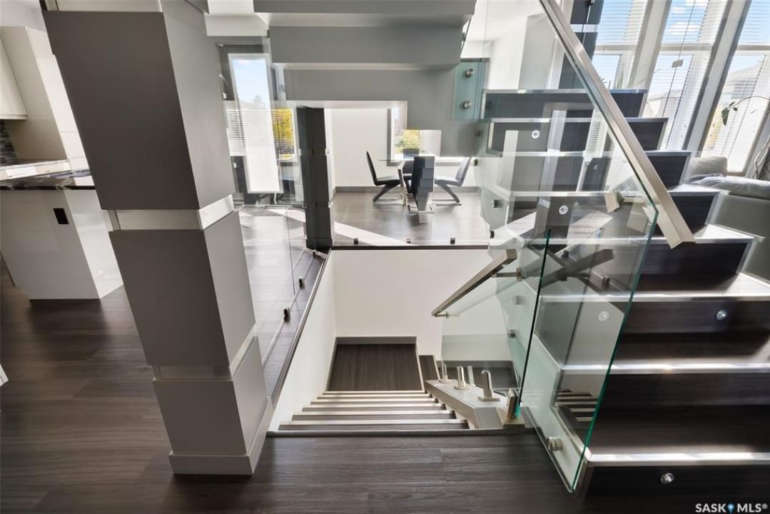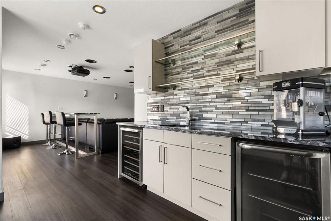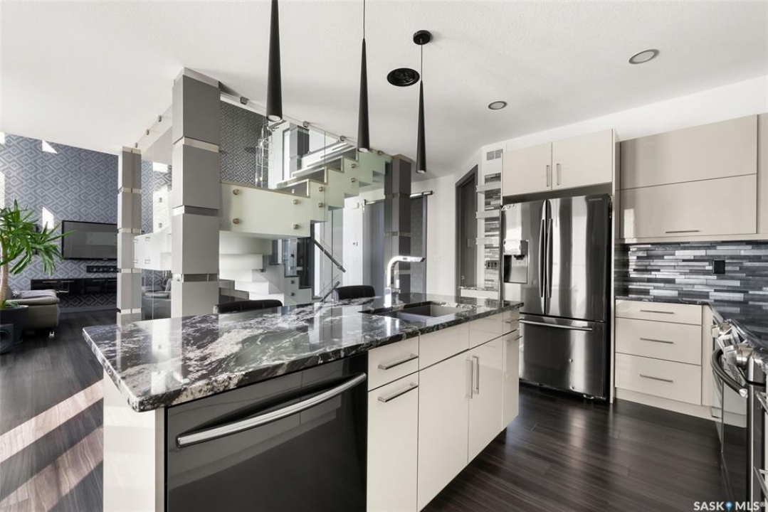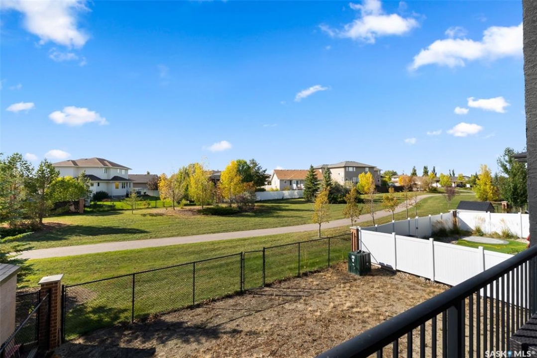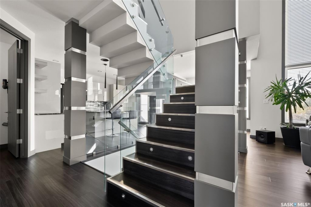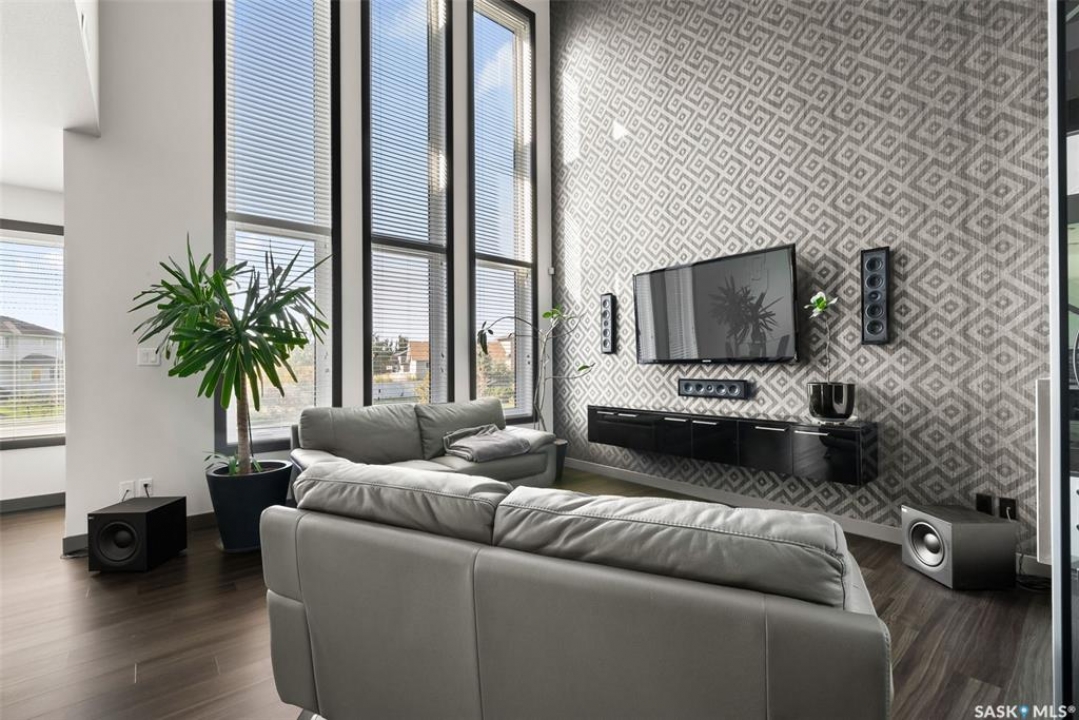 Welcome to this stunning custom-built walkout in Fairways West! This home is in a prime location and backs the beautiful walking path leading to the Goulet Golf Course. The moment you step inside, 19-foot ceilings and floor-to-ceiling windows create a dramatic sense of space and light. A striking glass-and-stainless steel staircase, accented with subtle stair lighting, introduces the home's modern, refined style. The kitchen is both beautiful and practical, featuring custom white cabinetry, a generous sit-up island, granite countertops and premium stainless-steel appliances. There is garden door access from the kitchen which opens onto a private west-facing deck—ideal for morning coffee or evening entertaining while taking in the peaceful green space. Upstairs you'll find the primary retreat, complete with a walk-in closet and a luxurious five-piece ensuite featuring dual vanities, a stand-alone soaker tub and a custom-tiled shower. Two additional bedrooms, a four-piece bath, and a convenient laundry room complete this level. The fully developed walkout basement is built for entertaining or unwinding after a long day. The rec room is set up as a perfect home theatre complete with a projector screen and built-in sound system! A sleek wet bar adds style and convenience, while the fourth bedroom doubles as a guest room, office, or home gym. Expansive windows keep the space bright and welcoming. The oversized double attached garage is a standout—heated, drywalled and equipped with 12-foot ceilings, a floor drain, and water taps. There are built-in speakers throughout the house and receivers are all included. Every detail in this home combines contemporary design with practical luxury. Discover a residence where craftsmanship and lifestyle meet in one exceptional property. This Fairways West show piece is one you do not want to miss out on!