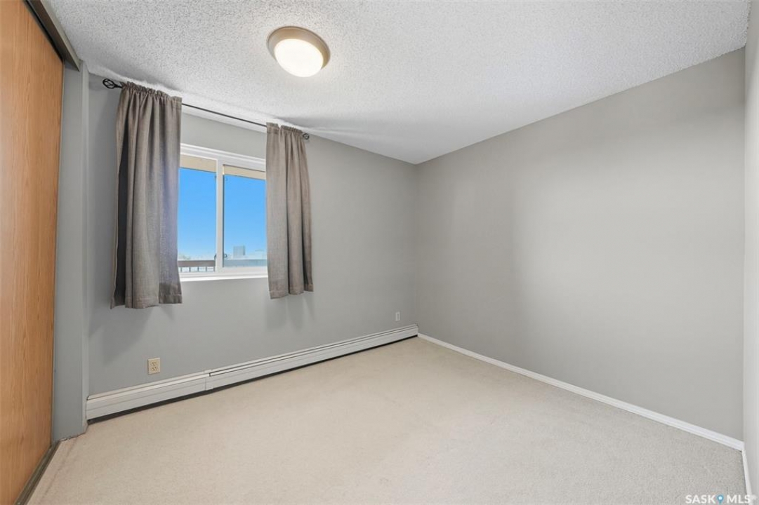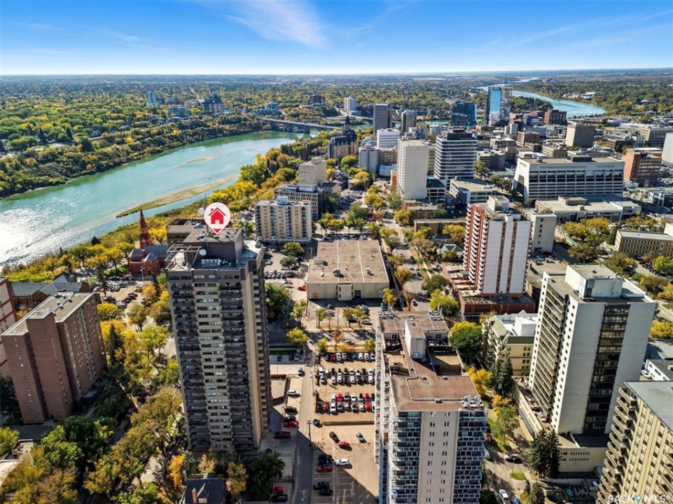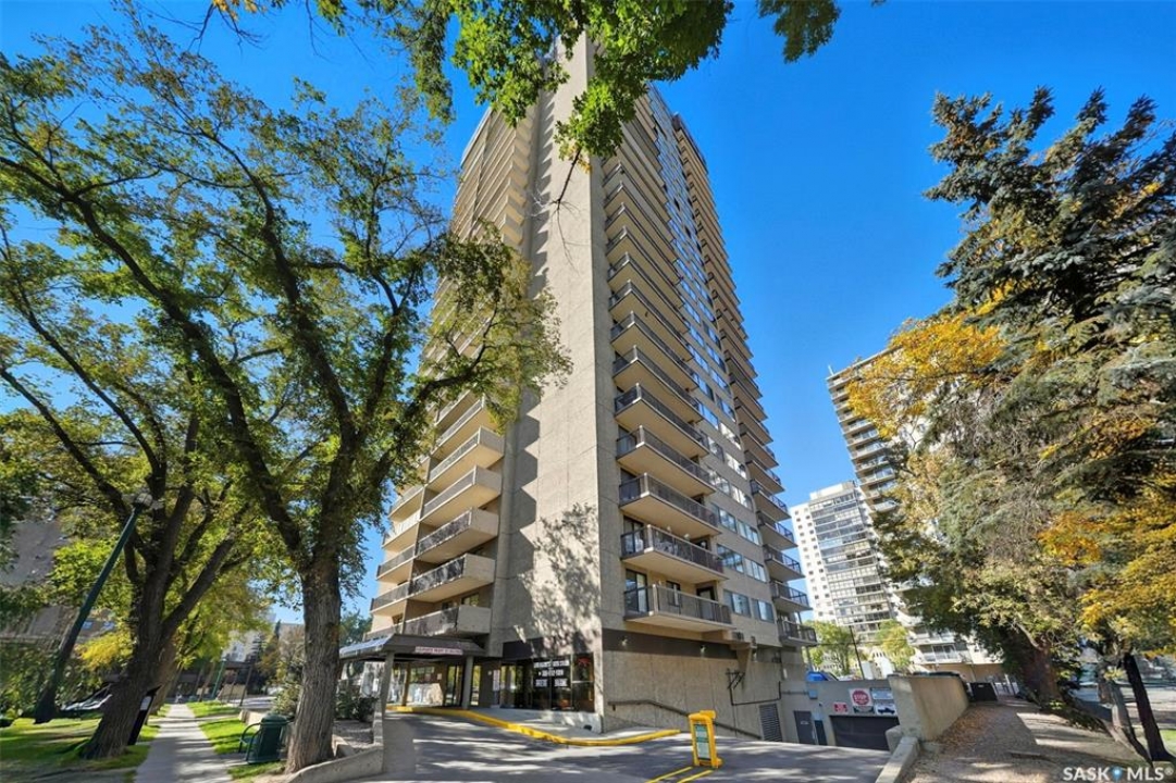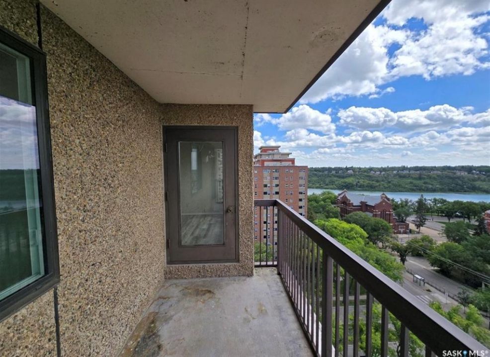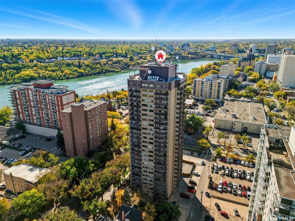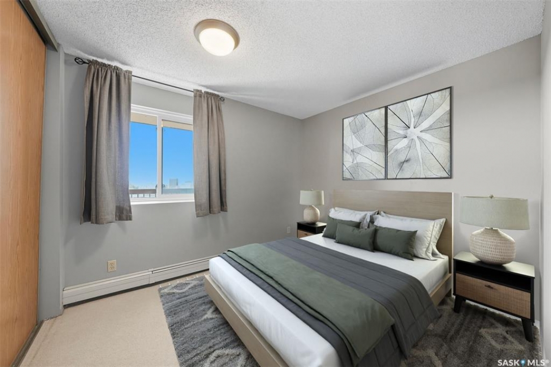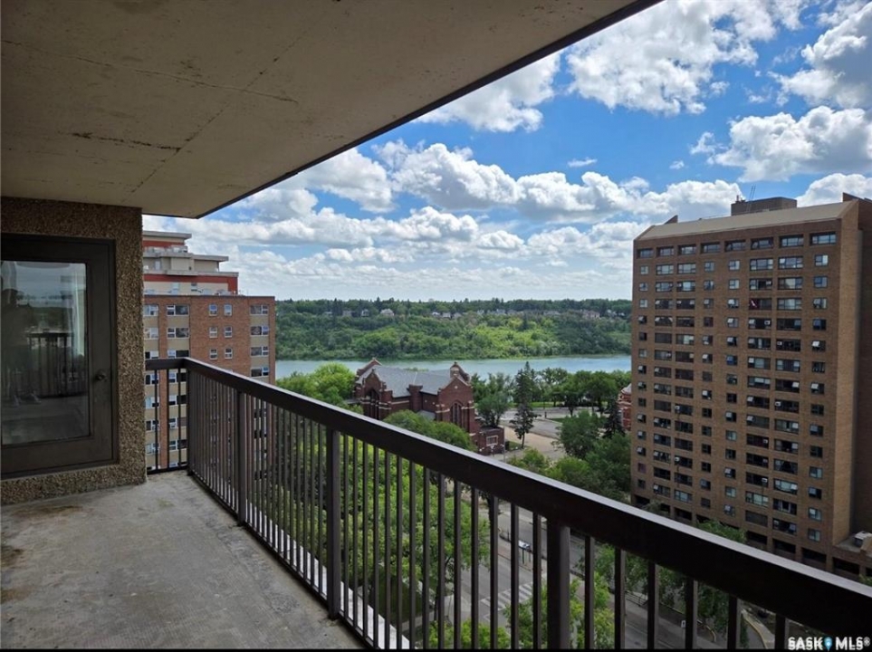 17th floor condo with an AMAZING VIEW of the river and downtown city lights from this sunny, south-facing 2 bedroom and 1 bathroom condo located in the Hallmark Building. The living room has plenty of room and lots of natural light with patio doors to the balcony. The kitchen has plenty of cabinet space and comes with all appliances. The primary bedroom has a spacious walk-in closet and has patio doors to the south facing balcony. The 2nd bedroom is a good size and has a closet. The 4-piece bath is conveniently located beside the primary bedroom and this condo has in-suite laundry. The concrete balcony has space enough for a BBQ and a patio set to enjoy the river views. This condo has all new windows, comes with one underground parking stall and a secure storage room. The 27 storey Hallmark building features a renovated lobby area with new elevators, on-site convenience store, hair salon, fitness facilities with weights, cardio, sauna and a squash/racquetball court. Super convenient downtown location close to the river, U of S and all downtown amenities.