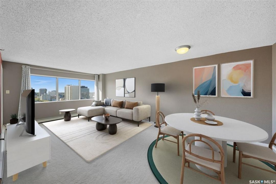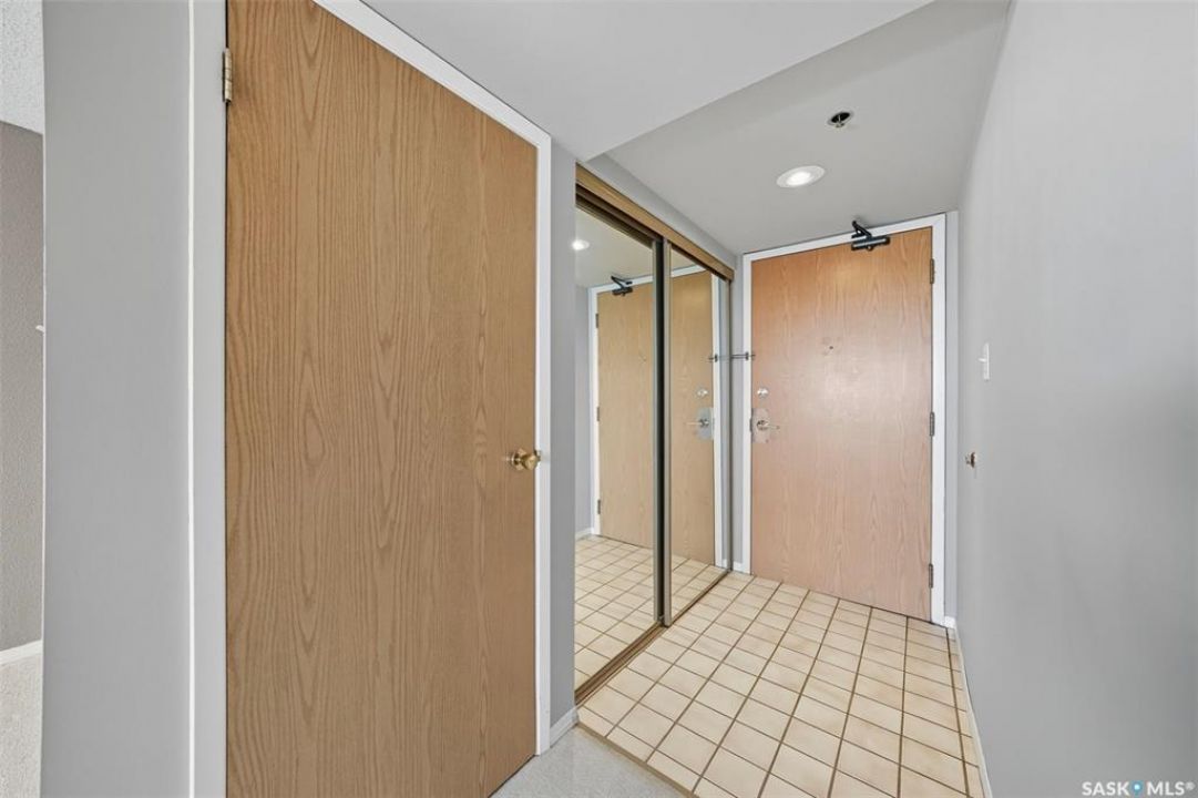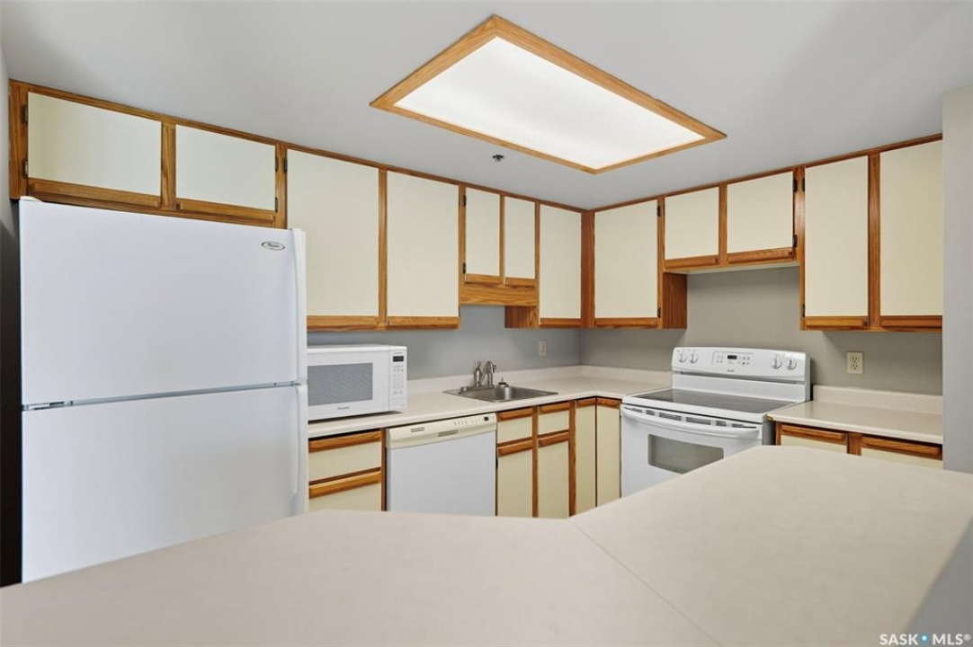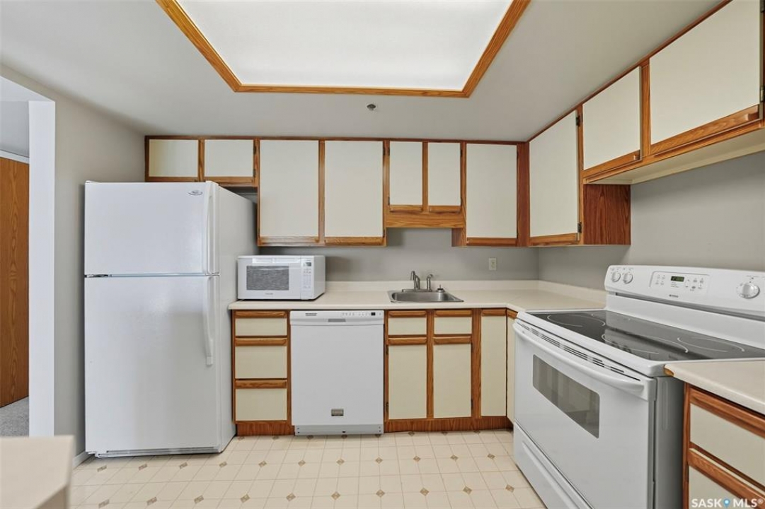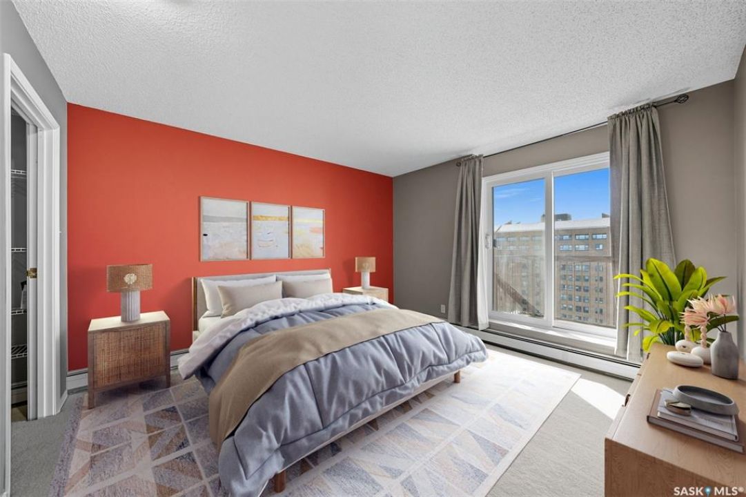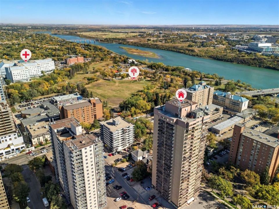 17th floor condo with an AMAZING VIEW of the river and downtown city lights from this sunny, south-facing 2 bedroom and 1 bathroom condo located in the Hallmark Building. The living room has plenty of room and lots of natural light with patio doors to the balcony. The kitchen has plenty of cabinet space and comes with all appliances. The primary bedroom has a spacious walk-in closet and has patio doors to the south facing balcony. The 2nd bedroom is a good size and has a closet. The 4-piece bath is conveniently located beside the primary bedroom and this condo has in-suite laundry. The concrete balcony has space enough for a BBQ and a patio set to enjoy the river views. This condo has all new windows, comes with one underground parking stall and a secure storage room. The 27 storey Hallmark building features a renovated lobby area with new elevators, on-site convenience store, hair salon, fitness facilities with weights, cardio, sauna and a squash/racquetball court. Super convenient downtown location close to the river, U of S and all downtown amenities.