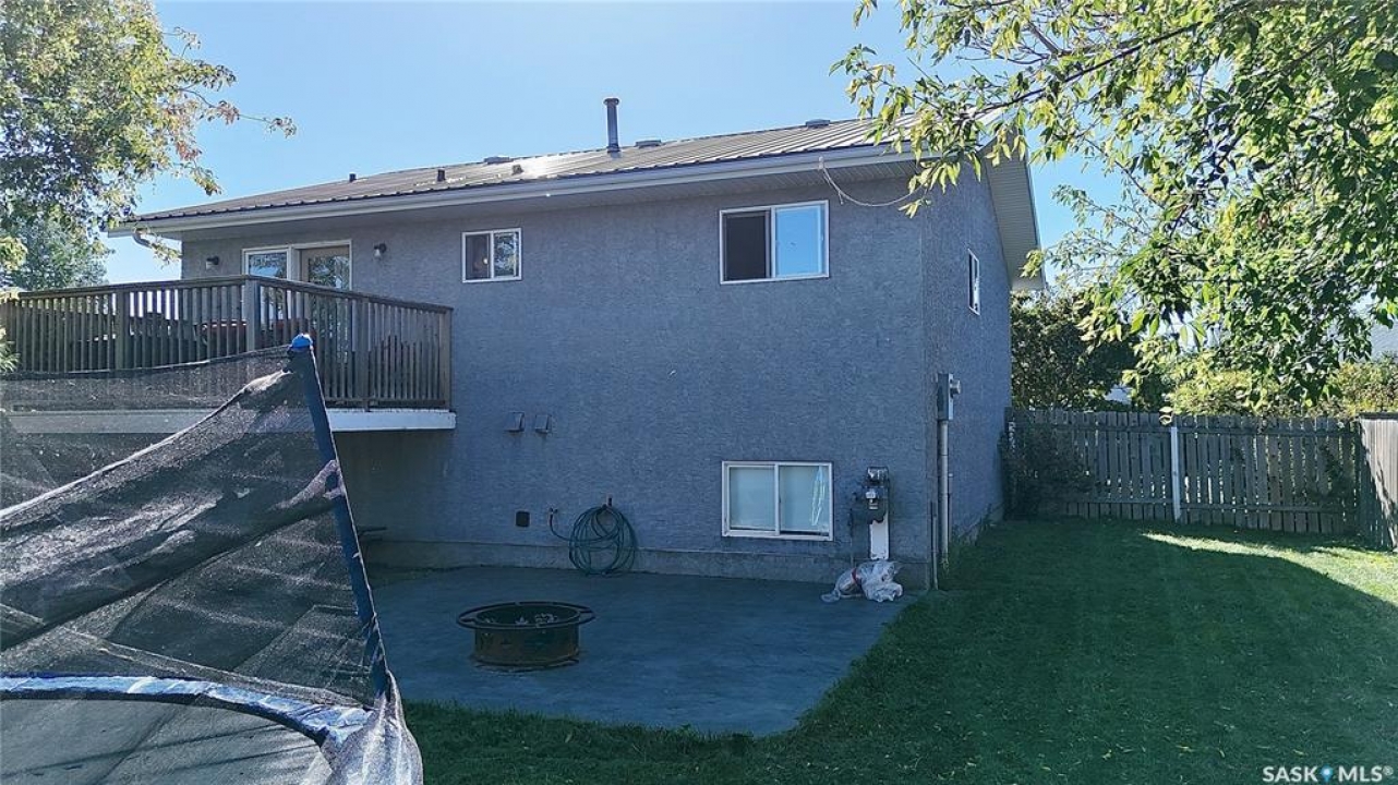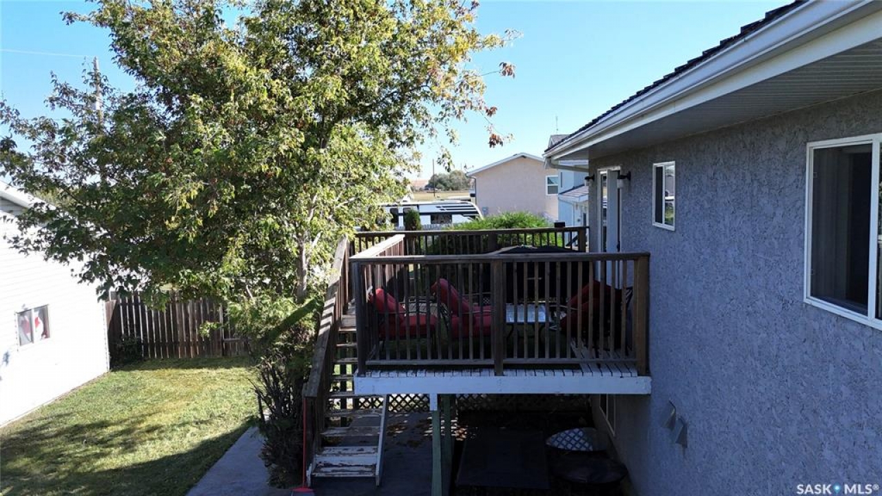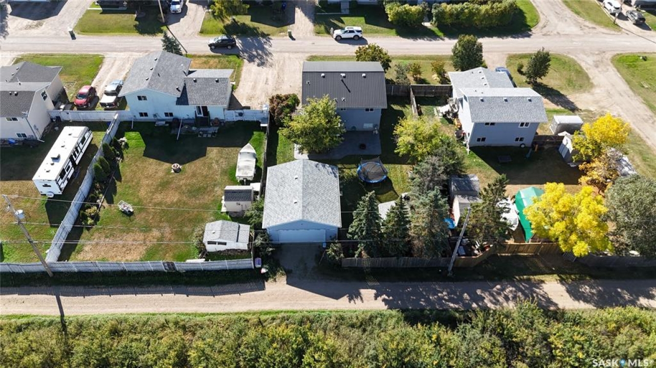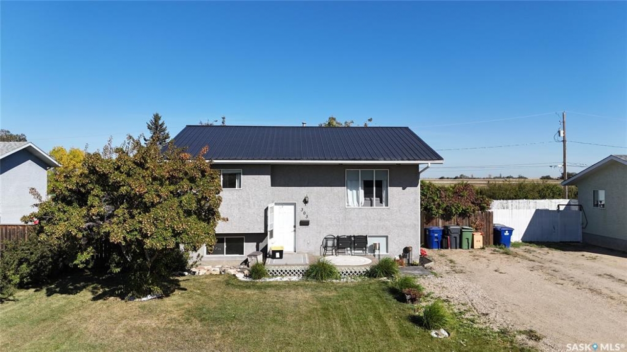 Welcome to 303 4th Street in Dundurn, Saskatchewan. This spacious 984 sq ft bi-level home is located just 30 minutes south of Saskatoon and only five minutes from Blackstrap Provincial Park. Perfect for families, first-time buyers, or anyone looking for more space, this 5-bedroom, 2-bathroom property offers excellent value with room to add instant equity. Set on a 66' x 126' lot, the yard features MATURE TREES, STUCCO SIDING, a METAL ROOF on the house (garage has asphalt shingles), and an OVERSIZED 28' x 24' fully insulated double detached garage. Inside, the bright, functional layout includes a welcoming living room with large SOUTH FACING windows, a kitchen with concrete countertops, white cabinetry, pantry, and stainless steel appliances. The adjacent dining nook opens to the back deck, creating an easy indoor-outdoor flow. Durable laminate flooring is found throughout the home for a clean, modern look. The main floor offers three bedrooms and a full 4-piece bathroom. The fully finished basement adds two more spacious bedrooms, a family room, a 3-piece bathroom, extra storage and laundry/utility space. Recent updates include a washer/dryer, laminate flooring, trim, bathroom fixtures, and the home is equipped with forced-air natural gas heating, an owned furnace, and a gas water heater. Appliances are included, making this home move-in ready. This Dundurn real estate listing backs onto open fields for peaceful prairie views while keeping you close to Saskatoon and Blackstrap Provincial Park. A rare opportunity to enjoy small-town living with modern convenience!