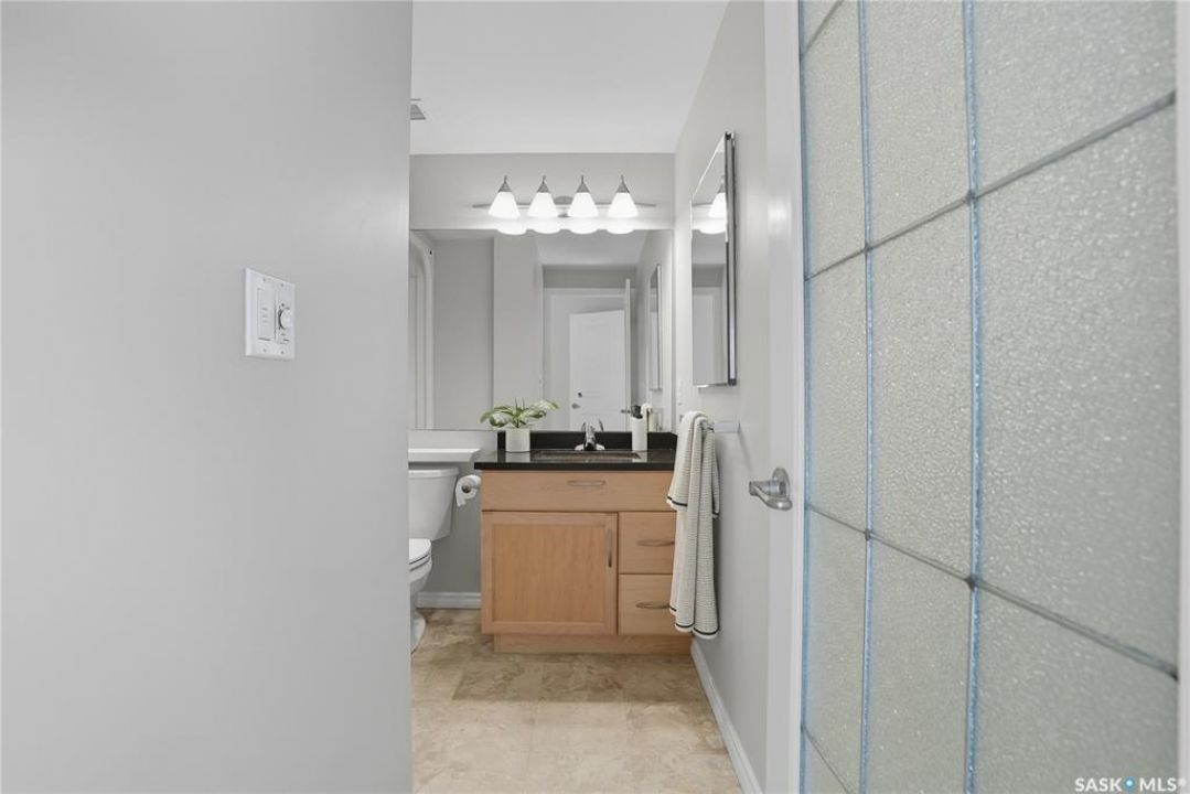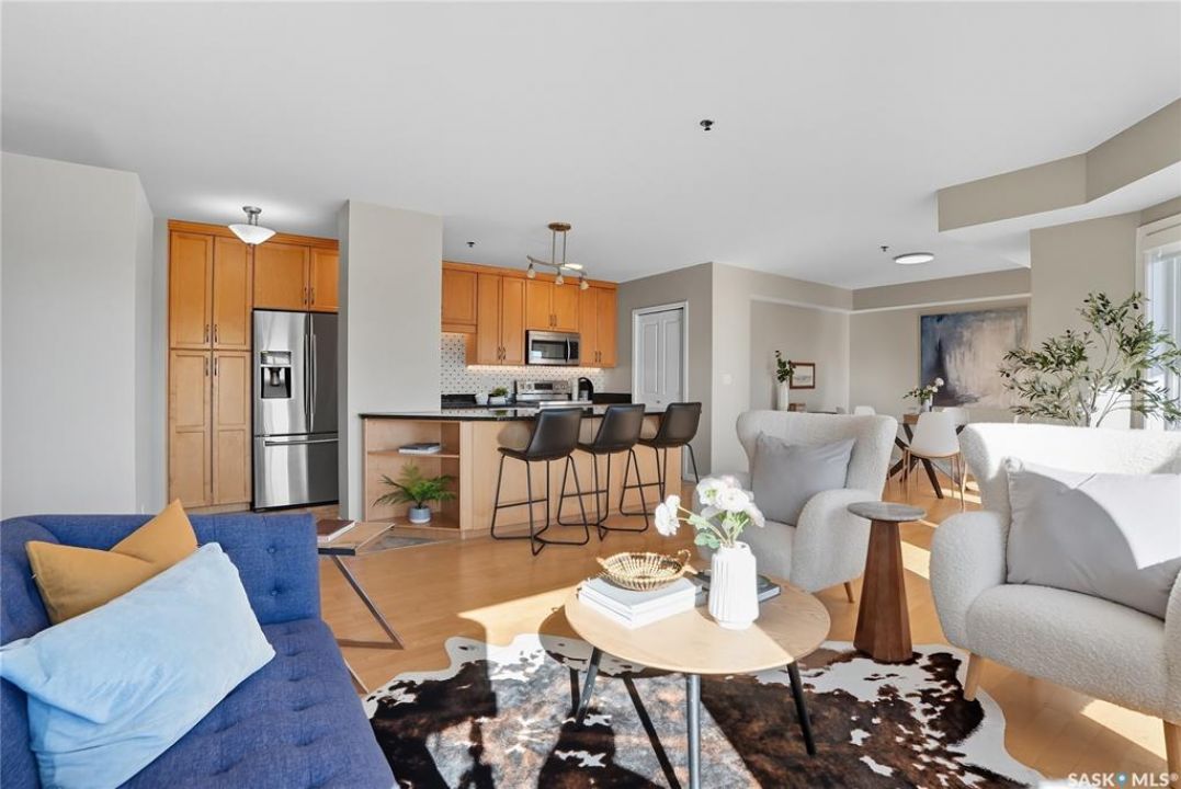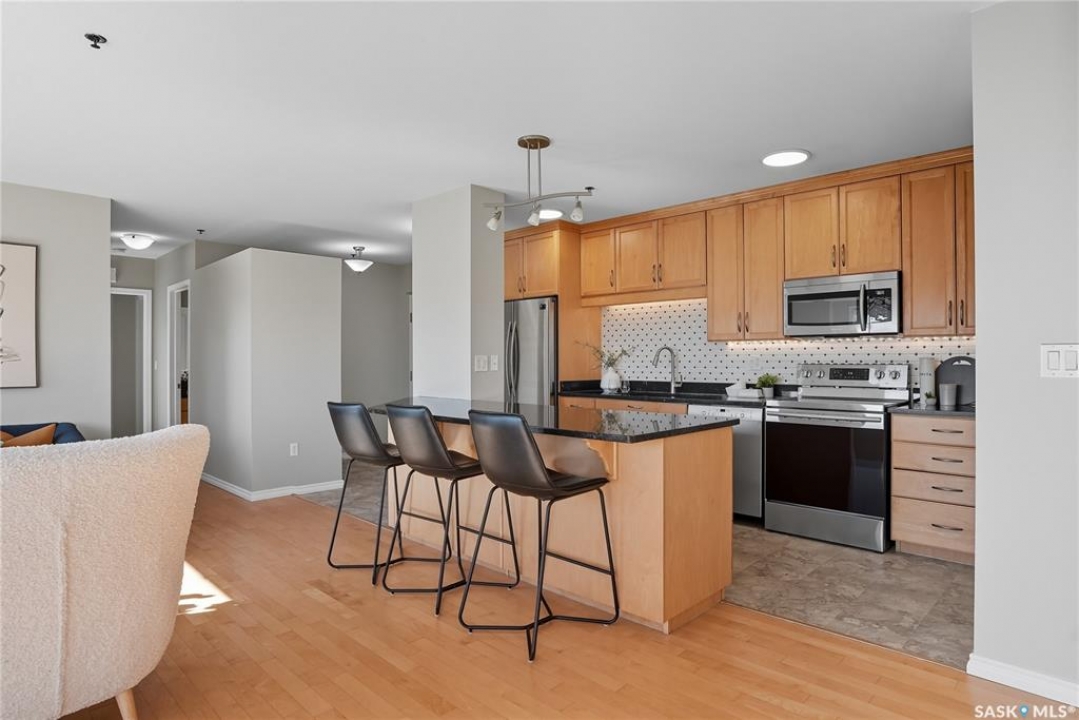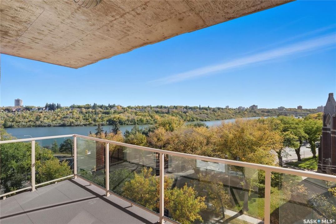 This beautifully maintained downtown condo offers one of the most desirable views in the building, overlooking the scenic river from its south-facing position. Perfectly situated to avoid harsh winds, it sits high enough to offer a stunning perspective above the treetops while remaining closely connected to the vibrant riverbank atmosphere. From your oversized balcony, enjoy a front-row seat to community events like runs, walk-a-thons, and fireworks, and soak in the sounds of live music during the Jazz Festival. Just under 1,200 square feet, the layout includes two spacious bedrooms and two full bathrooms. The bright, open-concept living space is ideal for both everyday comfort and entertaining, anchored by a large kitchen that features granite countertops, a tiled backsplash, and a massive island with additional seating. The adjoining dining area is bright and airy, while the expansive living room benefits from abundant natural light pouring in through the many windows. The generous primary bedroom includes a walk-in closet and a four-piece ensuite, while a second bedroom and additional four-piece bathroom provide ample space for guests or family. The laundry room adds convenience and the independent heating and central air personalized comfort year-round. Step outside your front door and onto the Meewasin River Trail, with direct access to walking and biking paths. Within walking distance of the University of Saskatchewan, Royal University Hospital, City Hospital, and Jim Pattison Children's Hospital. Living downtown means you're surrounded by some of the city's best restaurants, shops, entertainment, and cultural venues—all just steps away. One heated underground parking stall and a heated storage locker are included. Residents also enjoy access to a large amenities room complete with a kitchenette, pool table, lounge area, and a deck with BBQ. Exercise room is included in the condo fees, and for visiting friends or family, guest suites are available to rent.