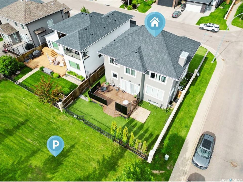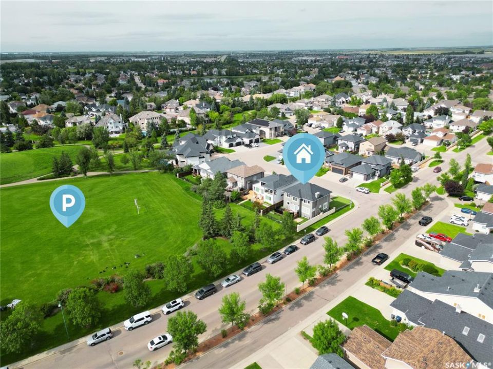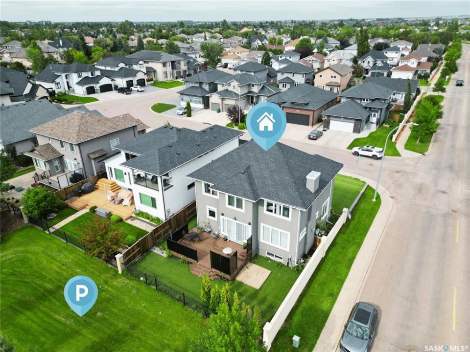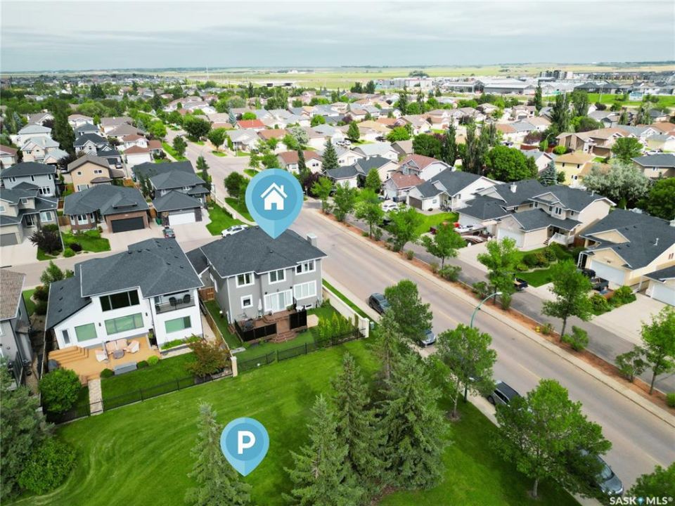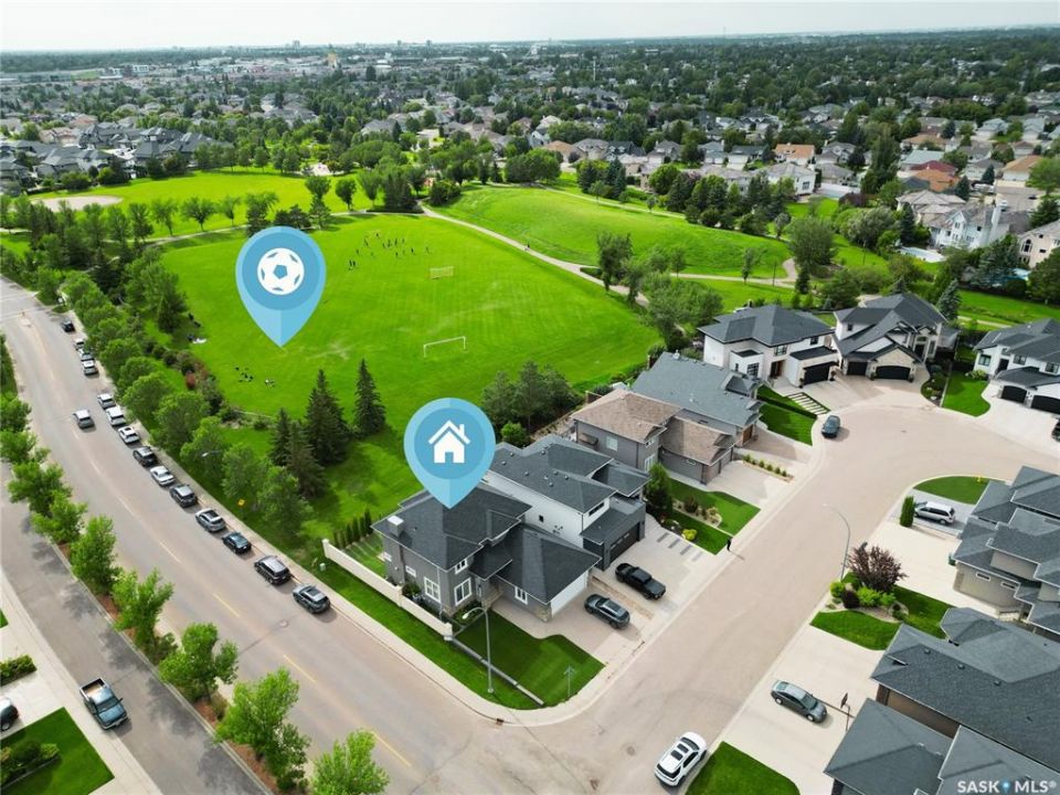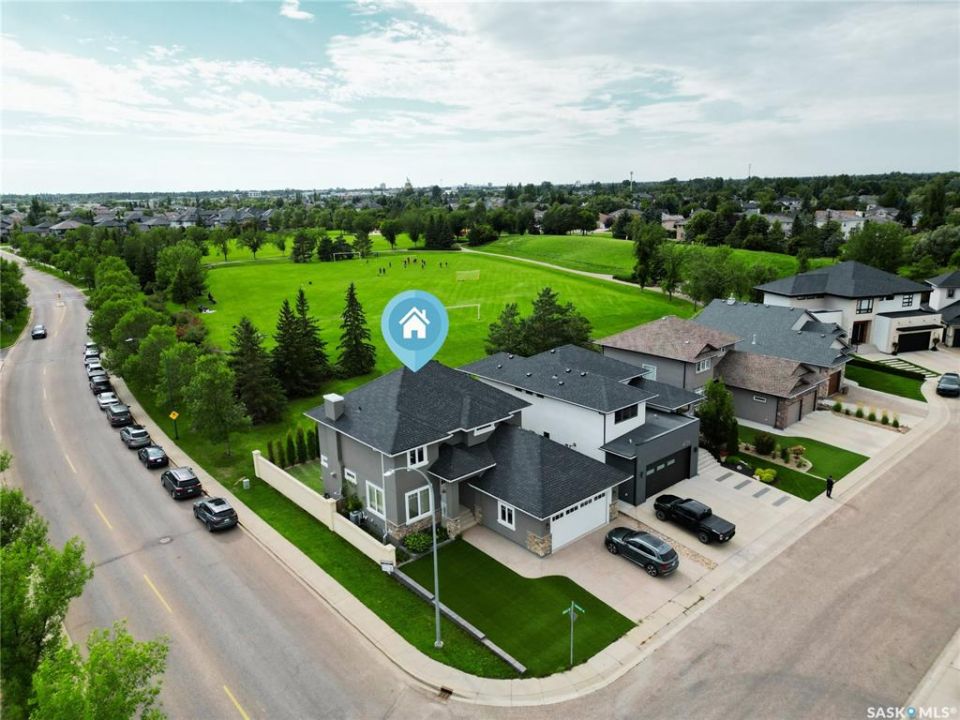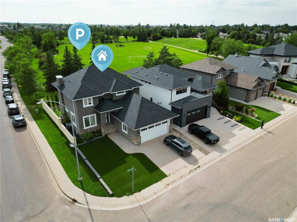 Welcome to this beautifully designed 2,434 sq. ft. two-storey home, custom built by Valentino Homes, offering timeless elegance, high-end finishes, and a premium location backing directly onto Arbor Creek Park. Upon entry, you are greeted by 9-foot ceilings, solid 8-foot core interior doors, Restoration Hardware lighting, and an abundance of natural light flowing through wide windows. The open-concept main floor showcases a spacious living room with a natural gas fireplace and custom cabinetry, seamlessly connected to the dining area and a stunning white kitchen featuring quartz countertops, island with seating, corner pantry, and premium JennAir appliances. A main floor office with French doors, a powder room, and a functional mudroom with direct access to the heated 24x25 double garage (10' ceiling) complete this level. Upstairs, the luxurious primary suite offers a walk-in closet the size of a room and a spa-like ensuite with heated tile floors, dual vanities, an oversized walk-in shower, and private water closet. Two additional large bedrooms with park views and hardwood floors, a 4-piece bath, and a bright laundry room with a window provide comfort and convenience for family living. The fully finished basement is designed for entertainment and relaxation, featuring a massive family room with projection screen, custom wet bar, a fourth bedroom, full bathroom, and plenty of storage space. Additional highlights include hand-scraped hardwood floors, built-in audio with Control4 system, custom blinds, and 9-foot ceilings on all three levels. The low-maintenance south/west-facing backyard offers private gated access to Arbor Creek Park, making it perfect for peaceful walks and enjoying stunning views year-round. This is an exceptional opportunity to own a truly remarkable home in one of Saskatoon's most desirable neighborhoods.