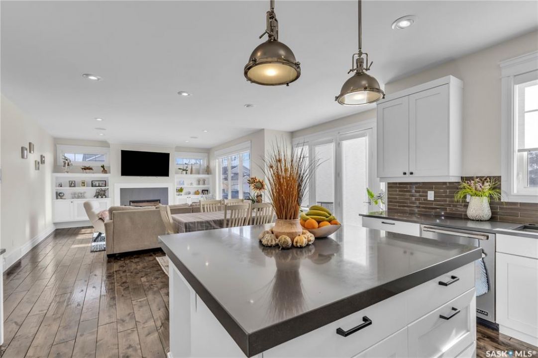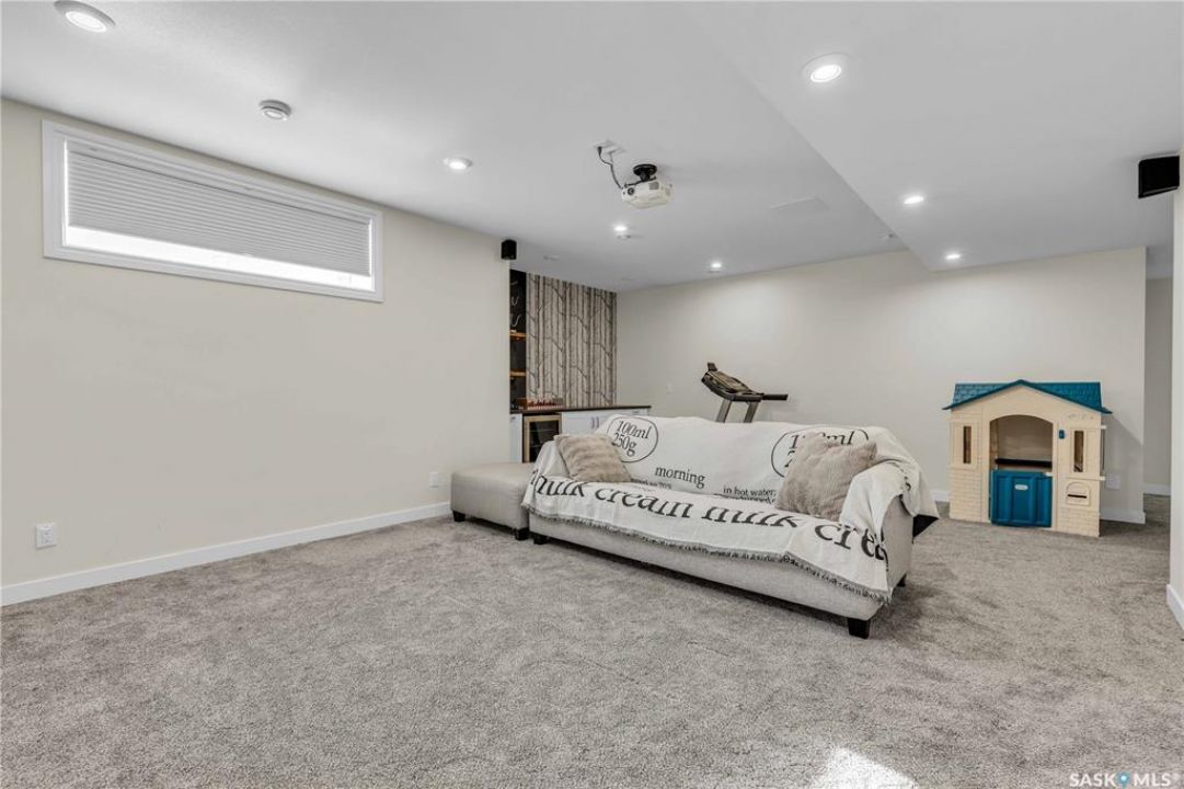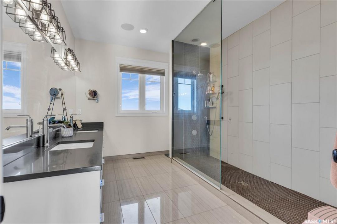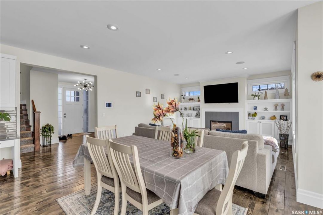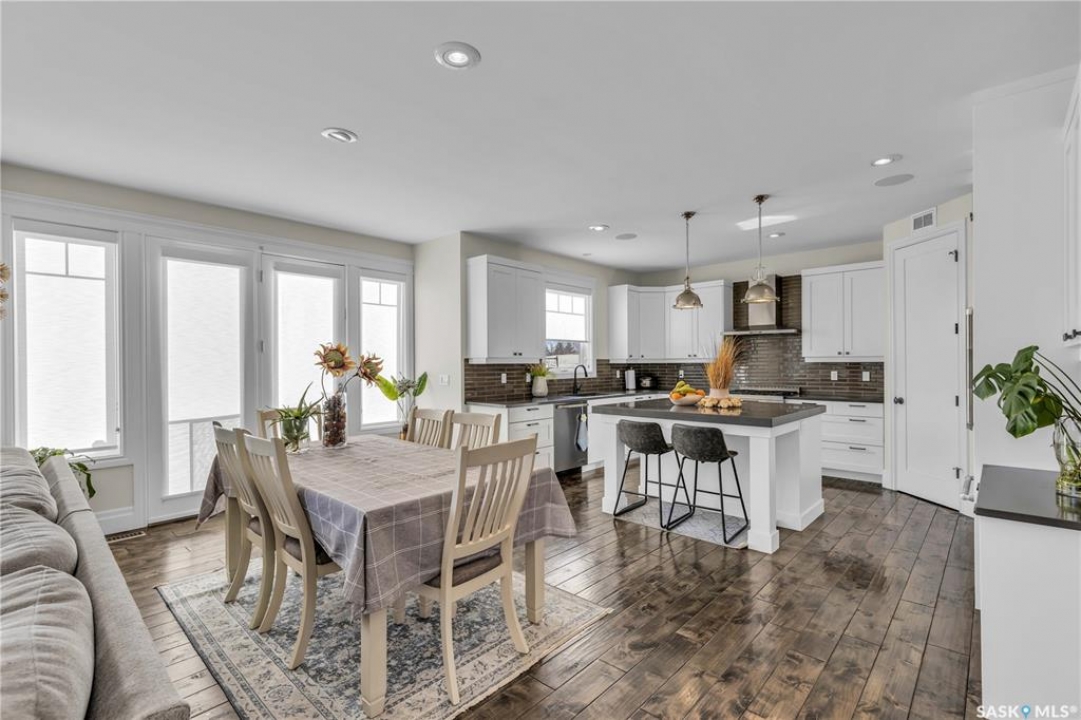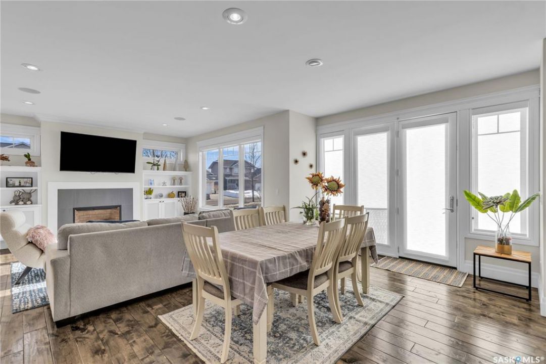 Welcome to this beautifully designed 2,434 sq. ft. two-storey home, custom built by Valentino Homes, offering timeless elegance, high-end finishes, and a premium location backing directly onto Arbor Creek Park. Upon entry, you are greeted by 9-foot ceilings, solid 8-foot core interior doors, Restoration Hardware lighting, and an abundance of natural light flowing through wide windows. The open-concept main floor showcases a spacious living room with a natural gas fireplace and custom cabinetry, seamlessly connected to the dining area and a stunning white kitchen featuring quartz countertops, island with seating, corner pantry, and premium JennAir appliances. A main floor office with French doors, a powder room, and a functional mudroom with direct access to the heated 24x25 double garage (10' ceiling) complete this level. Upstairs, the luxurious primary suite offers a walk-in closet the size of a room and a spa-like ensuite with heated tile floors, dual vanities, an oversized walk-in shower, and private water closet. Two additional large bedrooms with park views and hardwood floors, a 4-piece bath, and a bright laundry room with a window provide comfort and convenience for family living. The fully finished basement is designed for entertainment and relaxation, featuring a massive family room with projection screen, custom wet bar, a fourth bedroom, full bathroom, and plenty of storage space. Additional highlights include hand-scraped hardwood floors, built-in audio with Control4 system, custom blinds, and 9-foot ceilings on all three levels. The low-maintenance south/west-facing backyard offers private gated access to Arbor Creek Park, making it perfect for peaceful walks and enjoying stunning views year-round. This is an exceptional opportunity to own a truly remarkable home in one of Saskatoon's most desirable neighborhoods.