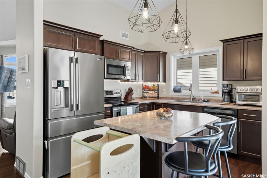 Welcome to this inviting and beautifully maintained 4-bedroom, 3-bathroom raised bungalow offering over 2,200 sq. ft. of finished living space- designed for family living. Updated inside and out, this home is move-in ready and perfect for families or anyone who loves to entertain. The main floor features 3 generously sized bedrooms, including a primary suite with walk-in closet, as well as its own three-piece en-suite bathroom for added privacy and comfort. A beautifully updated main bathroom and the convenience of upstairs laundry make everyday living that much easier. The bright and welcoming living area is highlighted by charming feature walls that add warmth and character, while the kitchen flows seamlessly into the dining space and out to the back deck. With a natural gas BBQ hook-up, it's the perfect spot for family meals and summer gatherings. Downstairs, you'll find a fully finished basement which provides even more space with the perfect hangout spot. Including, a large utility room for ample storage, a spacious and cozy family room, large 4th bedroom, full bathroom completed with an oversized shower and a newly added dry bar that's ideal for entertaining friends or having cozy family movie nights. Outside, the home shines with a fully vinyl fence and landscaped yard- ready for kids and/or pets. The private backyard is an ideal retreat for relaxing or hosting- complete with refreshed landscaping, a refinished deck, a gazebo for shade, and a shed for extra storage. The heated garage provides plenty of storage, as well as year-round convenience and comfort- especially during our cold winters. Updates throughout—including the bathrooms, laundry room, and outdoor spaces—ensure this home completely move-in ready. This home blends comfort, style, and functionality in a family-friendly neighbourhood and is walking distance to all amenities including the Golf Course. This is the kind of home where family memories are made- don't miss the chance to make it yours!