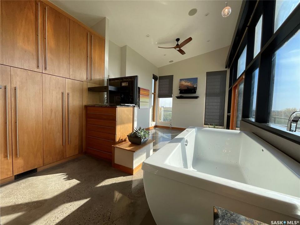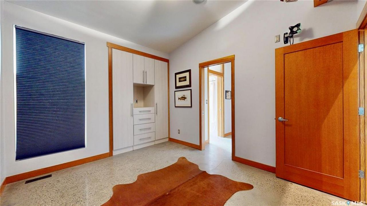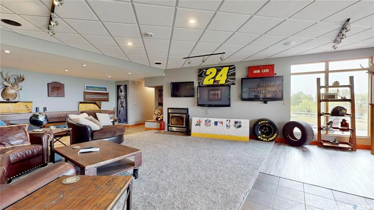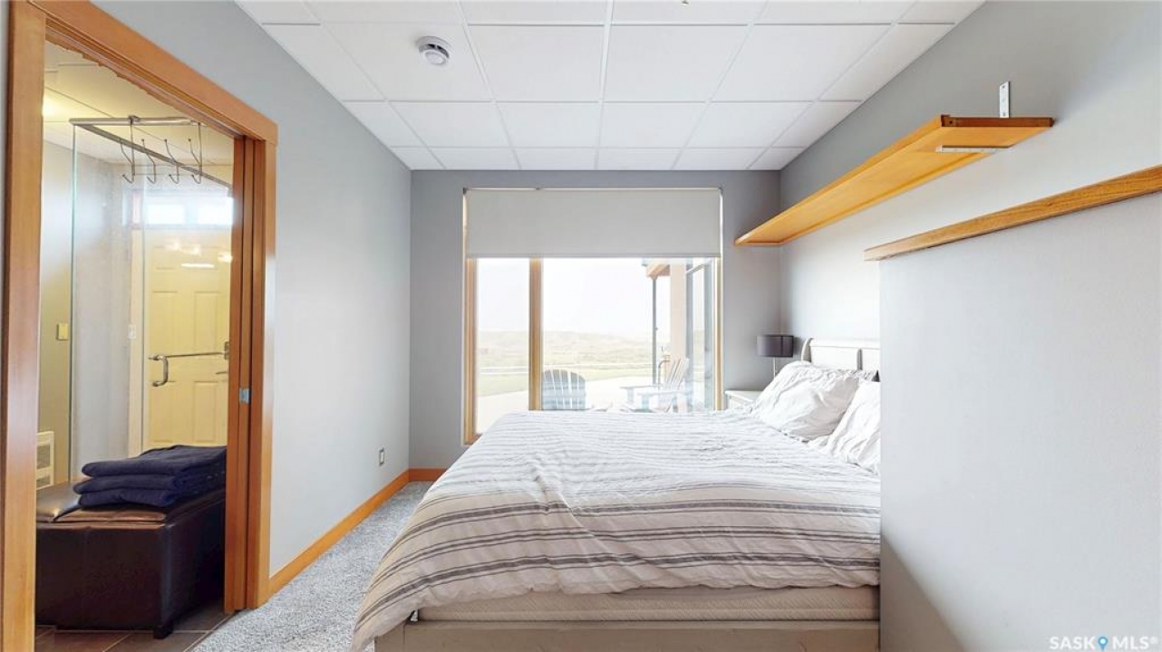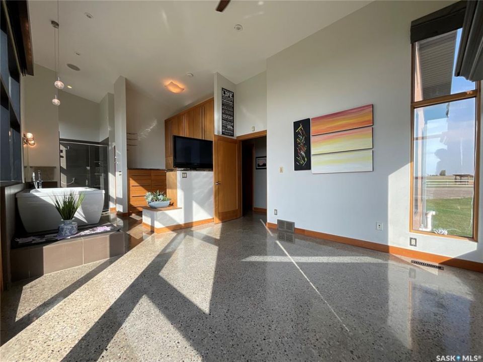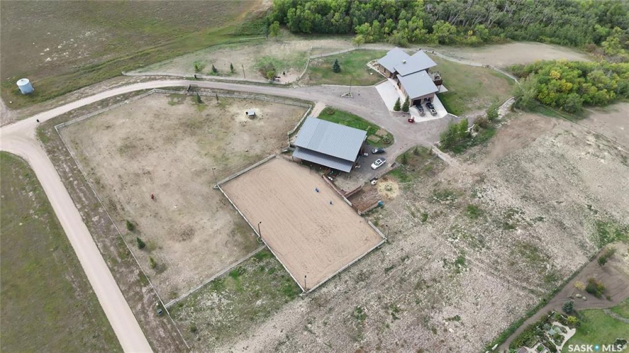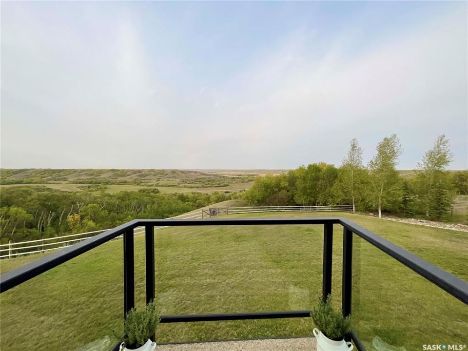 Experience 40 Apollo Drive in the Acreages at Minerva Ridge near Lumsden Sask. From the powered gate and lit lane this 5 bedroom ,5 bath home offers 3982 sq. ft. on the main plus a full walkout level, including a private entrance suite for extended family or caregiver. Floor-to-ceiling curtain wall windows showcase the Wascana and Qu'Appelle valleys. filling the home with light. Built for comfort and efficiency, the home features zoned in-floor hydronic heating, hight-efficiency boiler, gas furnace with A/C backup,sprayfoam insulation, EIFS stucco, triple-pane argon windows, and a 12.6 kw Solar system powering both house and barn-keeping costs near net zero. The kitchen includes a built-in gas cooktop,doublewall oven, drawer microwave, fridge, dishwasher, and butler's pantry with upright freezer and extra fridge. A mudroom with built-ins sits just off the garage. Technology upgrades include RA2 automation for blinds, lights, climate and locks, whole-home audio, five video screens, Ring security, and 8 camera CCTV system and permanent holiday lights. The lower level adds a wet bar, games area, and gym with overhead door for fresh air workouts. Outside, enjoy a covered patio with built -in barbeque,8 person hot tub, and heater. A heated 1,080sq.ft. garage and 35x70 insulated barn/shop provide storage, stalls, tack room, hay loft, and heated workshop. Equine features include a outdoor lit riding arena, two fenced pastures with solar fencing and automatic water systems. Extras include a reinforced secure room,200-amp service, water softener and custom cold storage. Lumsden's schools and amenities are minutes away, with Regina only a 15 minute drive. Purchasers also have first right of refusal on the adjoining 3 Acre parcel