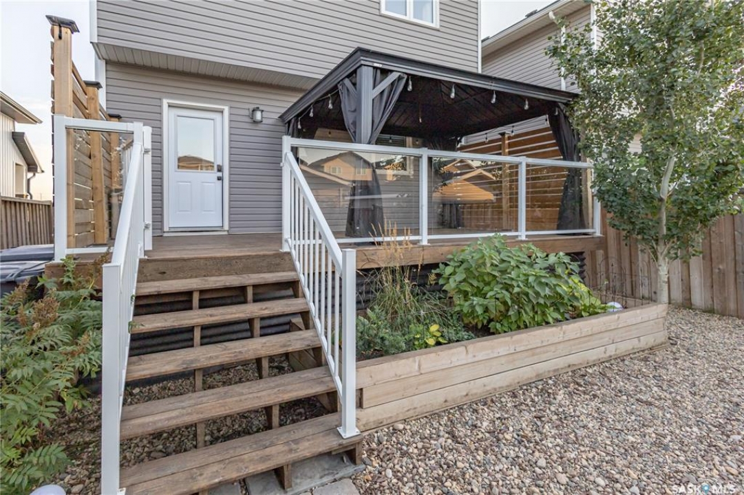 Welcome to 1445 Besnard Drive built by Edison Homes in Martensville. This beautiful home an open concept main living area with laminate flooring, large kitchen with an abundance of counter space, pantry, large island and tile backsplash, complimented with quartz countertops throughout. The back entry has a mud room area and 2 piece bath. The dining room is an alcove style dining; and large walk in closet at the front door. The second level features a large primary bedroom with 4pc ensuite and a large walk in closet. Two additional bedrooms, a 4 piece bath and full laundry room completes the upper level. There is direct entry to the basement which has been developed as a "mother in law" suite with a kitchen, living room, laundry, bedroom and 4pc bathroom. This home has great street appeal featuring a craftsman style exterior with extensive stone accents and oversized front pillars, concrete front sidewalk with sod, a xeriscape back yard with large deck (gazebo & shed included), a double detached garage which is partially insulated and is wired and ready for heat & a 220 amp. This home is located within a short distance to the new elementary school. All appliances & window coverings included. Immediate possession preferred. Buyer/Buyer's agent to verify measurements. Call to book your viewing today.
