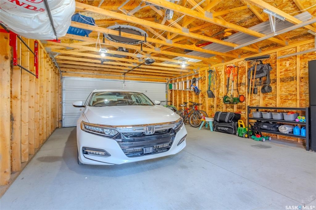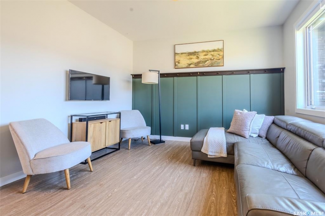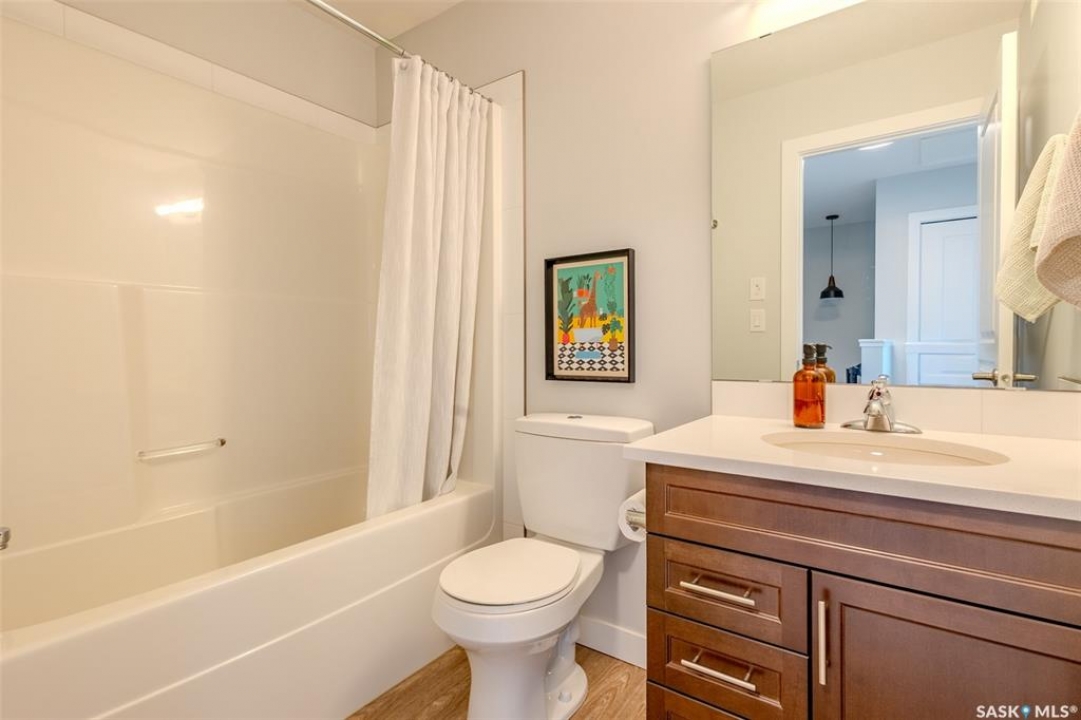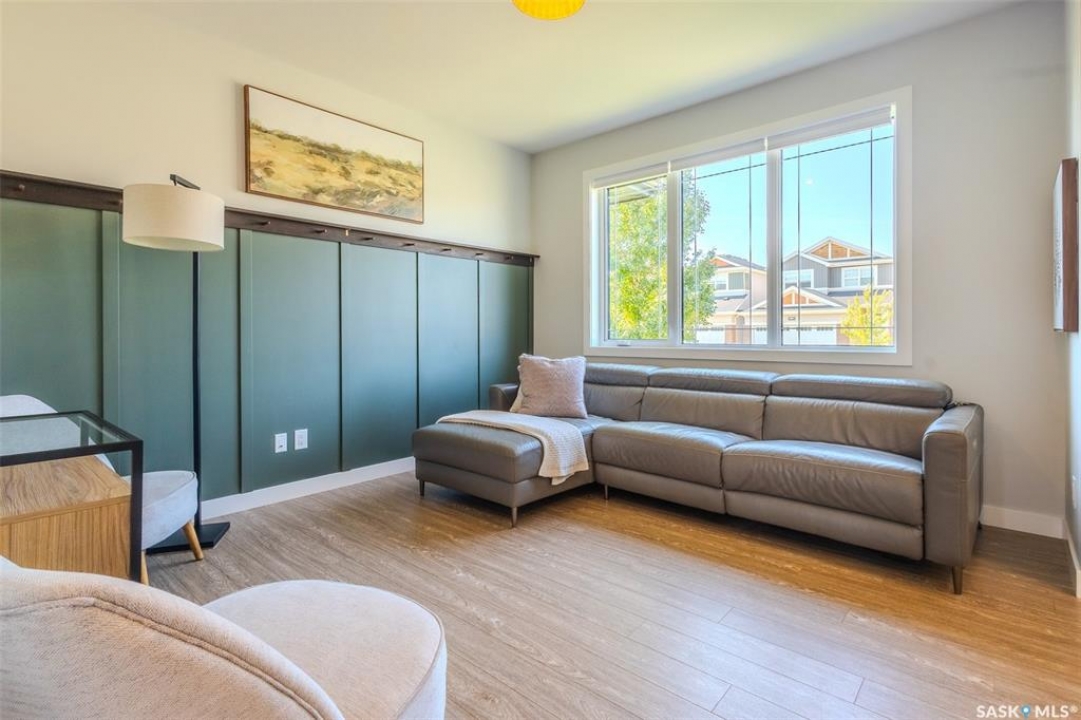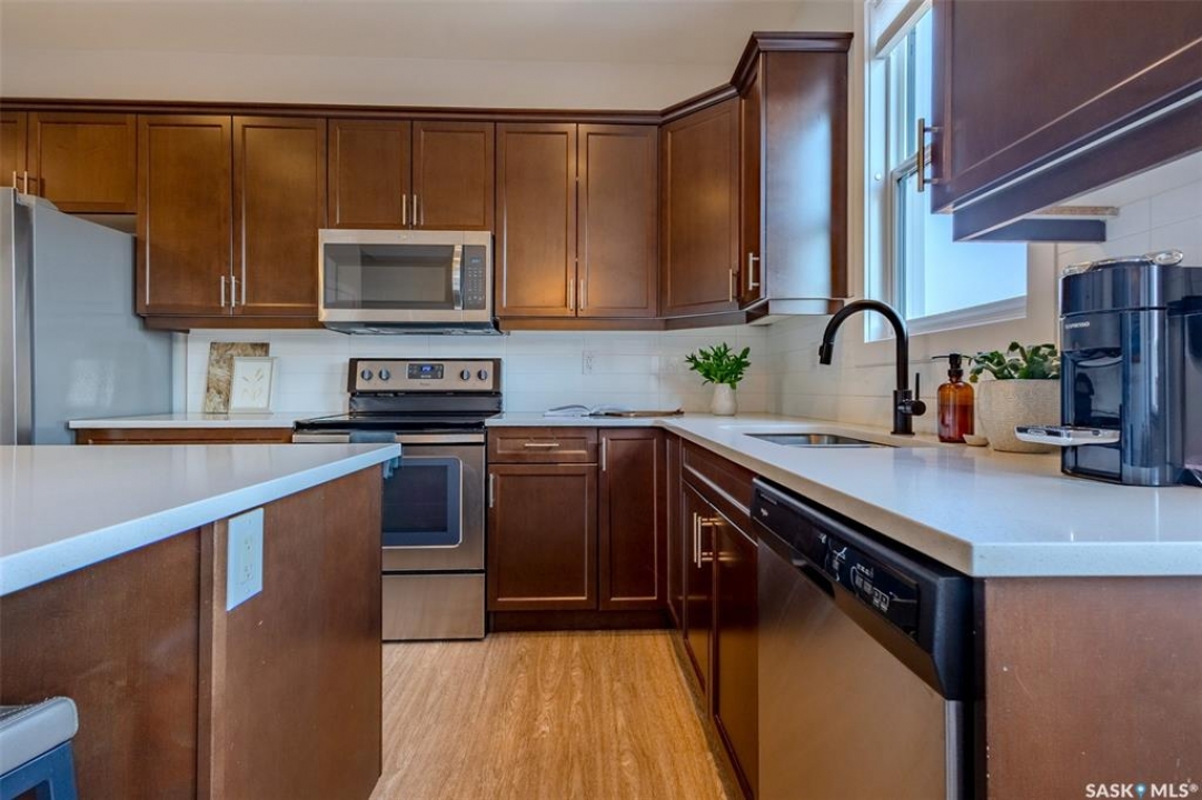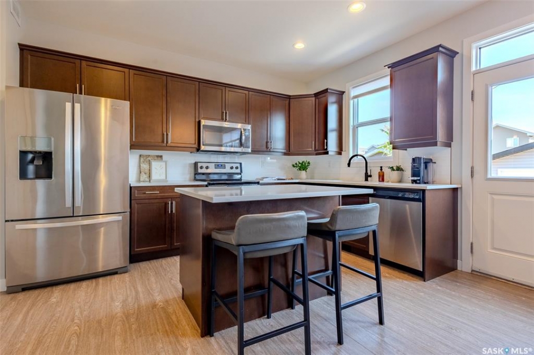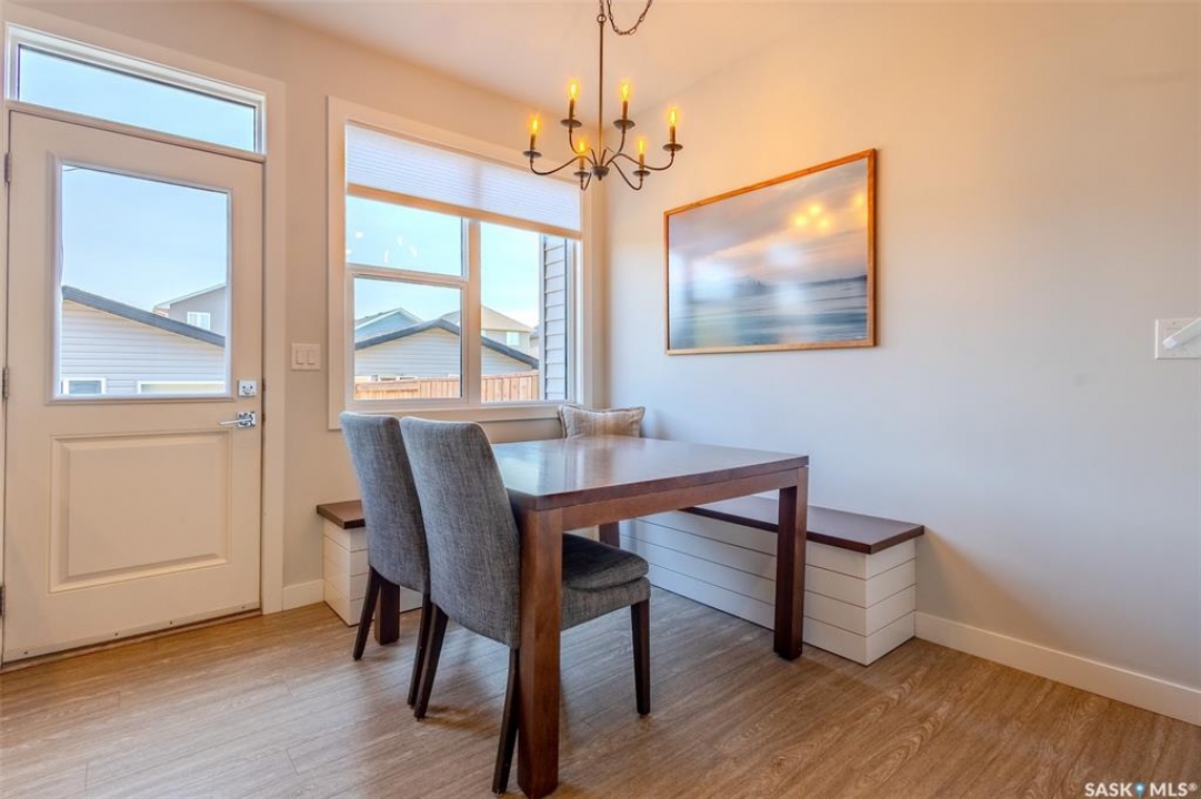Welcome to 1050 Kolynchuk Crescent in the desirable Stonebridge neighborhood! Step inside to 9' ceilings and a welcoming living room accented with a stylish board and batten feature wall, along with a conveniently located half bath. At the back of the home, the kitchen overlooks the backyard and offers quartz countertops, a tile backsplash, pantry, eat-up island, double undermount sink, built-in dishwasher, and microwave hood fan. A bright dining nook with custom bench seating completes the main floor. Upstairs you'll find three bedrooms and a full bathroom. The primary suite includes a large window and a 4-piece en-suite. The fully developed basement extends your living space with a cozy family room/rec area, additional bedroom, 3-piece bathroom, and laundry. Outside, the backyard has been thoughtfully landscaped with a patio, fireplace, and garden boxes. An 18' x 26' detached garage provides off-street parking and extra storage. Additional features include central air conditioning and underground sprinklers for added comfort and convenience. Call your Realtor today to book a private showing!