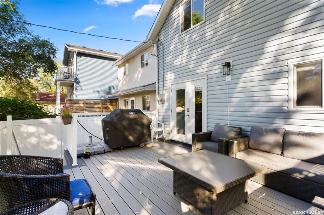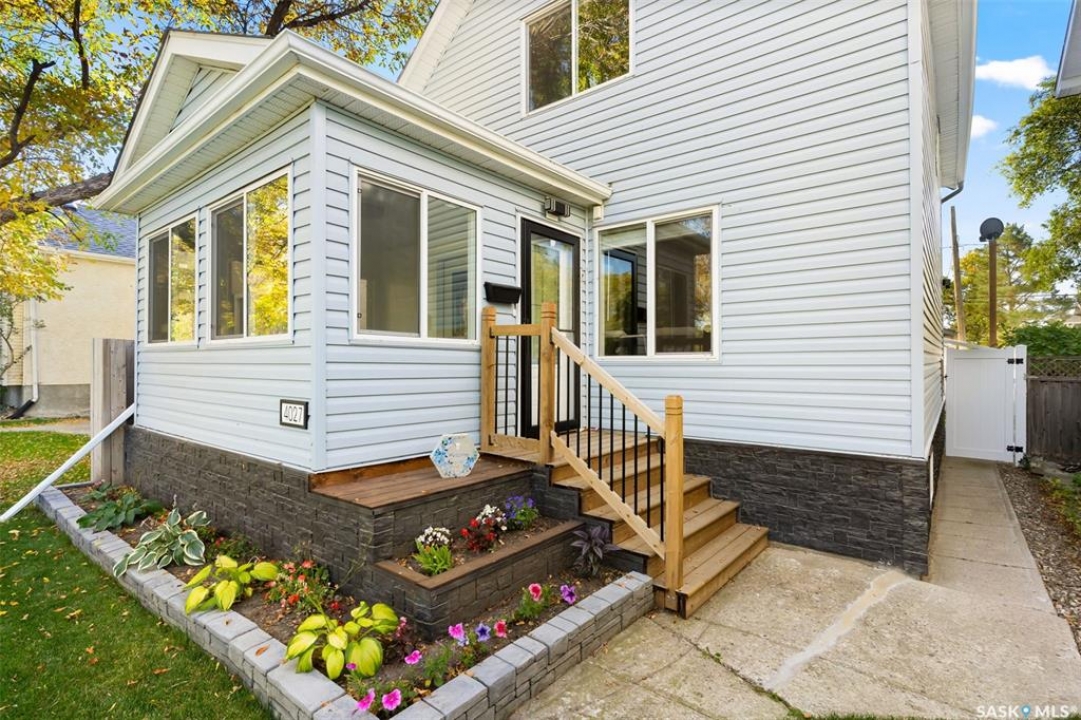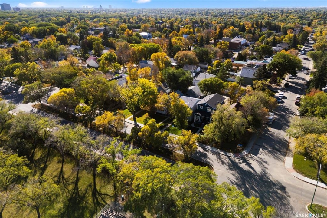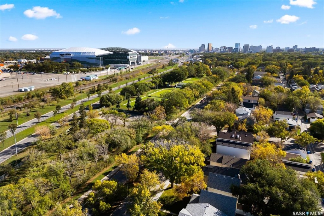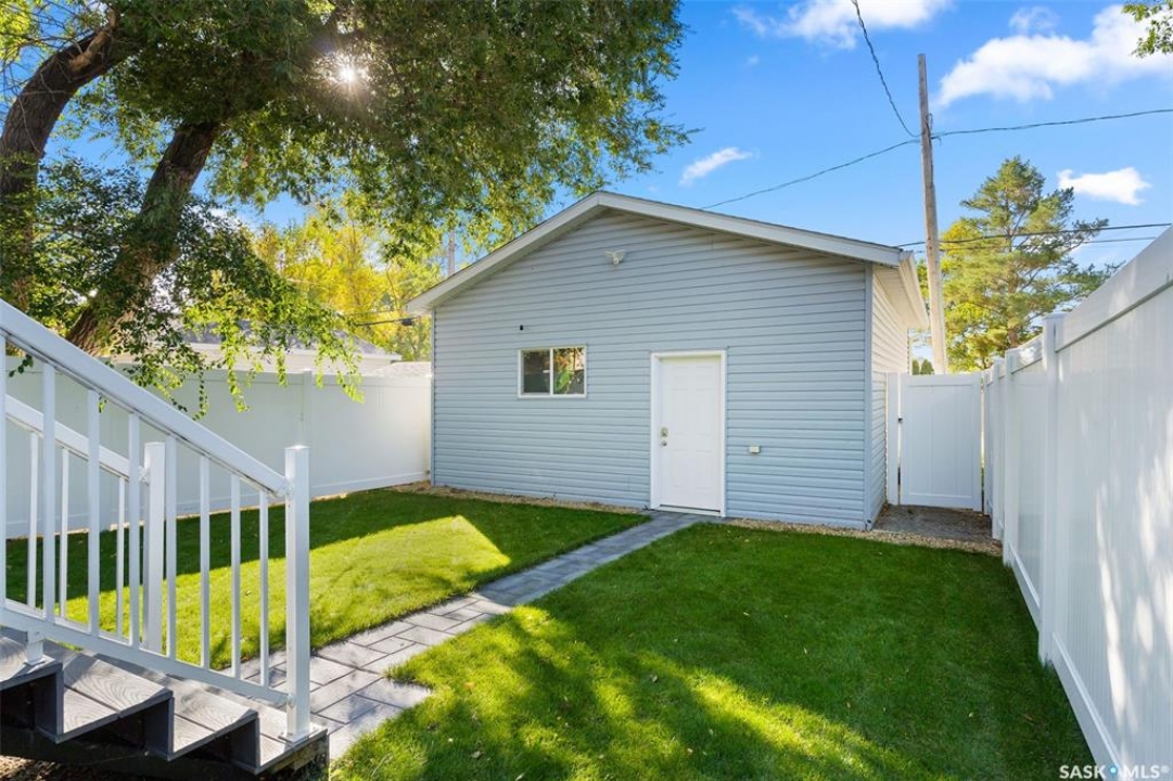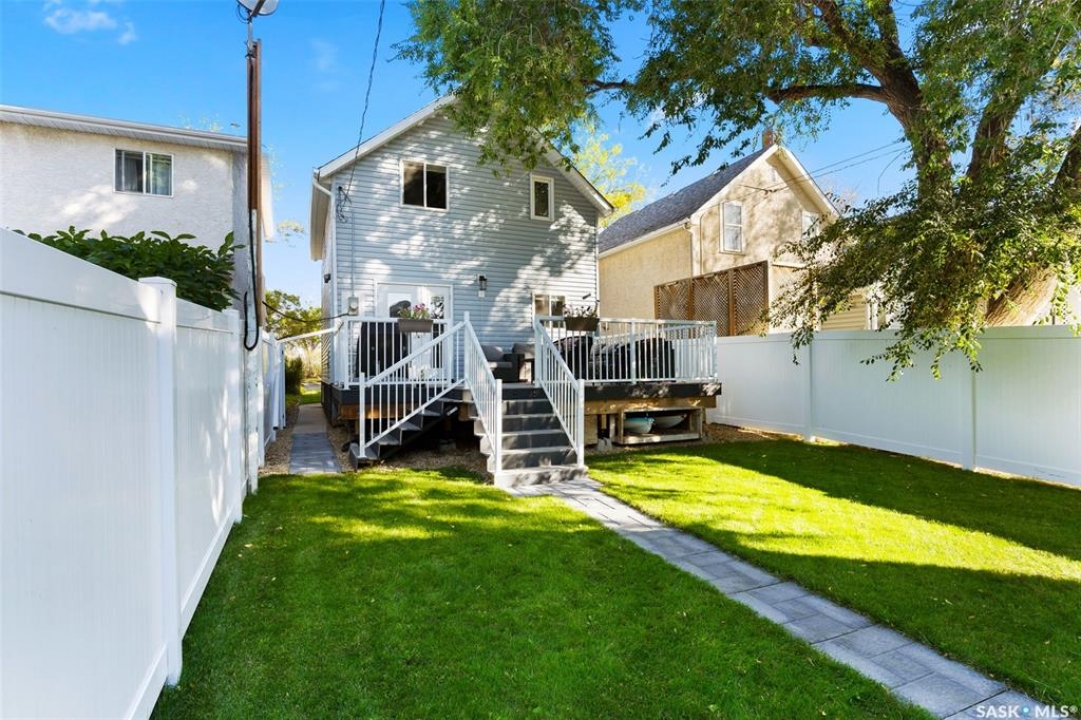 Nestled in the heart of the Historic Cathedral neighbourhood and perfectly positioned across from a lush green space, this charming and thoughtfully updated home blends character with modern convenience. Step into the bright, recently remodeled sunroom that faces the park—wired for electricity and built on screw piles—offering a cozy retreat with a view. The peninsula kitchen is a standout, featuring newer cupboards, crisp white cabinetry, a stylish herringbone tile backsplash, stainless steel appliances including a fridge with ice and water, and elegant pendant lighting. Throughout the home, you'll find all new fixtures, pot lights, fresh trims, and newer PVC windows that flood the space with natural light. Built-in speakers enhance the kitchen, dining area, and both upstairs bedrooms. The upper level hosts a spacious principal bedroom with a walk-in closet, a second bedroom, and a beautifully updated four-piece bath complete with a deep soaker tub and tile surround. Downstairs, the newly poured concrete slab is complemented by reinforced walls, and spray foam insulation throughout. The basement also features a new 100 amp panel with ample capacity, a laundry area, a cozy space ideal for a TV room, and a convenient two-piece bathroom. Outside, enjoy the expansive 14 x 20 composite deck with aluminum railing, a unique garden shed on the east side, and underground sprinklers in the backyard. The 22 x 26 heated and insulated garage, built in 2008 and finished with OSB, adds even more value, along with newer shingles on the house for peace of mind. This fine property is close to parks, bus routes, Mosaic Stadium and all Downtown amenities. Call your Relator for more information or personal tour.