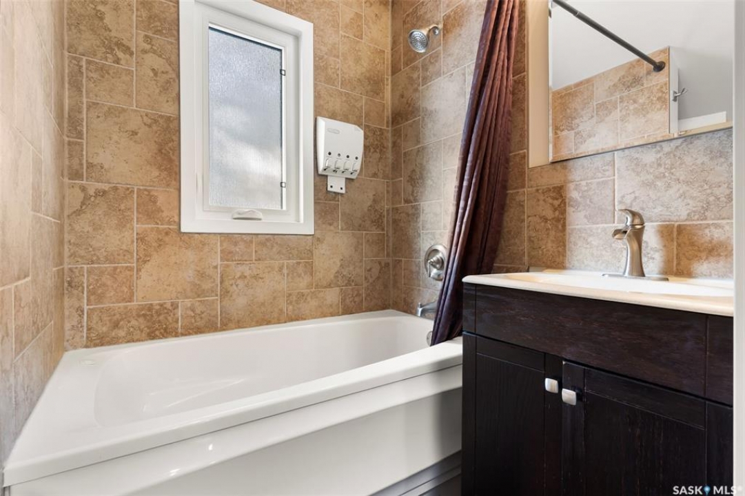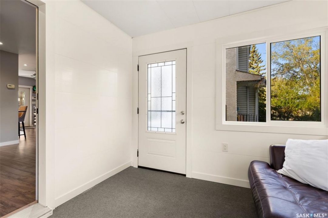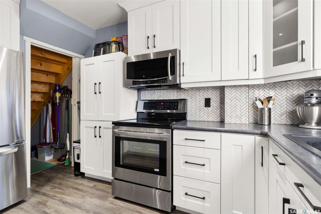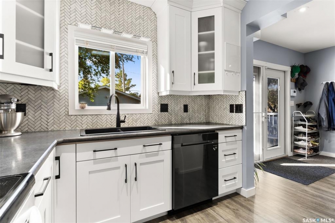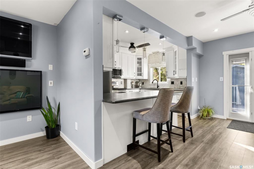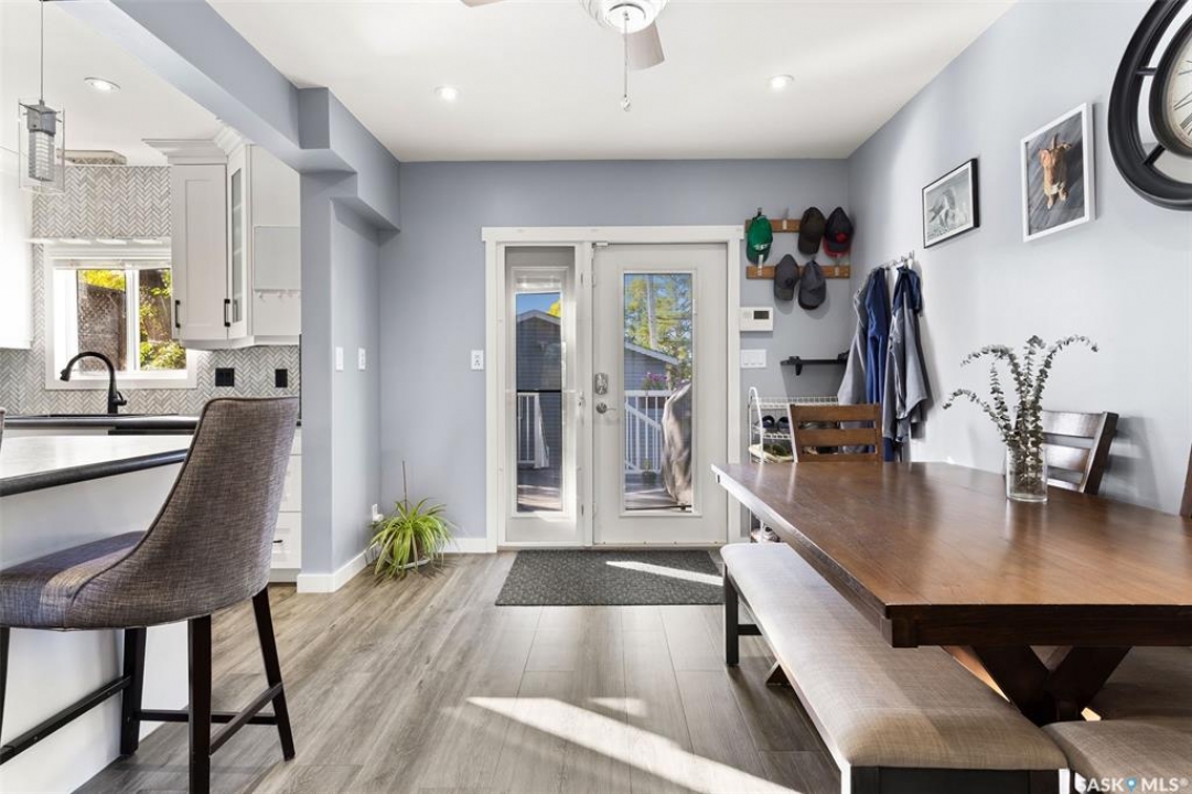 Nestled in the heart of the Historic Cathedral neighbourhood and perfectly positioned across from a lush green space, this charming and thoughtfully updated home blends character with modern convenience. Step into the bright, recently remodeled sunroom that faces the park—wired for electricity and built on screw piles—offering a cozy retreat with a view. The peninsula kitchen is a standout, featuring newer cupboards, crisp white cabinetry, a stylish herringbone tile backsplash, stainless steel appliances including a fridge with ice and water, and elegant pendant lighting. Throughout the home, you'll find all new fixtures, pot lights, fresh trims, and newer PVC windows that flood the space with natural light. Built-in speakers enhance the kitchen, dining area, and both upstairs bedrooms. The upper level hosts a spacious principal bedroom with a walk-in closet, a second bedroom, and a beautifully updated four-piece bath complete with a deep soaker tub and tile surround. Downstairs, the newly poured concrete slab is complemented by reinforced walls, and spray foam insulation throughout. The basement also features a new 100 amp panel with ample capacity, a laundry area, a cozy space ideal for a TV room, and a convenient two-piece bathroom. Outside, enjoy the expansive 14 x 20 composite deck with aluminum railing, a unique garden shed on the east side, and underground sprinklers in the backyard. The 22 x 26 heated and insulated garage, built in 2008 and finished with OSB, adds even more value, along with newer shingles on the house for peace of mind. This fine property is close to parks, bus routes, Mosaic Stadium and all Downtown amenities. Call your Relator for more information or personal tour.