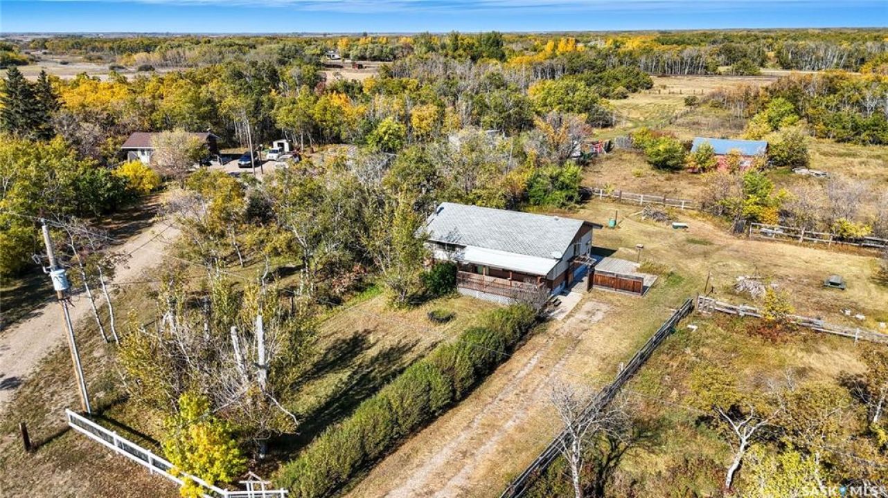 Don't miss out on this unique opportunity to own 4.6 acres less than 15 minutes west of Saskatoon! This bungalow is 1008 square feet with 3 beds + a den, and 2 bathrooms. This home may need some TLC, but its solid structure and spacious layout offer a good foundation for your dream renovation. Even diamonds start out a little rough! The main floor features a large living room adjacent to the kitchen and separated by a partition wall. This wall could potential be removed to create an open concept that totally revitalizes the space! There are three bedrooms on the main floor and a large 3 pc bathroom. The basement of the home is a literal blank canvas as you can see everything is white. Downstairs you'll find a large open living area - a den that could be used as a bedroom - and a 2 piece bathroom. The possibilities are endless with this place especially when you consider the yard that you're getting! Isn't that why you move to an acreage in the first place?! The yard has some established fences that could be used to contain a horse or two. The parcel is thick with trees and bush and invites exploration with adventure. There are already a few trails that wind through the property, but there's ample space to carve out new ones and make the land truly your own! The property is located walking distance from Sandy Ridge Gas Station which offers amenities and of course, delicious ice cream and fresh baking. This property is meant for someone, and that someone could be you! Don't hesitate, call your Realtor immediately and book a showing!