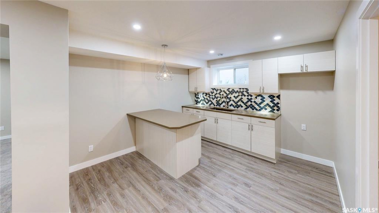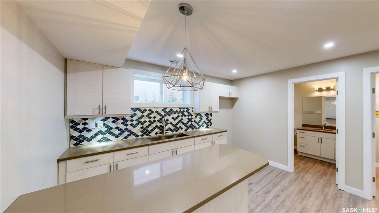 Welcome to your dream home! an elegant family home located in the vibrant Harbour Landing neighborhood. 2017 built, 2379 square foot, 5 bedroom 4 bathroom, 2 story house sits on a 40 x 115 rectangular lot. The front yard has a double concrete driveway that leads to the 24 x 24 heated and insulated double attached garage. The fully fenced backyard features a spacious deck, lush lawn, raised garden boxes, and a versatile patio area. Ideal for outdoor dining, entertaining, or evenings around a firepit. Upon entering, you are welcomed by a grand foyer embellished with an elegant chandelier, a coat closet, bench space, and convenient direct access to the garage. The main floor features a flexible first bedroom and a 4-piece bathroom, ideal for guests or as a home office. The heart of the home is the warm and inviting living room, accentuated by a striking brick feature wall, a cozy gas fireplace, and gleaming hardwood flooring. The adjoining kitchen includes an island with bar seating, a corner pantry, a modern tile backsplash, ample cupboard and drawer space, and sleek stainless steel appliances. The kitchen seamlessly transitions into the bright dining area, where three large windows frame serene views of the backyard, creating an ideal setting for family meals. On the upper level, the first stop is the 3-piece bathroom featuring a rainfall shower head, followed by a generously sized bedroom complete with its own closet. The luxurious primary suite offers a walk-in closet with built-in shelving and drawers, along with a spa-inspired 5-piece ensuite bathroom that includes a deep soaker tub, dual vanity, a spacious glass shower with a rainfall showerhead and storage space. A unique windowed nook within the primary bedroom provides a tranquil corner for reading or relaxation. The fully finished basement is designed as a private secondary suite with its own separate side entrance, making it perfect for multi-generational living or generating rental income.