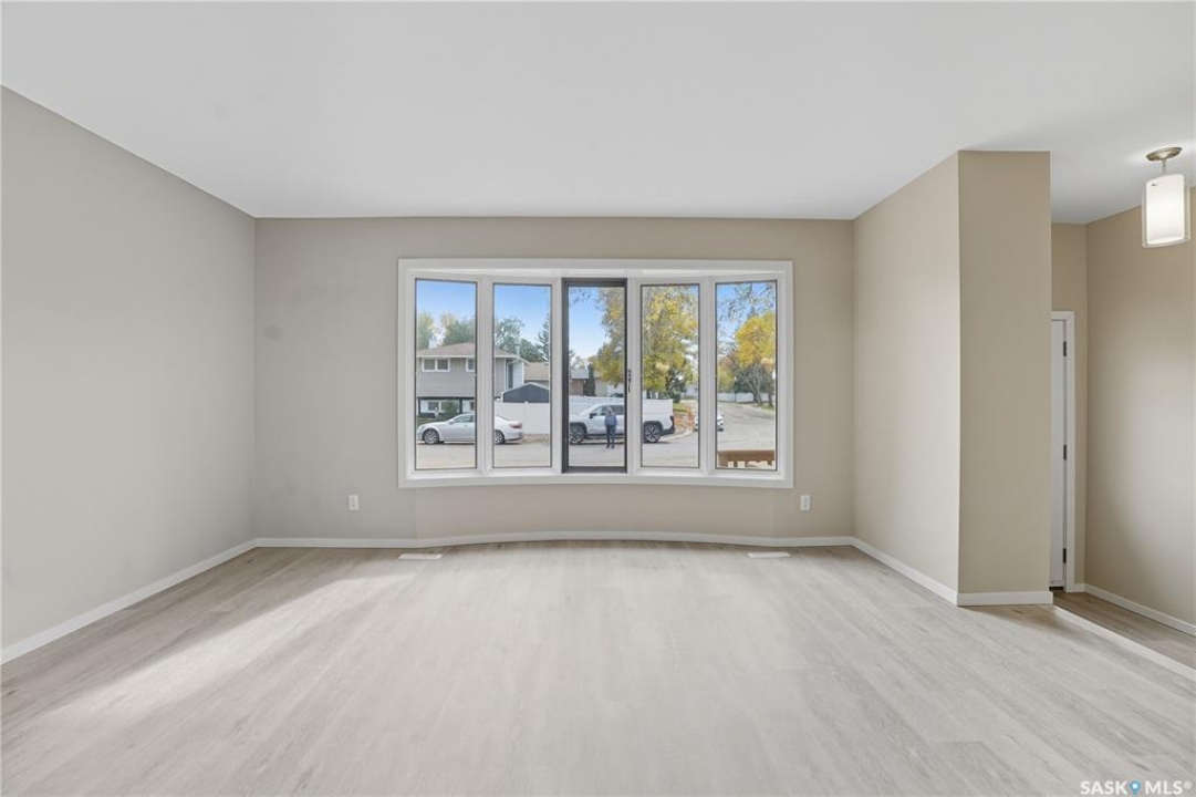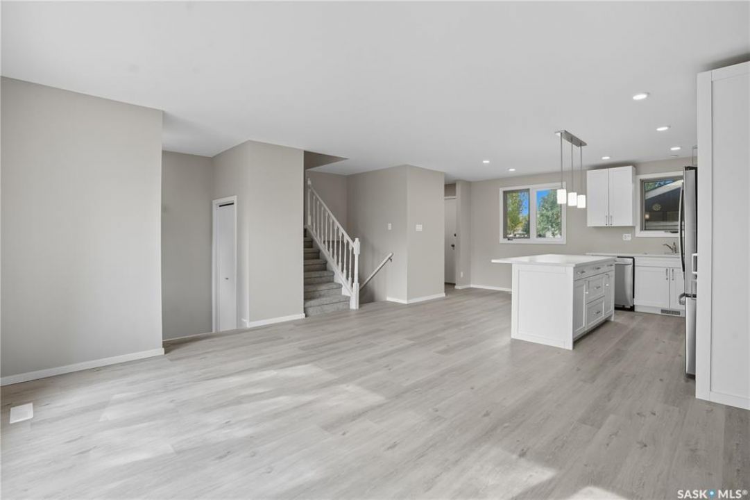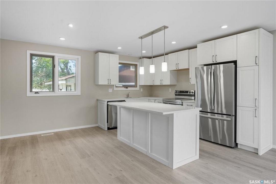 Welcome to this completely renovated 1,300 sq. ft. four-level split in Uplands, offering modern finishes, thoughtful design, and a prime location backing green space. The main floor features an inviting front foyer leading to a spacious living room with a bright bay window. The open-concept layout showcases stunning vinyl plank flooring throughout, with a beautifully updated kitchen at the heart of the home. Here you'll find a large island, white cabinetry with soft-close doors and drawers, quartz countertops, stainless steel appliances, and a pantry beside the fridge. The sink overlooks the backyard, while the dining area sits just off the kitchen, making it ideal for entertaining. Convenient main-floor laundry and direct yard access complete this level. Upstairs, the second level offers plush new carpeting, two comfortable bedrooms, and a stylish 4-piece bathroom with a tiled tub surround. The third level includes two more bedrooms with matching carpet and a convenient 2-piece bathroom. On the fourth level, you'll find the mechanical room and a spacious rec room perfect for family movie nights or a play area. Outside, the fully fenced backyard backs onto green space, offering extra privacy and room to enjoy. A single detached garage provides secure parking and additional storage. This move-in ready home combines modern updates with a functional family layout—all in a welcoming neighbourhood close to schools, parks, and amenities.