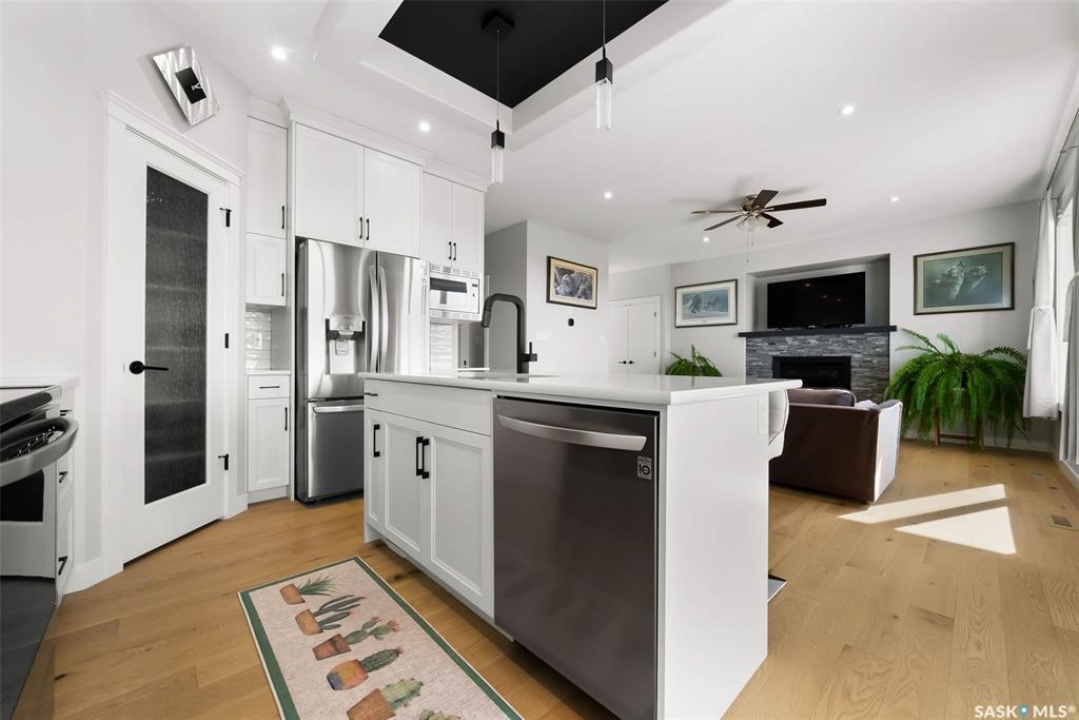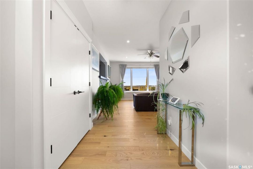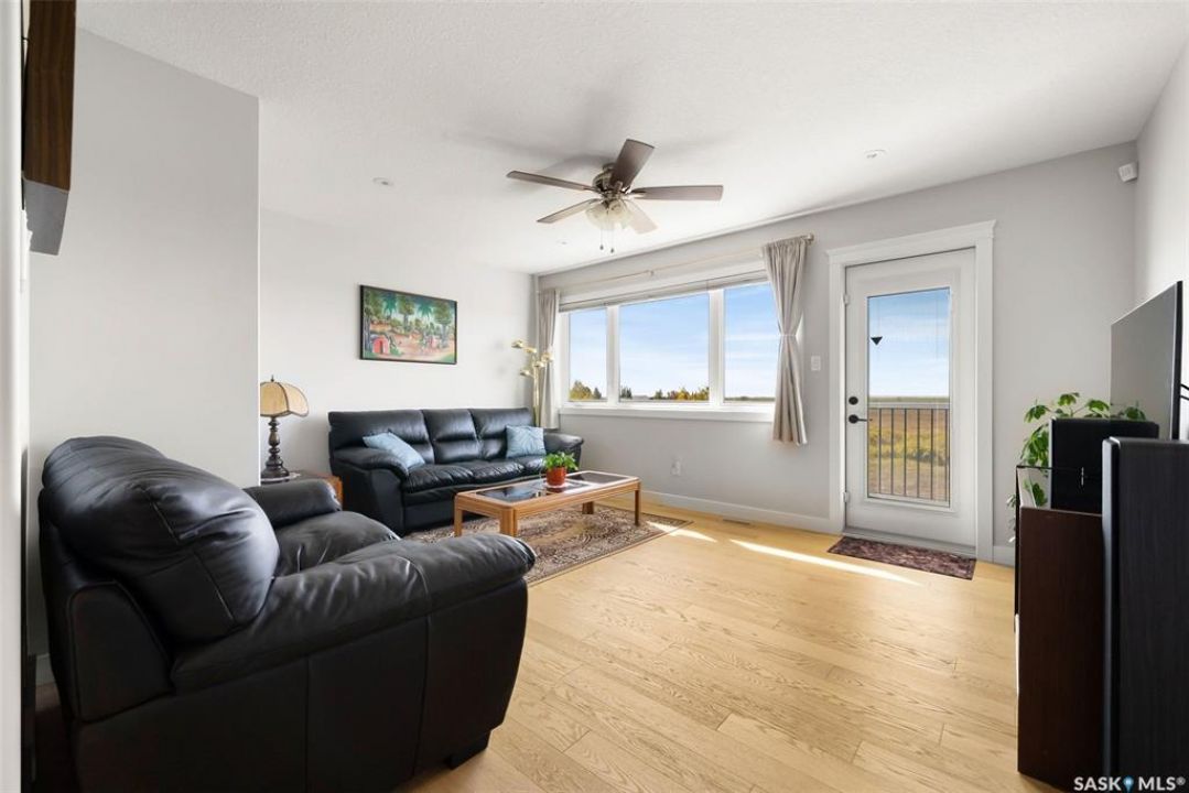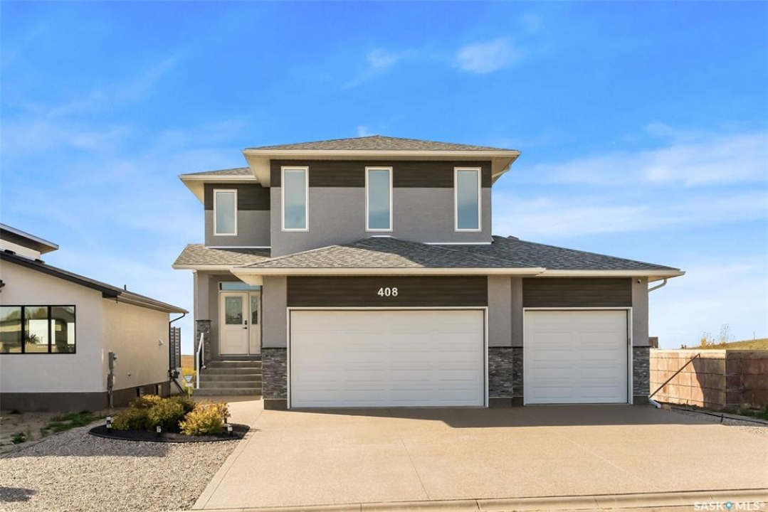Welcome to 408 Hillside Drive in Pilot Butte! Built in 2020, this impressive 2-storey home offers over 1,700 sq. ft. of thoughtfully designed living space plus a triple attached garage. With modern finishes, premium upgrades, and a prairie backdrop, it's the perfect blend of style, comfort, and functionality. The main floor showcases an open-concept layout with engineered hardwood flooring and 2x6 construction on 16” centers. A bright living room centers around a remote-controlled gas fireplace with stone surround, while oversized windows fitted with Hunter Douglas top-down/bottom-up blinds capture expansive views. The chef's kitchen boasts quartz countertops, custom cabinetry with under-cabinet lighting, subway tile backsplash, stainless steel appliances including a granite sink, a large island, and walk-in pantry. The dining area opens onto a spacious deck, ideal for entertaining, while a powder room and mudroom with laundry complete this level. Upstairs, the primary suite impresses with 10' ceilings, a walk-in closet, and spa-inspired ensuite with dual sinks and custom tiled shower. Two additional bedrooms, a full bath, and a bonus room with balcony access offer versatility for family living. The basement is open for development, with exterior walls spray-foamed and drywalled—ready for your personal touch. Notable upgrades include a whole-home water filtration system, surge protection, central A/C, on-demand hot water, and hot/cold water taps in the garage. Curb appeal shines with a fully insulated triple garage, exposed aggregate driveway, and beautifully landscaped yard. The backyard retreat features underground sprinklers, raised garden beds, lush lawn, a composite deck, and tiled patio backing green space—perfect for enjoying Saskatchewan sunsets. This home combines quality construction, thoughtful upgrades, and an unbeatable Pilot Butte location. Truly move-in ready for its next proud owner.