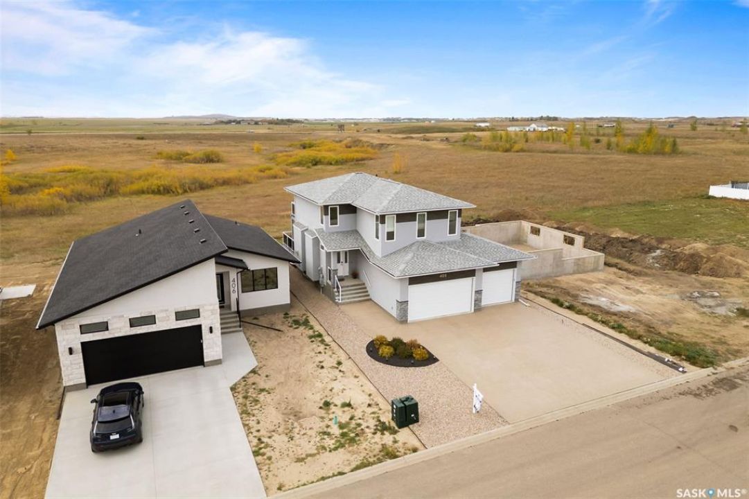 Welcome to 408 Hillside Drive in Pilot Butte! Built in 2020, this impressive 2-storey home offers over 1,700 sq. ft. of thoughtfully designed living space plus a triple attached garage. With modern finishes, premium upgrades, and a prairie backdrop, it's the perfect blend of style, comfort, and functionality. The main floor showcases an open-concept layout with engineered hardwood flooring and 2x6 construction on 16” centers. A bright living room centers around a remote-controlled gas fireplace with stone surround, while oversized windows fitted with Hunter Douglas top-down/bottom-up blinds capture expansive views. The chef's kitchen boasts quartz countertops, custom cabinetry with under-cabinet lighting, subway tile backsplash, stainless steel appliances including a granite sink, a large island, and walk-in pantry. The dining area opens onto a spacious deck, ideal for entertaining, while a powder room and mudroom with laundry complete this level. Upstairs, the primary suite impresses with 10' ceilings, a walk-in closet, and spa-inspired ensuite with dual sinks and custom tiled shower. Two additional bedrooms, a full bath, and a bonus room with balcony access offer versatility for family living. The basement is open for development, with exterior walls spray-foamed and drywalled—ready for your personal touch. Notable upgrades include a whole-home water filtration system, surge protection, central A/C, on-demand hot water, and hot/cold water taps in the garage. Curb appeal shines with a fully insulated triple garage, exposed aggregate driveway, and beautifully landscaped yard. The backyard retreat features underground sprinklers, raised garden beds, lush lawn, a composite deck, and tiled patio backing green space—perfect for enjoying Saskatchewan sunsets. This home combines quality construction, thoughtful upgrades, and an unbeatable Pilot Butte location. Truly move-in ready for its next proud owner. NOTE: 2 outdoor cameras are NOT included