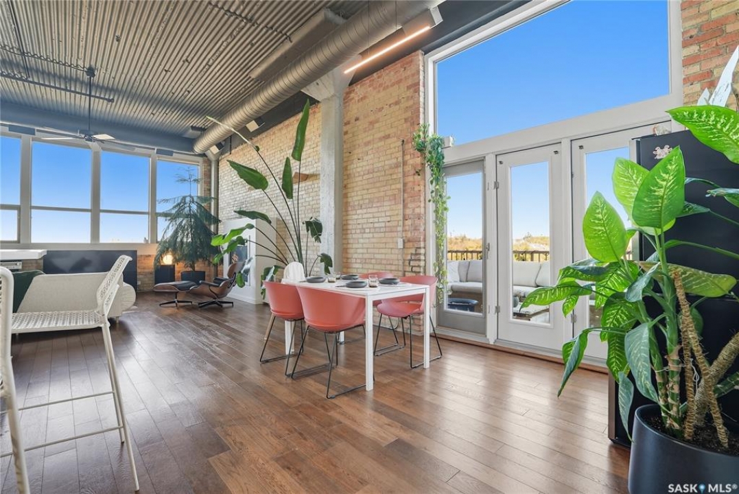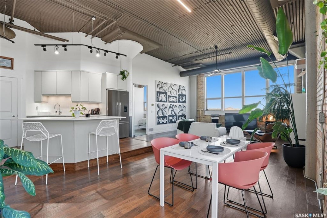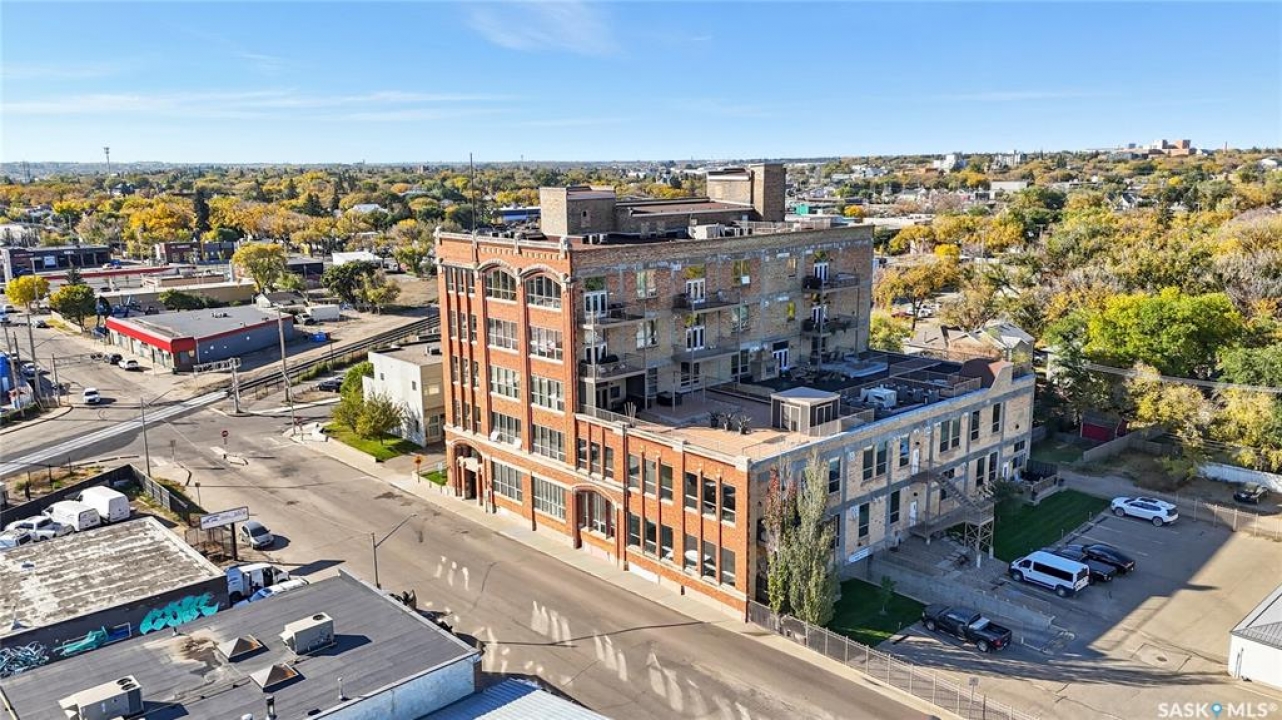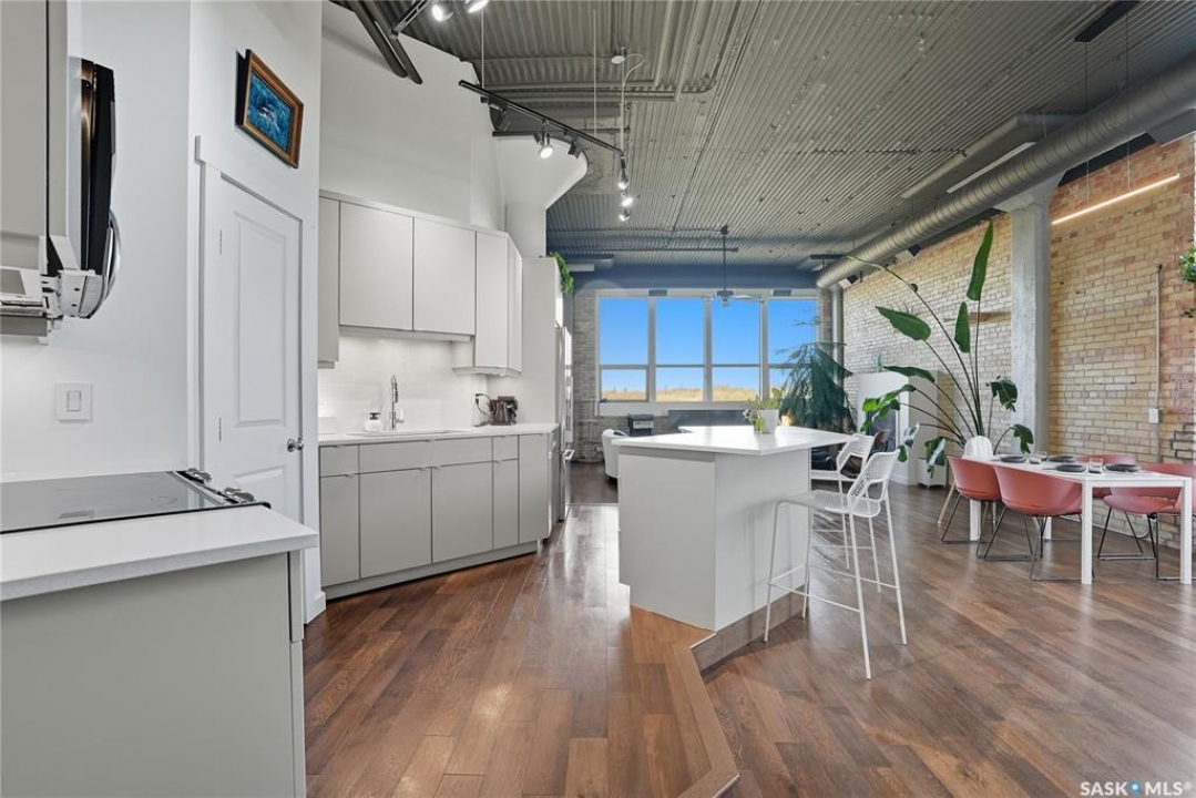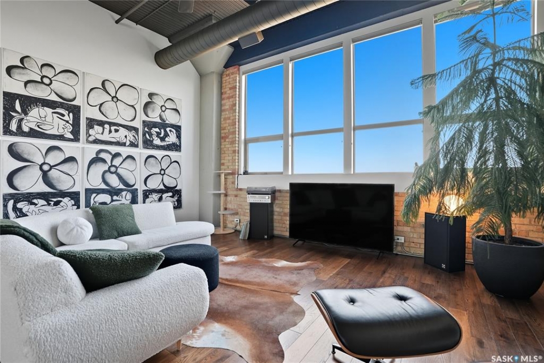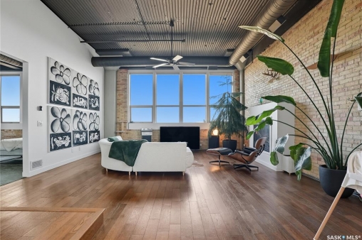 Welcome to the historic T. Eaton Building. This top-floor loft features soaring ceilings, original brickwork, and an open-concept design. A spacious entrance welcomes you in and teases your eye to the main living area. The elevated kitchen showcases upgraded cabinetry, counter tops, and a tile backsplash with a minimalist design. From day to day meals to entertaining your friends and family - you will find a seamless flow here from kitchen to dining. The dining area lends access to the balcony above the trees; relax on the built-in seating or tend to the BBQ - all while taking in the scenery around. Inside you will find engineered flooring that compliments the brick while connecting you through a thoughtful layout. The living room looks west over an unobstructed skyline view and welcomes the evening light in - illuminating the backdrop for your art. Here you can unwind with your favourite record and the cozy warmth of the gas fireplace. The primary retreat is adjacent - a large room with a simplistic flow. The recently renovated en-suite blends seamlessly with floor to ceiling glass - creating privacy and an airiness. There is an additional closet space here and walk-in closet nook around the corner too! The secondary bedroom is also spacious with a 4 piece bathroom nearby. Laundry is found in the utility room along with high-efficiency mechanical including central A/C and HRV for added comfort. Other notable features include; Hunter Douglas blinds, 1 large U/G parking stall, 2 storage lockers and building amenities with: secure fob access, elevator, rooftop terrace, exercise room, and security gates to the out door parking area with space for visitor parking. A rare opportunity to own one of the most unique lofts in Saskatoon! Don't hesitate to book a showing on this iconic home.