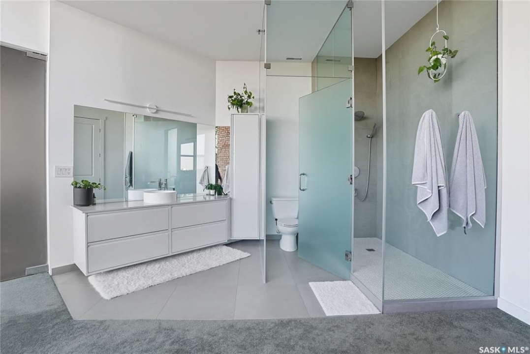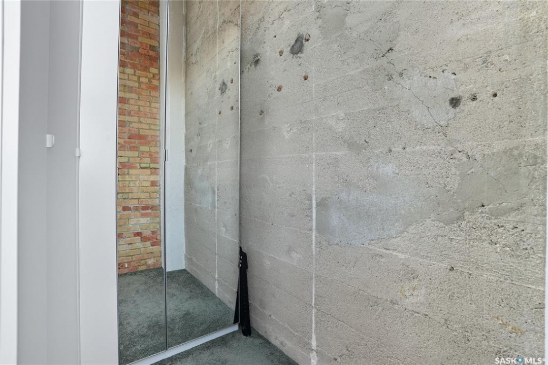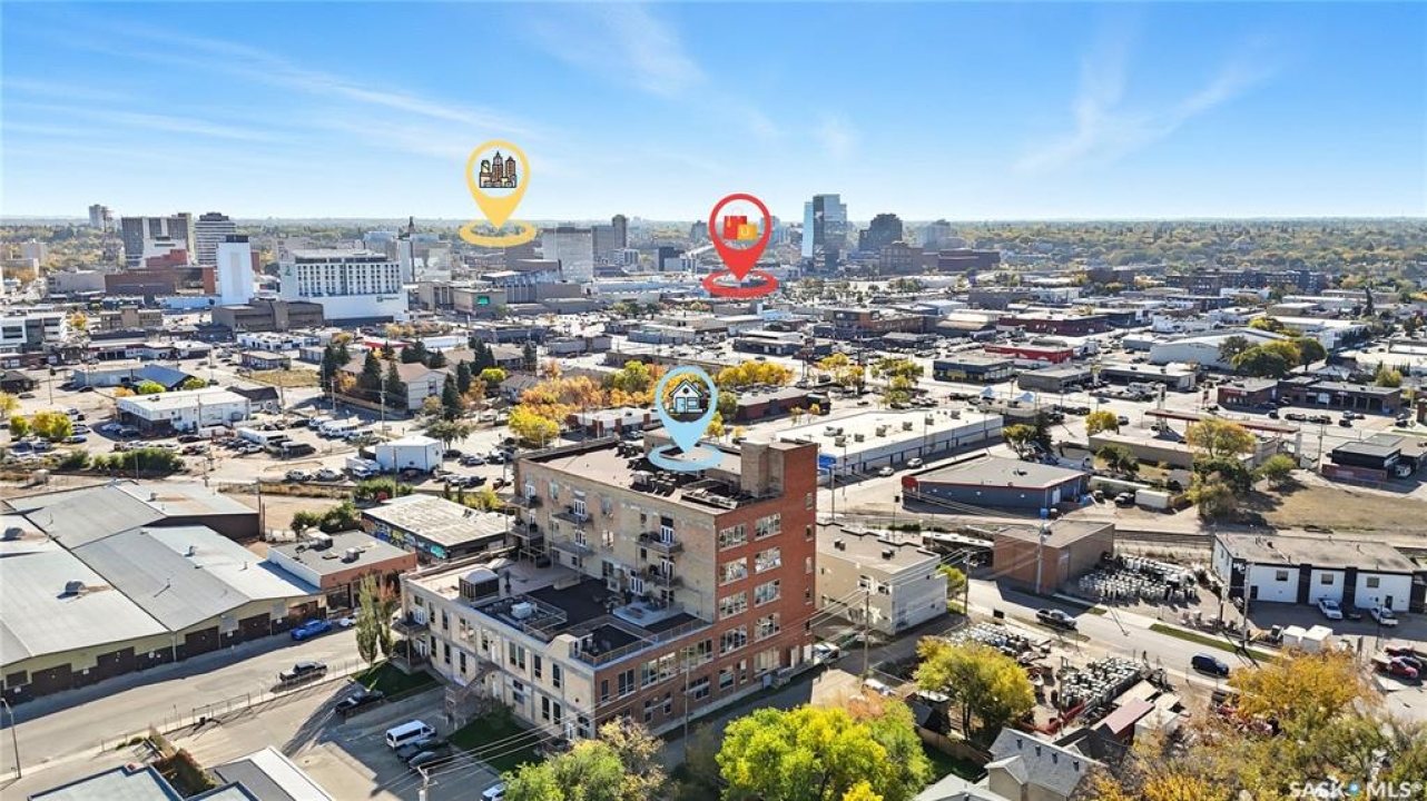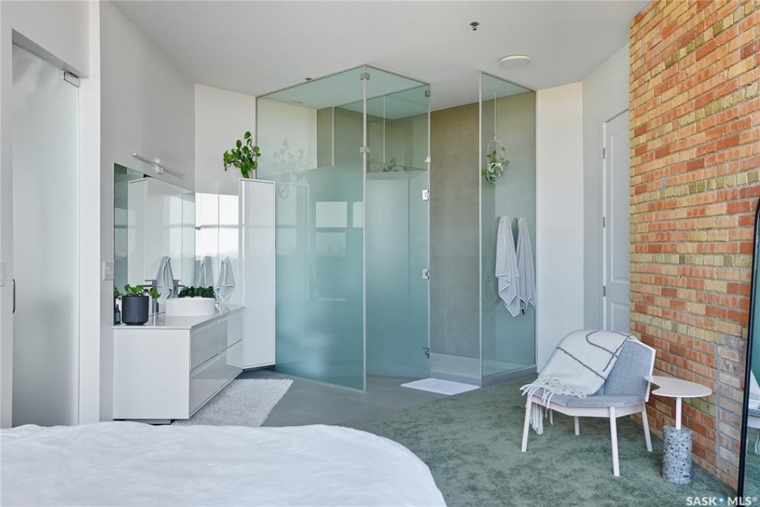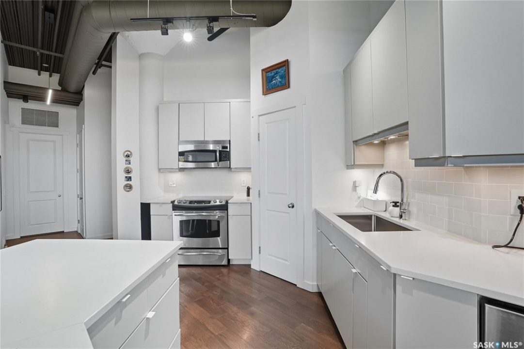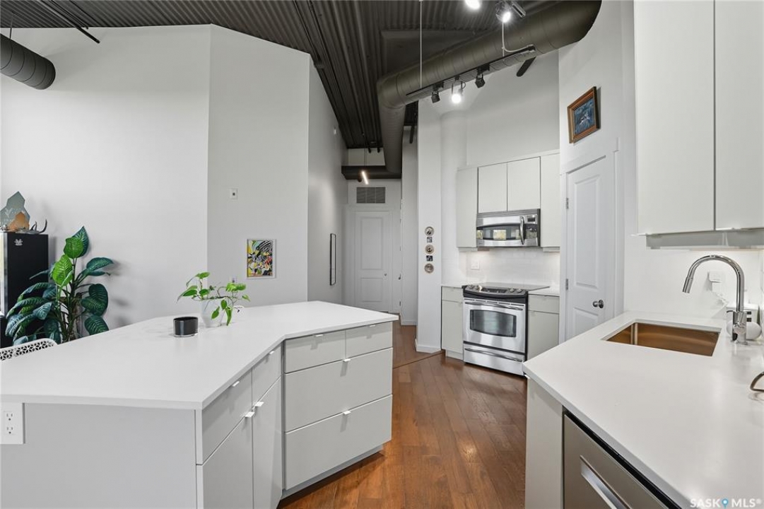 Welcome to the historic T. Eaton Building. This top-floor loft features soaring ceilings, original brickwork, and an open-concept design. A spacious entrance welcomes you in and teases your eye to the main living area. The elevated kitchen showcases upgraded cabinetry, counter tops, and a tile backsplash with a minimalist design. From day to day meals to entertaining your friends and family - you will find a seamless flow here from kitchen to dining. The dining area lends access to the balcony above the trees; relax on the built-in seating or tend to the BBQ - all while taking in the scenery around. Inside you will find engineered flooring that compliments the brick while connecting you through a thoughtful layout. The living room looks west over an unobstructed skyline view and welcomes the evening light in - illuminating the backdrop for your art. Here you can unwind with your favourite record and the cozy warmth of the gas fireplace. The primary retreat is adjacent - a large room with a simplistic flow. The recently renovated en-suite blends seamlessly with floor to ceiling glass - creating privacy and an airiness. There is an additional closet space here and walk-in closet nook around the corner too! The secondary bedroom is also spacious with a 4 piece bathroom nearby. Laundry is found in the utility room along with high-efficiency mechanical including central A/C and HRV for added comfort. Other notable features include; Hunter Douglas blinds, 1 large U/G parking stall, 2 storage lockers and building amenities with: secure fob access, elevator, rooftop terrace, exercise room, and security gates to the out door parking area with space for visitor parking. A rare opportunity to own one of the most unique lofts in Saskatoon! Don't hesitate to book a showing on this iconic home.