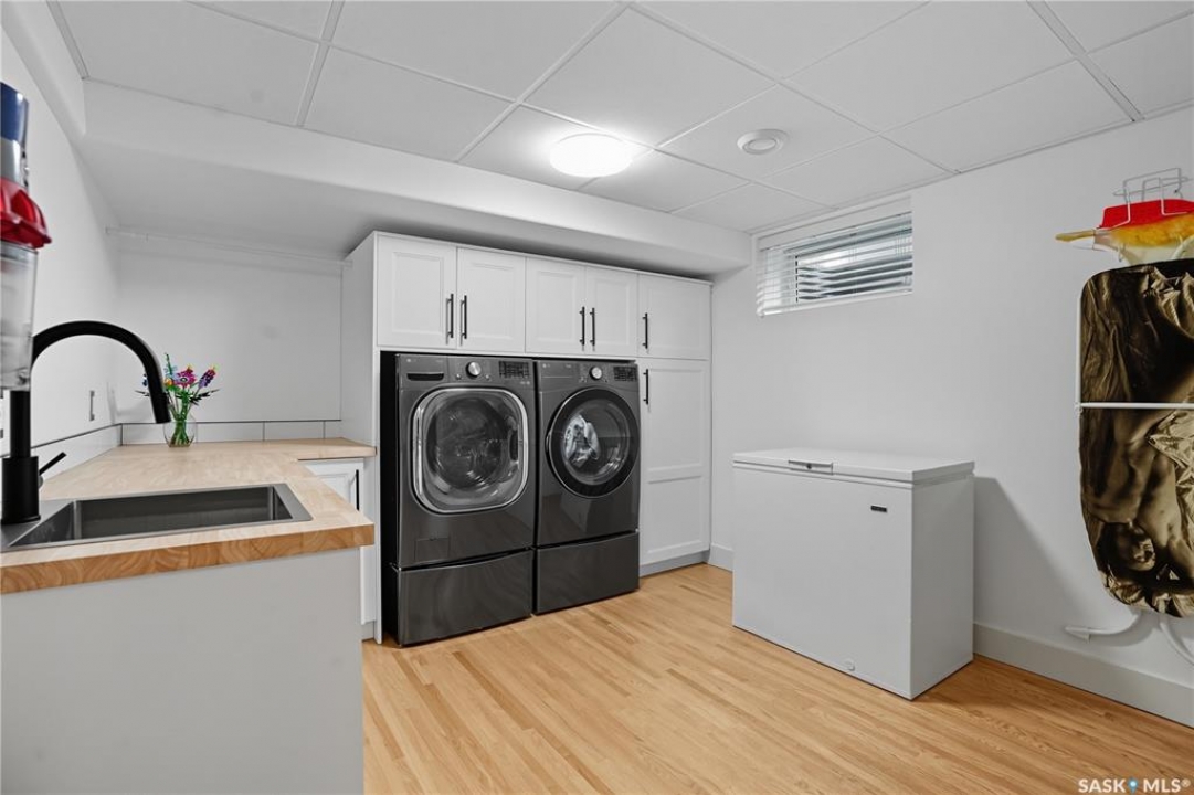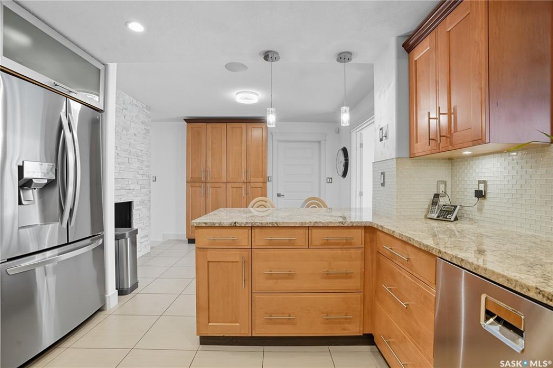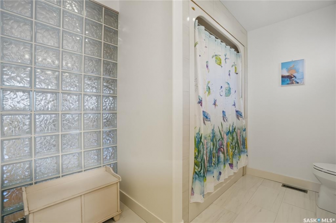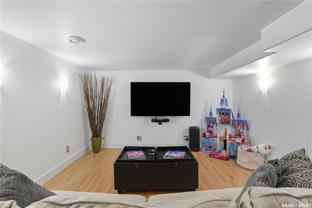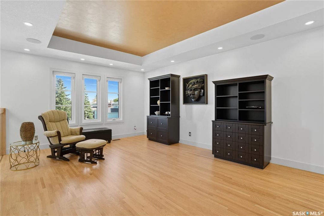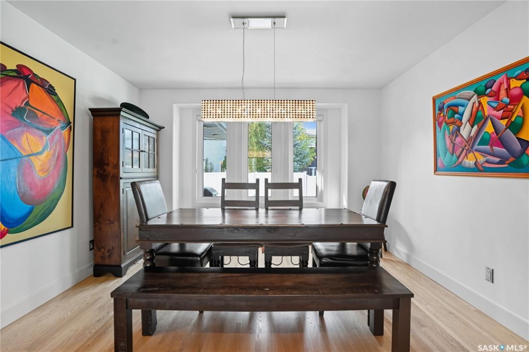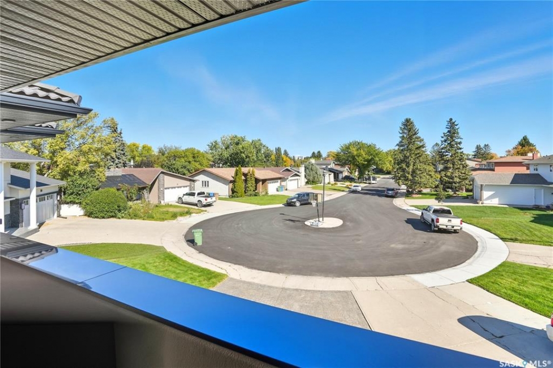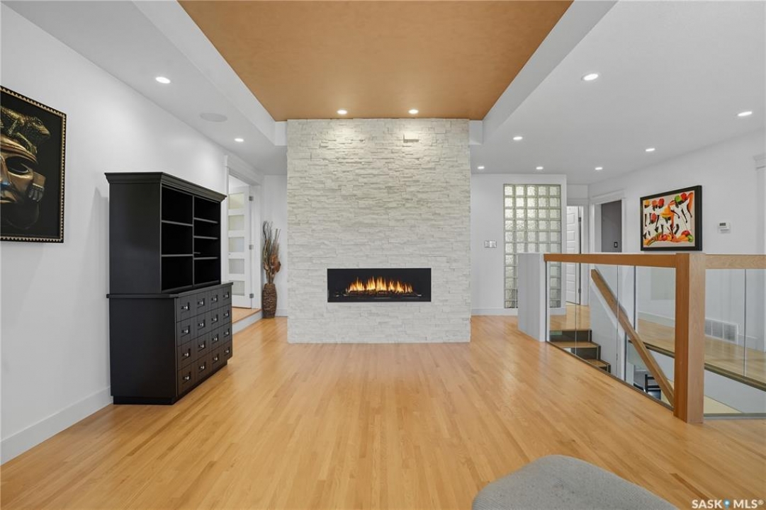 Welcome to 34 Leslie Place, a quiet bay in Regina's desirable Albert Park. This extensively renovated home blends elegance, comfort, and functionality—ready for immediate enjoyment. The grand entryway opens to a sunken living room with a 2-way gas fireplace and white quartz surround, a central wood-tile staircase, family room, and formal dining area overlooking the backyard. Custom hardwood floors flow throughout. The kitchen features warm wood cabinetry, granite countertops, tile flooring, double stainless sinks, a fireplace, and a cozy breakfast nook. A 2-piece bath and office/den with private entrance—currently a salon—complete the main floor. Upstairs, a bonus room overlooks a crystal chandelier and highlights custom woodwork, a gas fireplace, coffered ceiling, pot lights, and built-in sound. The luxurious 5-piece bath offers double sinks, glass block accents, and a seating area. The spacious primary suite includes two private balconies, dual closets (including built-in shoe storage), and a spa-like ensuite with soaker tub, walk-in shower, and water closet. Three additional bedrooms complete the upper level. The finished basement features a soundproof entertainment room, bedroom, 3-piece bath, and laundry with sink and cabinetry. Outside, enjoy a fully landscaped corner lot with stone/stucco exterior, wood accents, custom lighting, and double drive. The PVC-fenced backyard includes a covered deck wired for sound, stone patio, and heated double garage with epoxy floors and aluminum/glass door. Value-added features: built on piles, exterior EIFS envelope, tile roofing system, natural gas BBQ hookup, central A/C, Control4 system, alarm, 200-amp panel, sewer backflow valve, HRV, hi-eff furnaces with humidifiers, and more. All drawings and improvement details available. A rare find in a prime location—call your agent today.