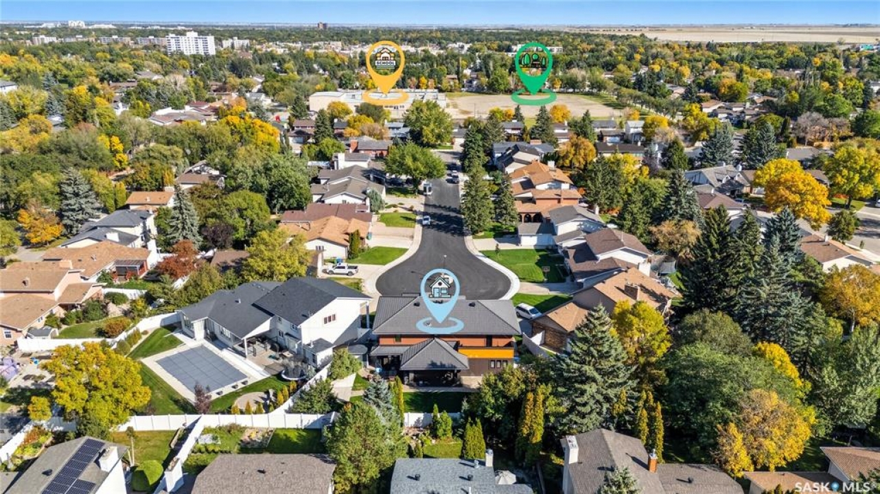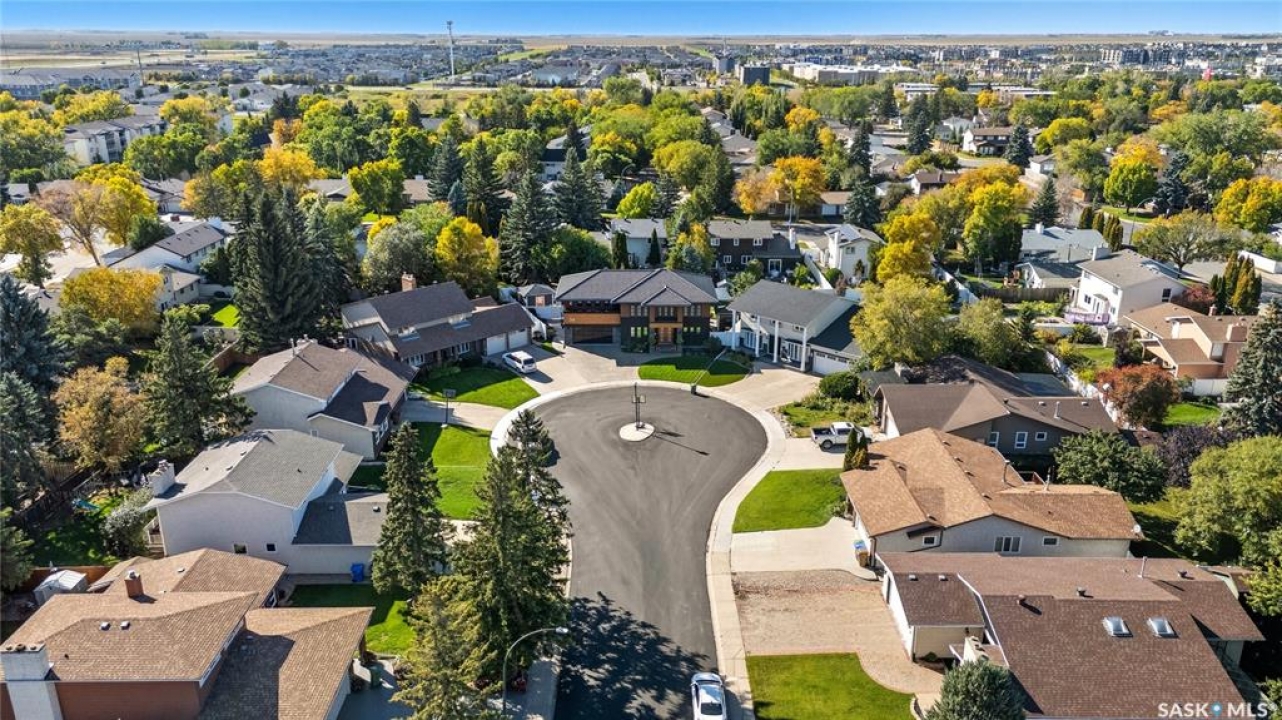 Welcome to 34 Leslie Place, a quiet bay in Regina's desirable Albert Park. This extensively renovated home blends elegance, comfort, and functionality—ready for immediate enjoyment. The grand entryway opens to a sunken living room with a 2-way gas fireplace and white quartz surround, a central wood-tile staircase, family room, and formal dining area overlooking the backyard. Custom hardwood floors flow throughout. The kitchen features warm wood cabinetry, granite countertops, tile flooring, double stainless sinks, a fireplace, and a cozy breakfast nook. A 2-piece bath and office/den with private entrance—currently a salon—complete the main floor. Upstairs, a bonus room overlooks a crystal chandelier and highlights custom woodwork, a gas fireplace, coffered ceiling, pot lights, and built-in sound. The luxurious 5-piece bath offers double sinks, glass block accents, and a seating area. The spacious primary suite includes two private balconies, dual closets (including built-in shoe storage), and a spa-like ensuite with soaker tub, walk-in shower, and water closet. Three additional bedrooms complete the upper level. The finished basement features a soundproof entertainment room, bedroom, 3-piece bath, and laundry with sink and cabinetry. Outside, enjoy a fully landscaped corner lot with stone/stucco exterior, wood accents, custom lighting, and double drive. The attached heated double garage features epoxy flooring, a custom aluminum and glass overhead door, and ample storage space. The PVC-fenced backyard includes a private, covered deck with lighting, and a stone patio. Value-added features: built on piles, exterior EIFS envelope, tile roofing system, natural gas BBQ hookup, central A/C, Control4 system, alarm, 200-amp panel, sewer backflow valve, HRV, hi-eff furnaces with humidifiers, and more. All drawings and improvement details available. A rare find in a prime location—call your agent today.