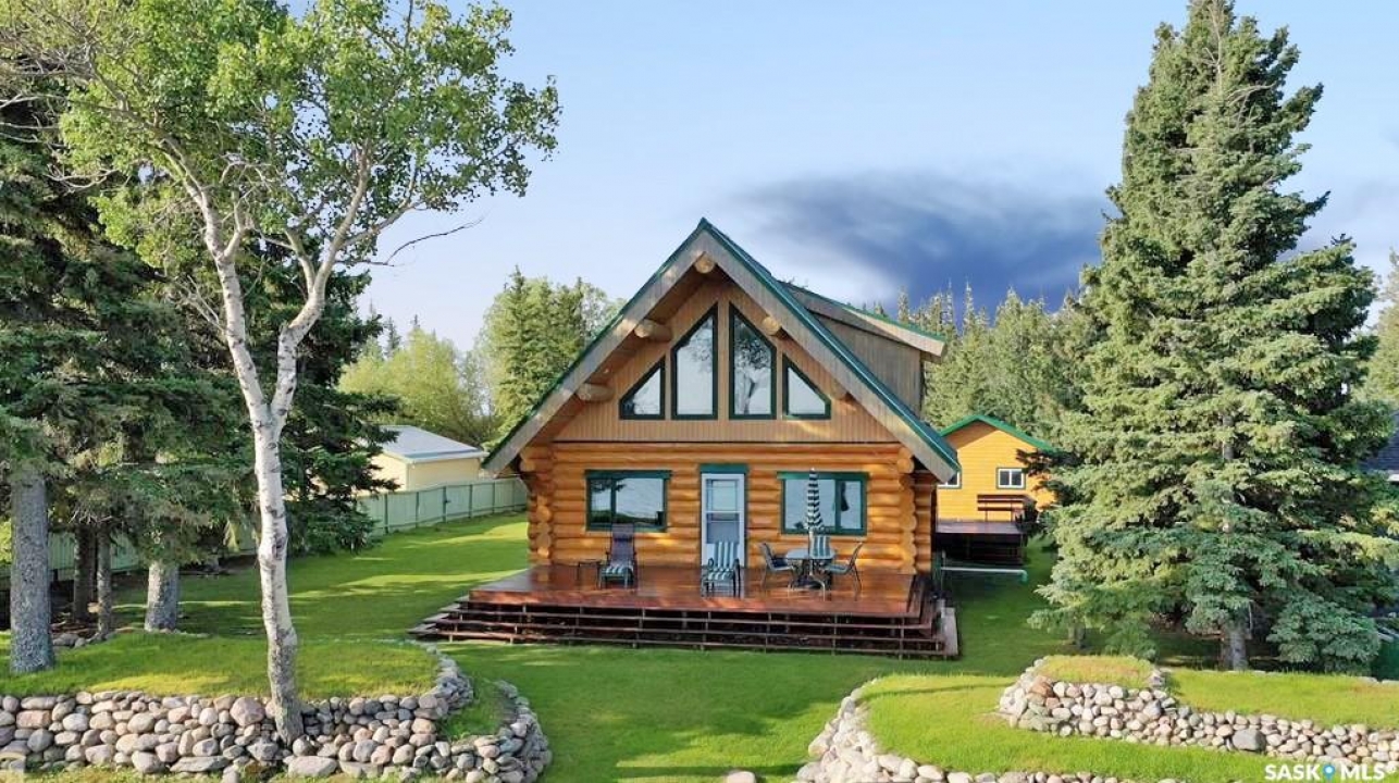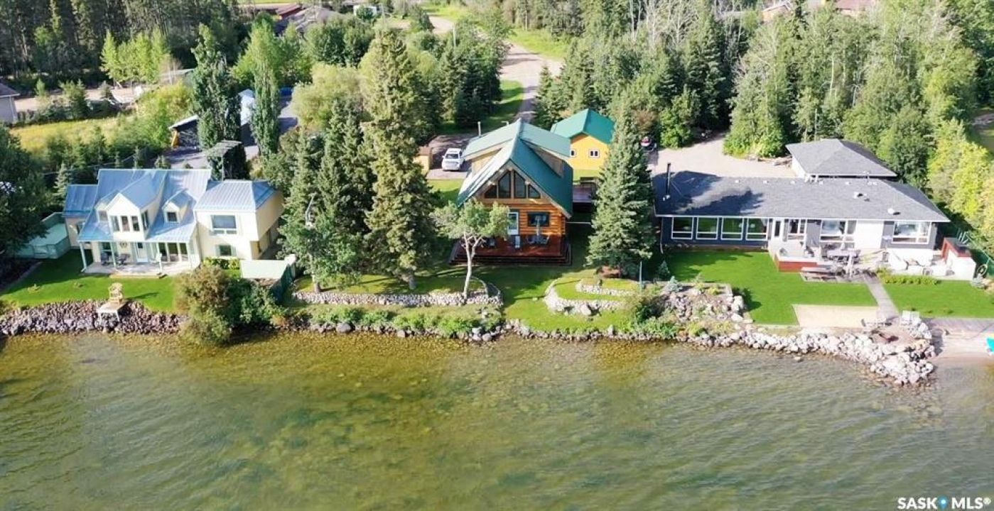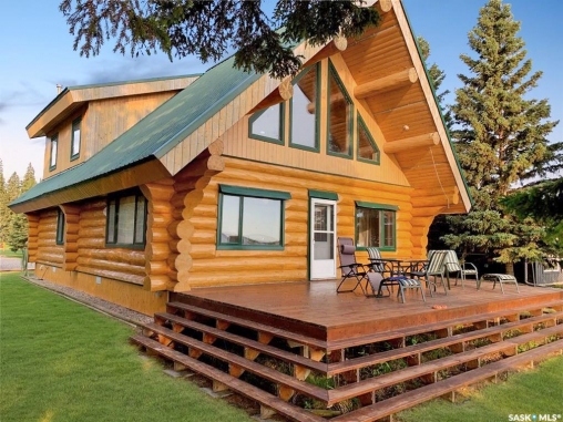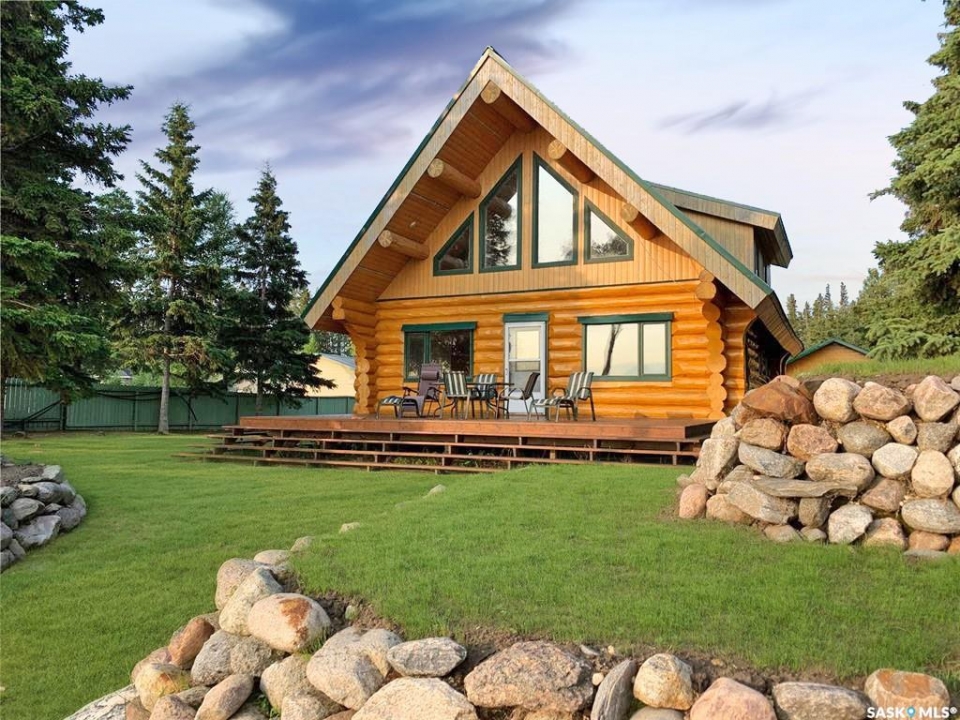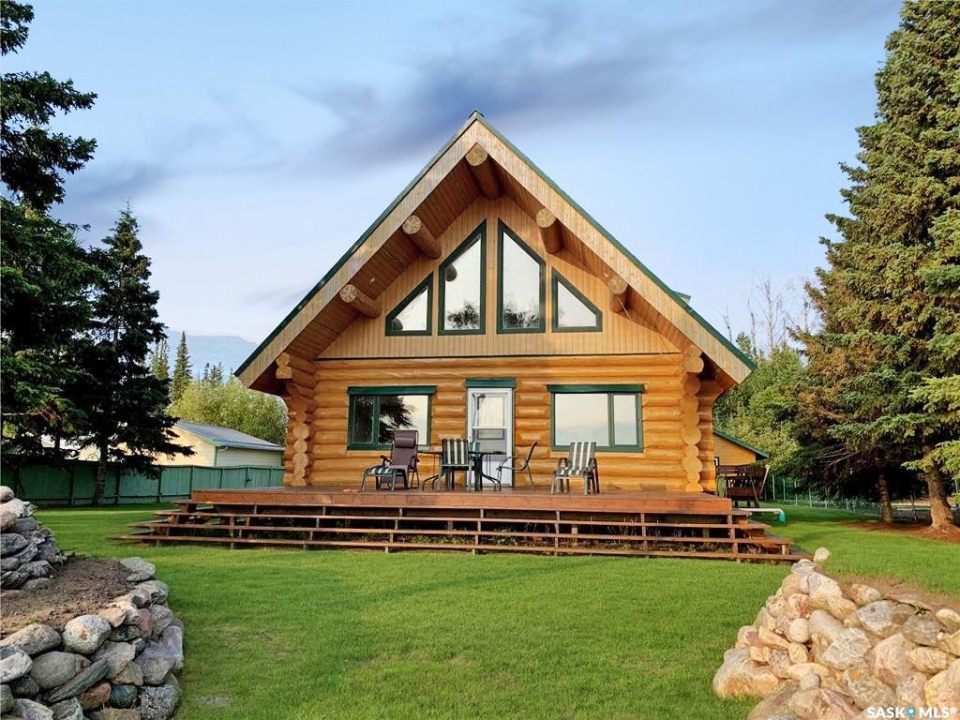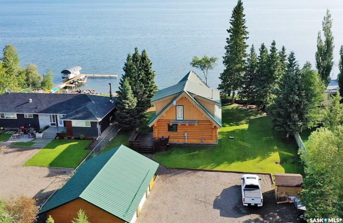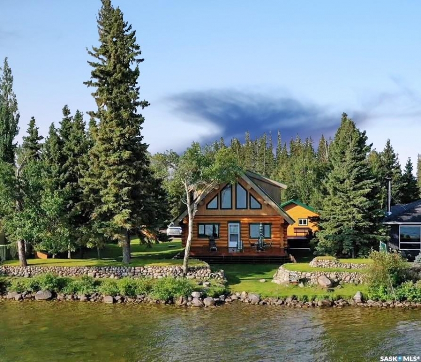Dream Lakefront. Handcraft Log home situated on west shore of Candle Lake. This dream spot owns to the water edge and offers 90' of water frontage. The lot itself is 300'X90' (0.62acres) private, partially fenced and wonderfully landscaped. The maintained yard and house provides everything your looking for in a lakefront property. 1680sqft storey 1/2 features completely ope loft (20'X26) currently used as a huge master bedroom with 3pc ensuite and office nook...all with a great view of the water. The cust built log stair case opens to open concept living room, dinning room, with post & beam vaulted ceilings, providing lot of great natura light and maximizing your view. Bright open kitchen offers lots of cupboard space, island/breakfast nook, gas range all showcasing th waterfront. Main floor features another nice size bedroom, utility room, mudroom/porch and 3pc bathroom. Large back deck with ber and NG BBQ hook up. The front door open onto a lakefront oversized deck, taking full advantage of the morning sunrise. For all your there is a oversized detached double garage (24'X34'). The yard has plenty of room for additional waterview garage/loft. Well & Sept triple pane window throughout, come check out the value of this gorgeous lakefront property. Dock & Lift Permit transferable.