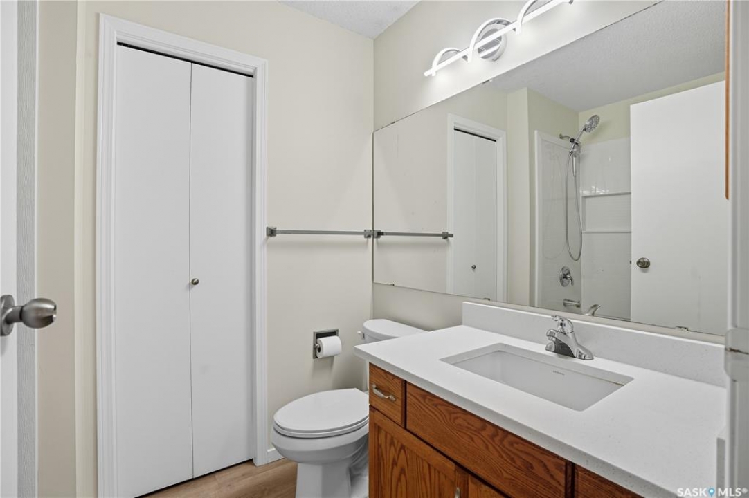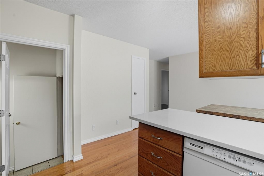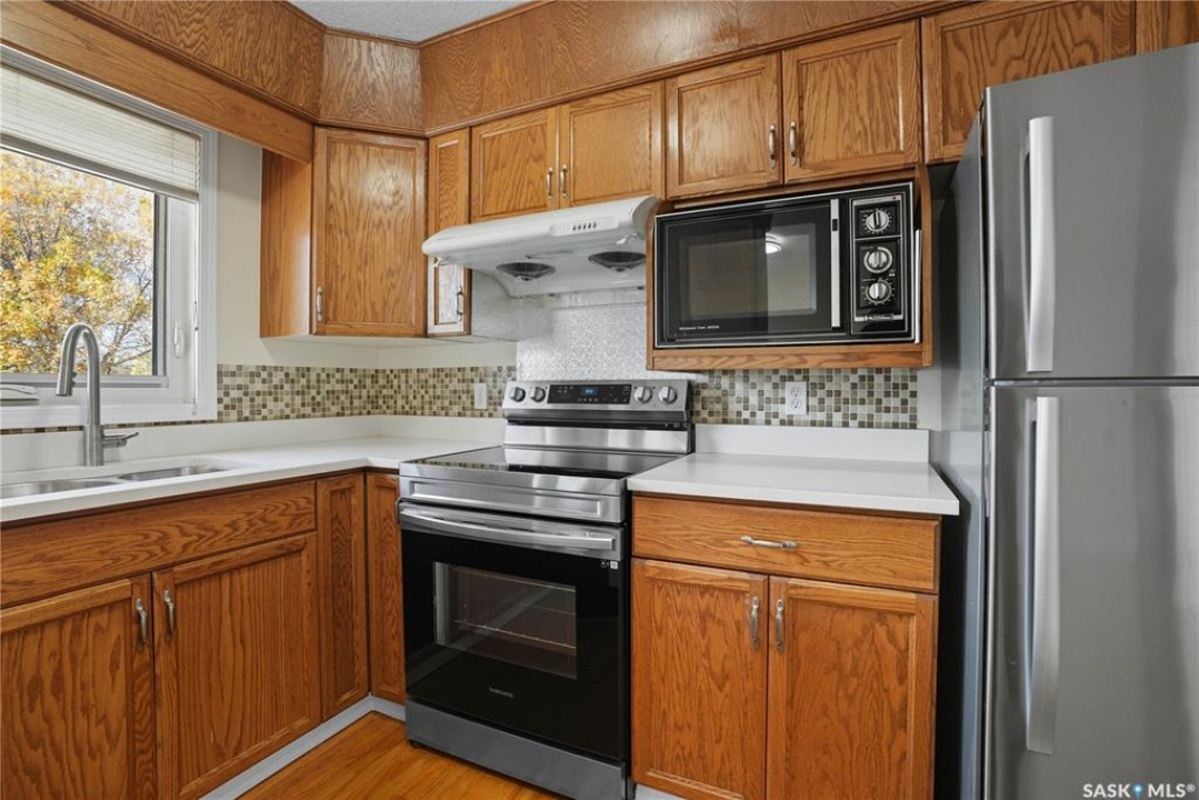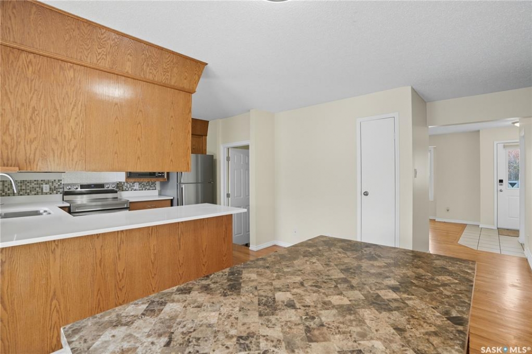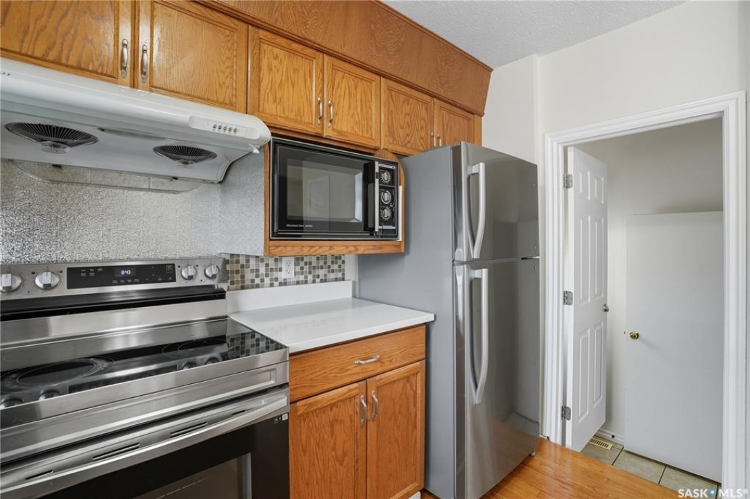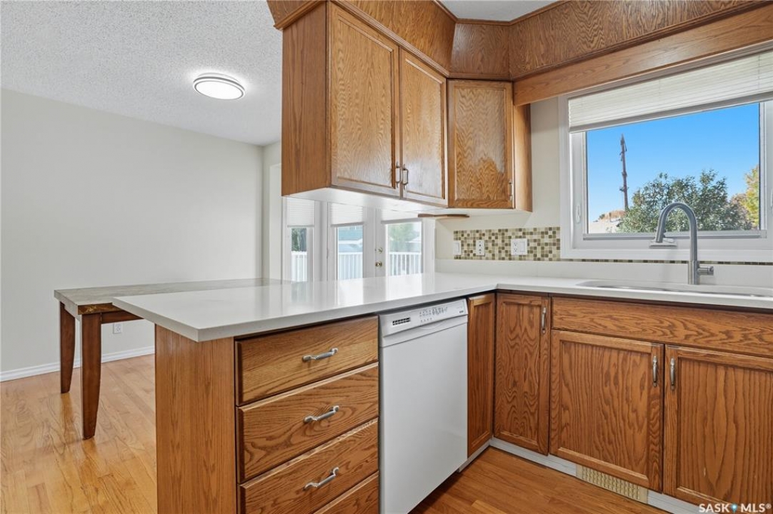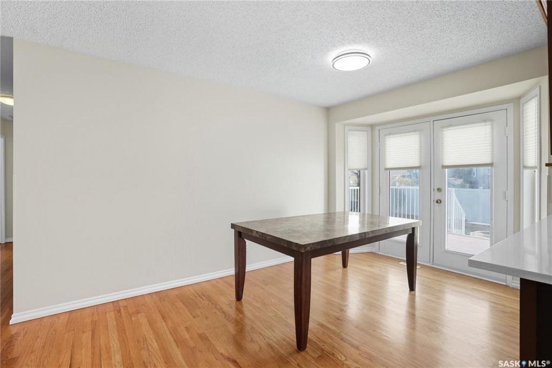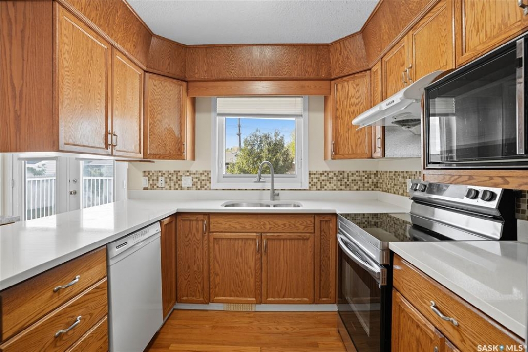 Welcome to 102 Bonli Crescent, a beautifully updated bungalow in the sought-after Erindale neighbourhood, known for its excellent schools, parks, and convenient amenities. Set on a corner lot, the home features classic brick and vinyl siding, a fully insulated double attached garage, and a landscaped front lawn with underground sprinklers. Inside, the main floor feels warm and bright with hardwood floors in the living and dining areas. The kitchen blends charm and practicality with golden oak cabinets, quartz countertops (2023), tile backsplash, a sink overlooking the backyard, hood vented outside, and appliances including stove (2023), built-in oven, fridge (2023), dishwasher, and microwave. Three main-floor bedrooms have new carpet, while the bathrooms are refreshed—a four-piece with new vinyl plank, golden oak vanity with quartz countertop, linen pantry, and new bathtub with new tile surround, and a three-piece en-suite with new vinyl plank and matching oak vanity. The basement, with a separate entry, offers great potential for income or extended family use. It includes a family room, two bedrooms, a four-piece bath, a storage room, and a utility room with laundry, mid-efficiency furnace, central AC, 40-gallon boiler, central vac, and 100A service. A second kitchen, complete with a stove, fridge, and hood vented outdoors, adds flexibility and value. The backyard is fully fenced with two newly replaced vinyl sides, a deck, underground sprinklers, a concrete pad, shed, and fire pit area for outdoor enjoyment. Recent updates include fresh paint throughout, new baseboards, repainted doors, LED light fixtures, and new flooring in bedrooms and bathrooms. Located near Dr. John G. Egnatoff School, Father Robinson Catholic School, Centennial Collegiate, and University Heights Square, with the Saskatoon Forestry Farm Park & Zoo nearby, this move-in-ready home offers comfort, functionality, and investment appeal in the desirable Erindale area.