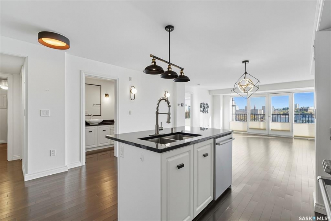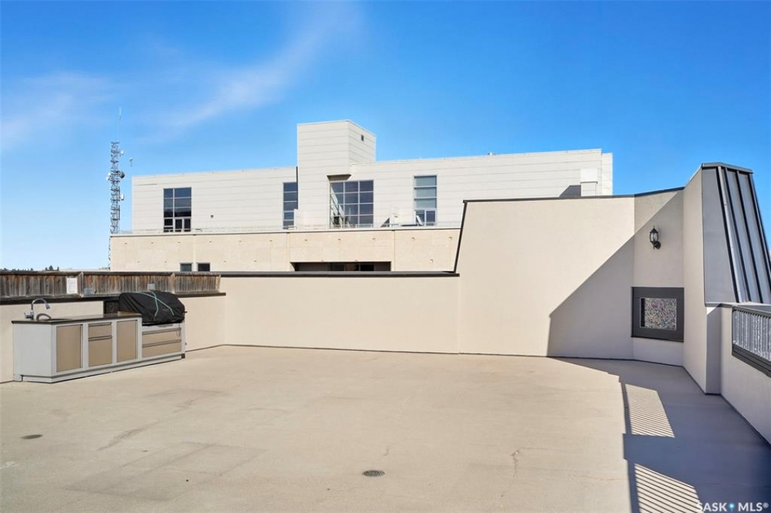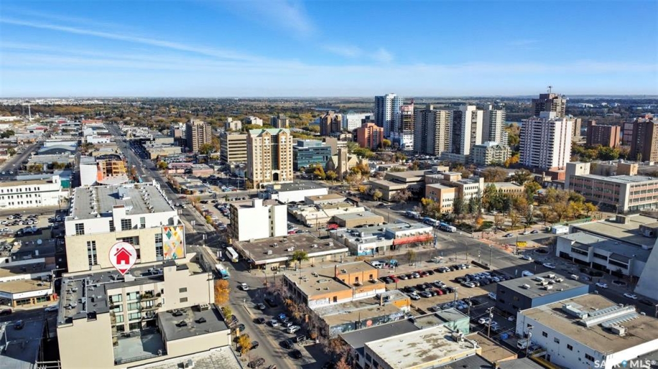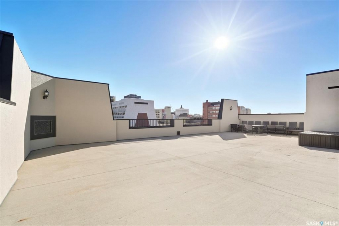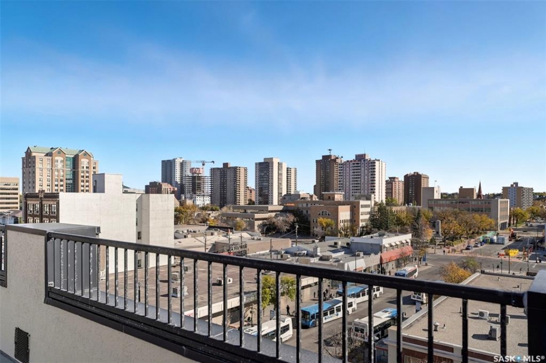 A Rare Opportunity to Own a Piece of Saskatoon's History! Welcome to The Residences at the King George — an iconic landmark originally built in 1911 and fully restored by Meridian Development in 2010. Reconstructed from its original concrete frame with all modern materials and mechanical systems, this award-winning building showcases a transitional French design that blends heritage and modern luxury. Historic details such as the original chandeliers, lobby monogrammed keystone, and ornate black powder-coated stair railings have been beautifully preserved. This stunning top floor corner unit offers a perfect mix of elegance, comfort, and security in the heart of downtown Saskatoon — steps from restaurants, shops, services, and nightlife. The high-security building features video surveillance and coded/fob access at all entry points. Inside, enjoy newer engineered hardwood flooring, floor-to-ceiling windows, and an East-facing balcony with city views. The designer kitchen includes granite countertops, ceiling-height cabinetry, large island with seating, dual undermount sinks, wine fridge, under-cabinet lighting, garburator, and premium appliances — including a GE Café induction range and Bosch dishwasher. Additional upgrades include modern lighting and hardware, Hunter Douglas blinds, Lutron Caseta smart lighting and smart thermostat.The luxurious bathrooms feature black granite tile flooring and oversized vanities. The spacious primary bedroom offers vaulted ceilings, a skylight, and custom built-in closets. Other highlights include in-suite laundry, central air, two heated underground parking stalls, and an 11' x 7' storage unit with street-style bike racks. Residents enjoy access to a beautiful rooftop patio with elevator service to the fifth floor and parkade — perfect for entertaining. All of this, just four blocks from the river!