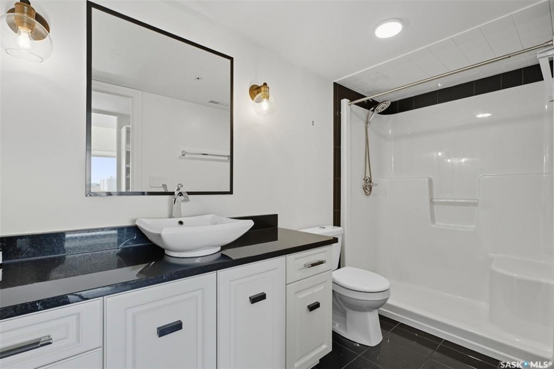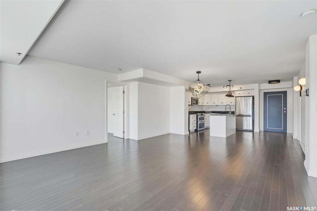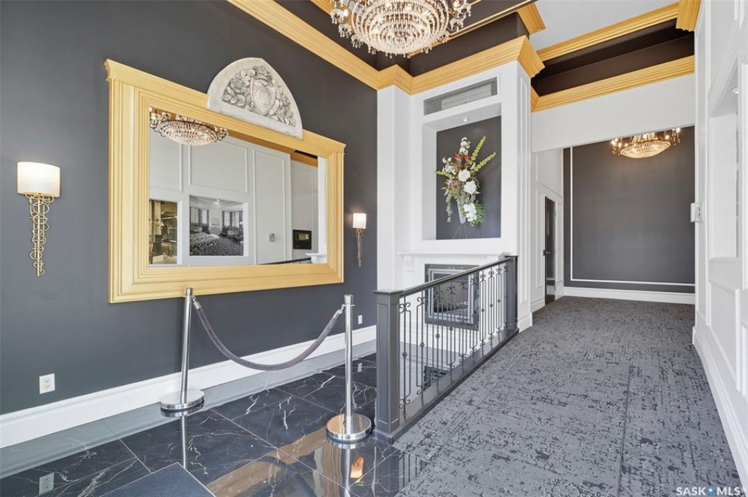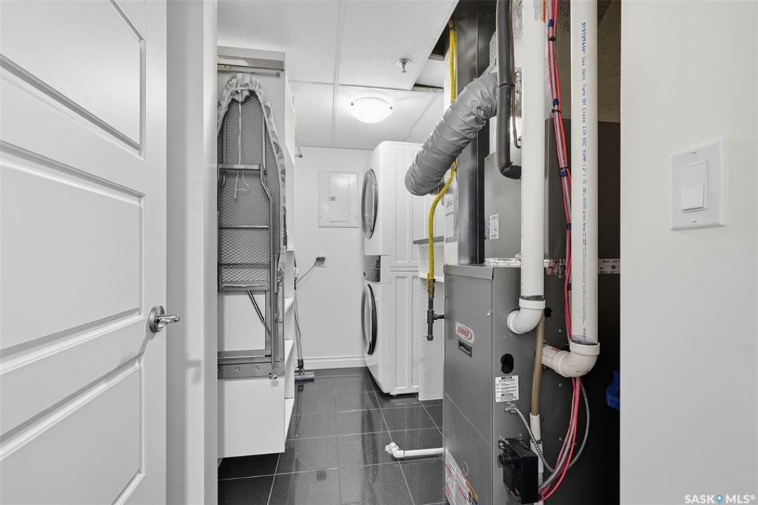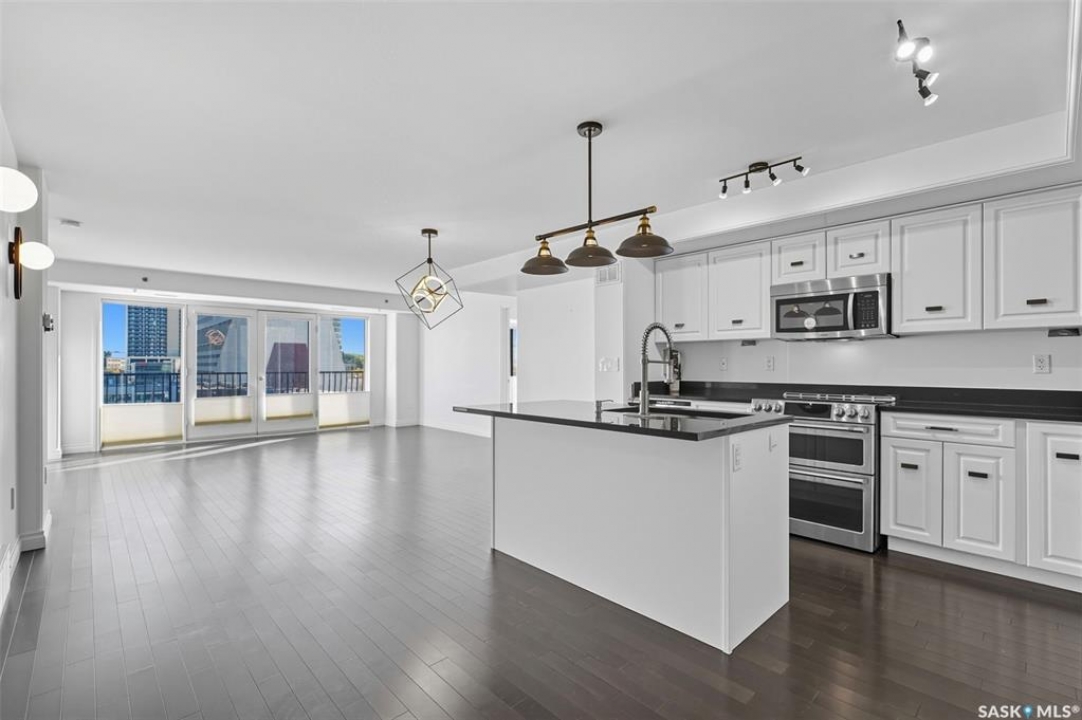 A Rare Opportunity to Own a Piece of Saskatoon's History! Welcome to The Residences at the King George — an iconic landmark originally built in 1911 and fully restored by Meridian Development in 2010. Reconstructed from its original concrete frame with all modern materials and mechanical systems, this award-winning building showcases a transitional French design that blends heritage and modern luxury. Historic details such as the original chandeliers, lobby monogrammed keystone, and ornate black powder-coated stair railings have been beautifully preserved. This stunning top floor corner unit offers a perfect mix of elegance, comfort, and security in the heart of downtown Saskatoon — steps from restaurants, shops, services, and nightlife. The high-security building features video surveillance and coded/fob access at all entry points. Inside, enjoy newer engineered hardwood flooring, floor-to-ceiling windows, and an East-facing balcony with city views. The designer kitchen includes granite countertops, ceiling-height cabinetry, large island with seating, dual undermount sinks, wine fridge, under-cabinet lighting, garburator, and premium appliances — including a GE Café induction range and Bosch dishwasher. Additional upgrades include modern lighting and hardware, Hunter Douglas blinds, Lutron Caseta smart lighting and smart thermostat.The luxurious bathrooms feature black granite tile flooring and oversized vanities. The spacious primary bedroom offers vaulted ceilings, a skylight, and custom built-in closets. Other highlights include in-suite laundry, central air, two heated underground parking stalls, and an 11' x 7' storage unit with street-style bike racks. Residents enjoy access to a beautiful rooftop patio with elevator service to the fifth floor and parkade — perfect for entertaining. All of this, just four blocks from the river!