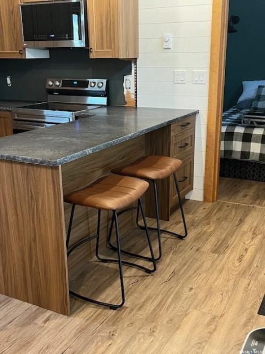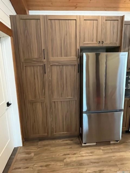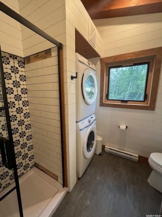 You don't have to buy an old "fixer upper" to be able to afford a home at the lake! Brand new low footprint option that's efficient and affordable! Smaller bedroom, combined bathroom and utility leaves spacious kitchen and living room. South facing deck just above the trees backing Wakaw Lake Golf Course.Included is a brand new double garage with full cement floor and remote openers. Just off the lake private and quiet!