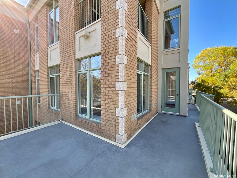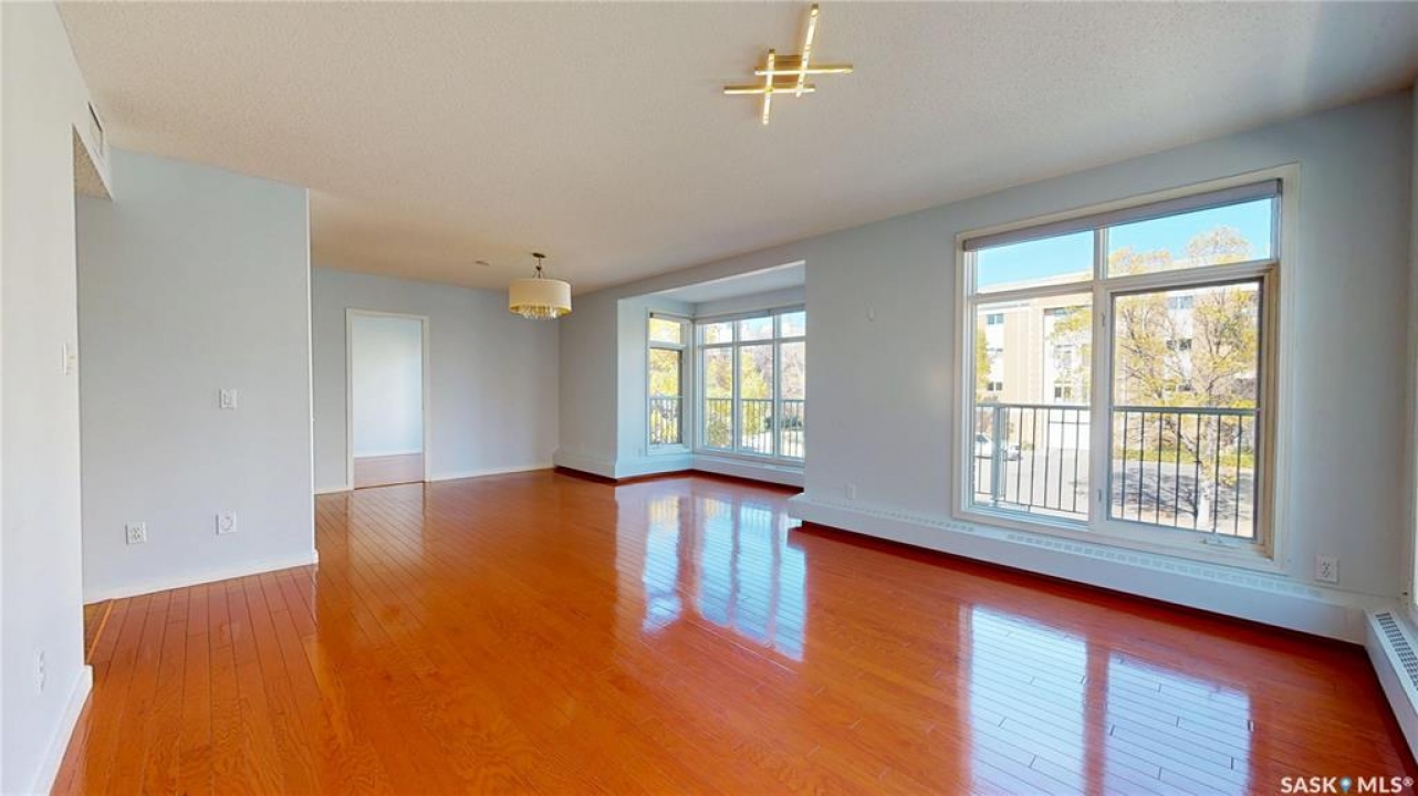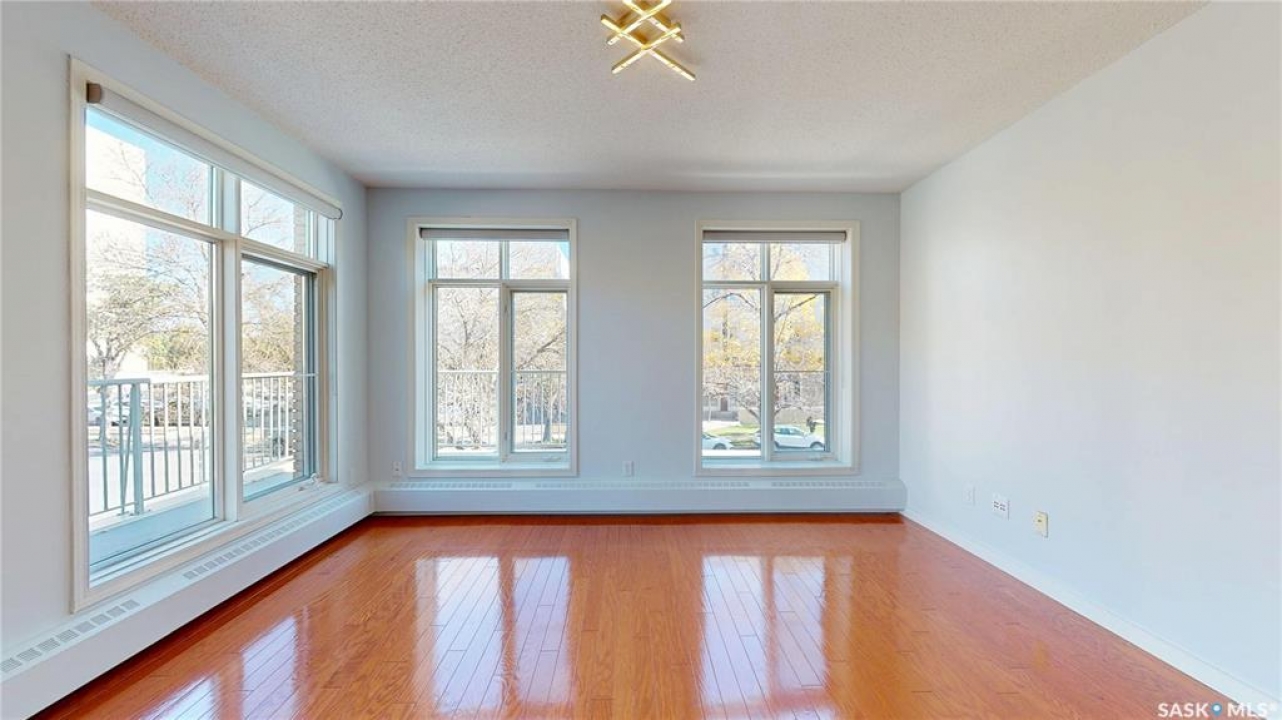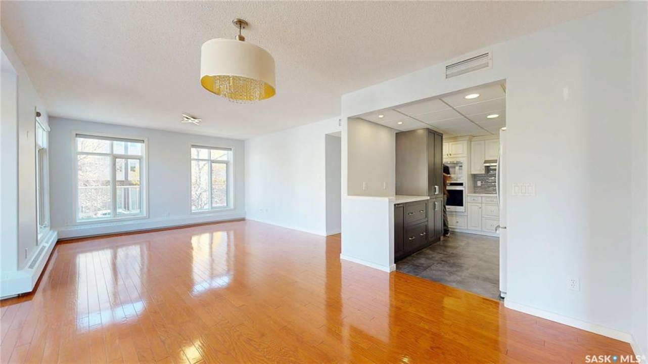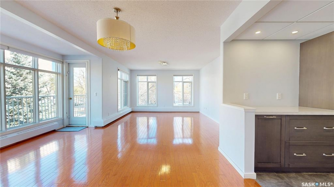 Experience the perfect blend of location and lifestyle in this sun-filled corner condo at prestigious College Gardens. Set directly across from Wascana Park, this concrete-core residence provides exceptional privacy, soundproofing, and peace of mind, with convenient access to downtown, the University of Regina, the airport and the natural beauty of Regina's most cherished park. This desirable corner unit features a wrap-around deck with north and east exposures—ideal for enjoying morning light. Inside, a spacious foyer welcomes you into a beautifully updated kitchen showcasing crisp white cabinetry, quartz countertops, a built-in oven, smooth cooktop, double sink, and coordinating white appliances. The open-concept living and dining areas are bright and inviting, framed by expansive windows that fill the home with natural light. The primary suite offers a private three-piece ensuite and a generous walk-in closet, while the second bedroom is conveniently located across from the four-piece main bathroom. Just off the dining area, a versatile room serves perfectly as a home office, craft space, or additional guest room—offering flexibility to suit your lifestyle. The in-suite laundry room, with storage, adds everyday practicality. Completing this exceptional home is plenty of visitor parking on the north side of the building and a heated underground parking space with a large private storage room—ideal for a small workspace or extra storage needs. With its solid construction, prime location, and timeless design, this impressive condo offers the rare opportunity to live in comfort and style just steps from Wascana Park. Enjoy the convenience of nearby downtown amenities, scenic walking paths, and all from the peaceful setting of College Gardens. A rare opportunity not to be missed—book your private showing today.